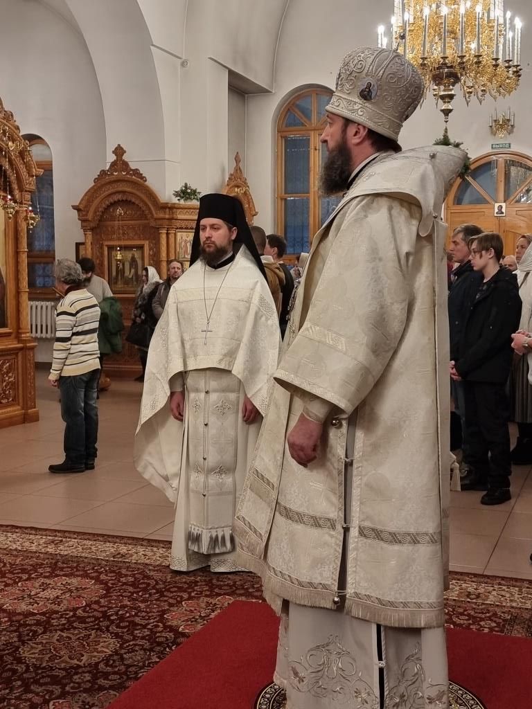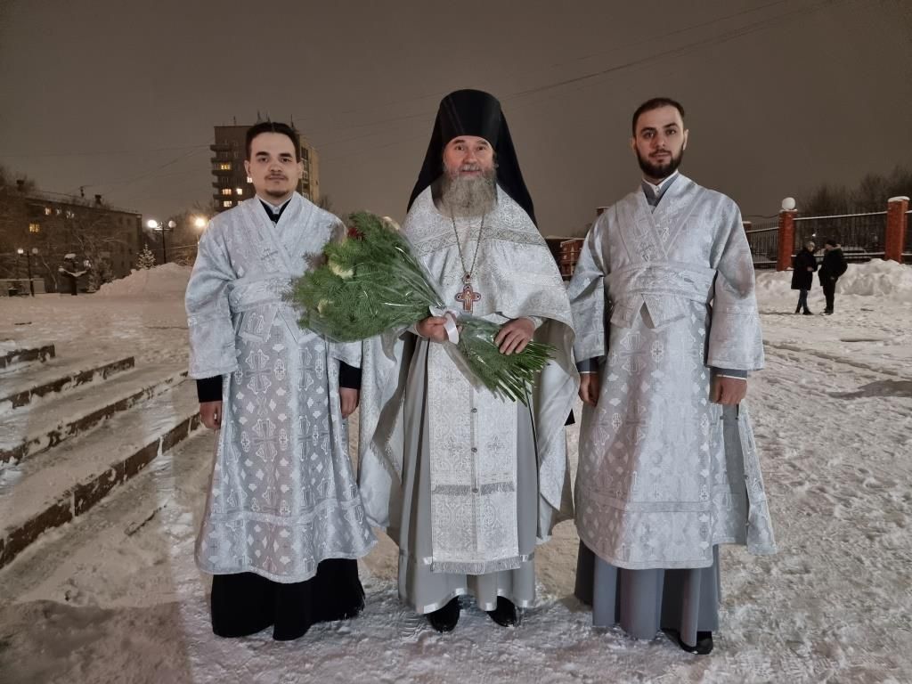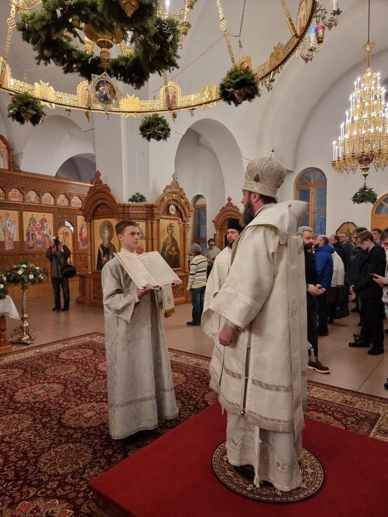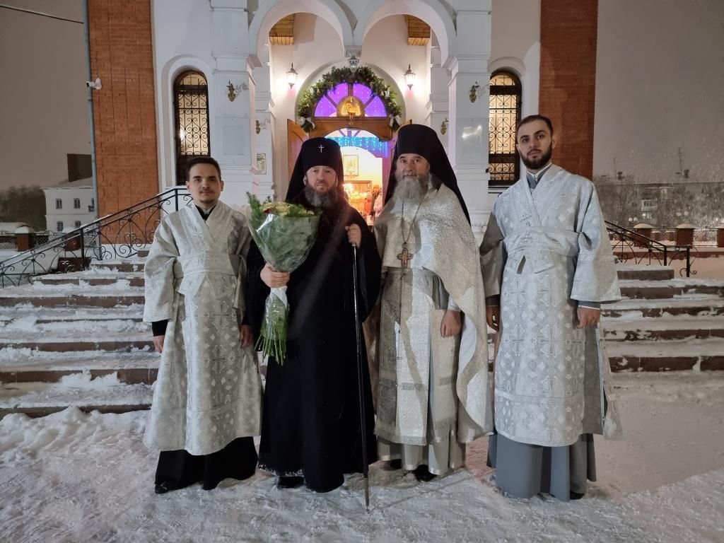 За праздничным ночным богослужением Архипастырю сослужили: ключарь кафедрального собора иеромонах Никодим (Авдеев), клирик собора иерей Роман Подрезов, настоятель Зиновьевского храма города Усть-Каменогорска иеромонах Мефодий (Шевчук), секретарь епархии диакон Илия Кван, протодиакон Андрей Дудник. Песнопения великого праздника Рождества исполнял хор Андреевского собора под управлением регента Н. Романцовой.