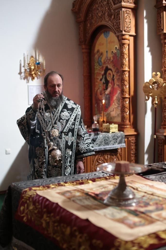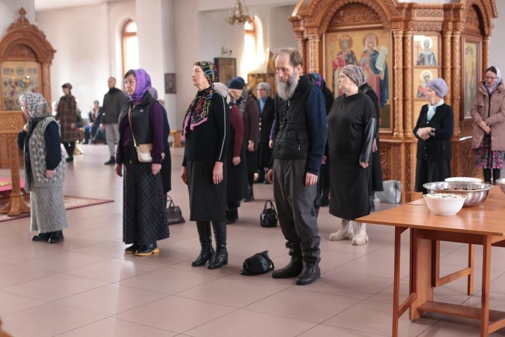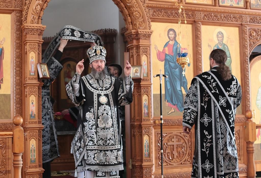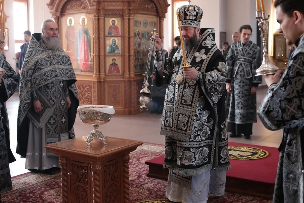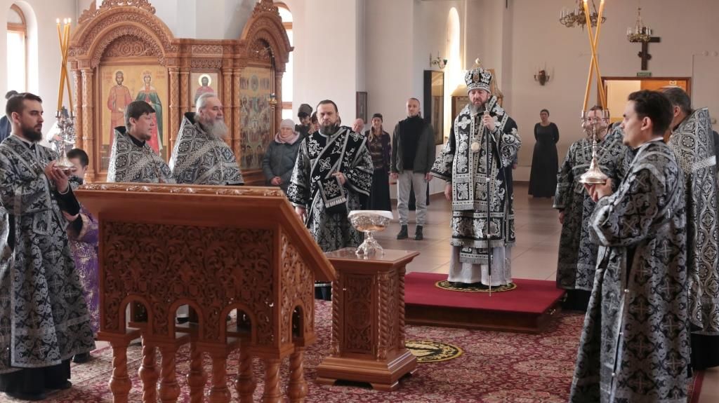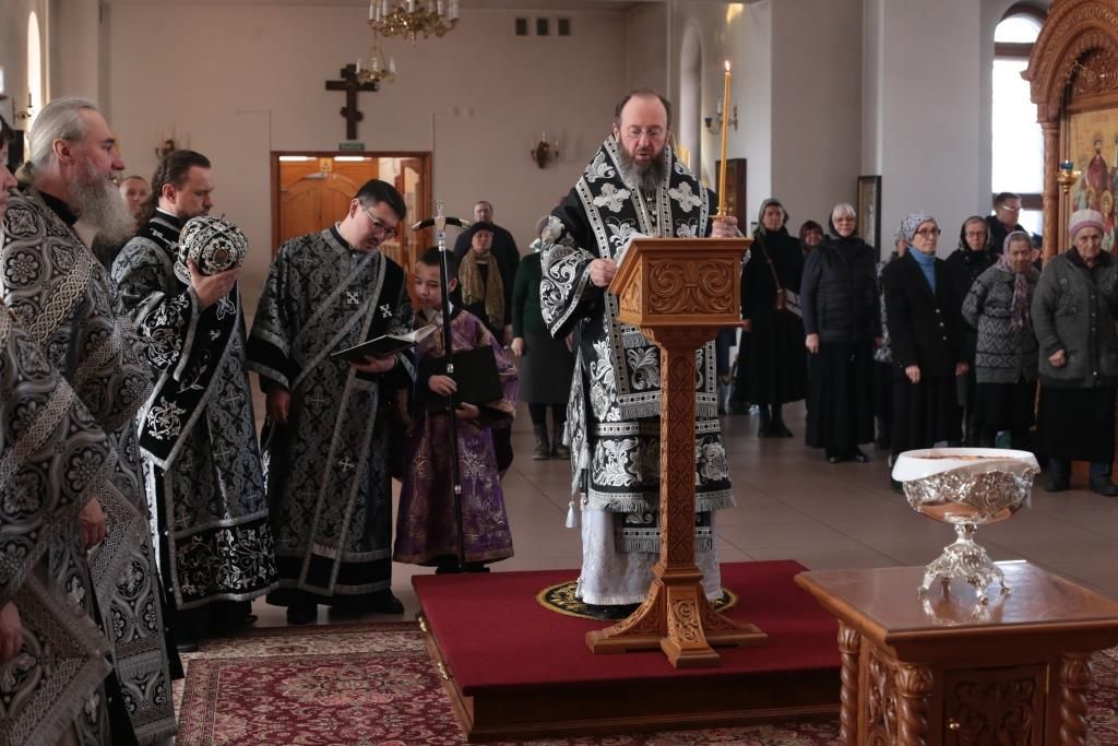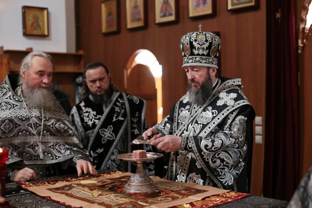 В соответствие с богослужебным уставом, после заамвонной молитвы и было совершено молебное пение с каноном великомученику Феодору Тирону и чин освящения колива. После окончания Божественной Литургии Владыка архиепископ поздравил народ Божий с началом Святой Четыредесятницы и обратился к молящимся со словами проповеди.