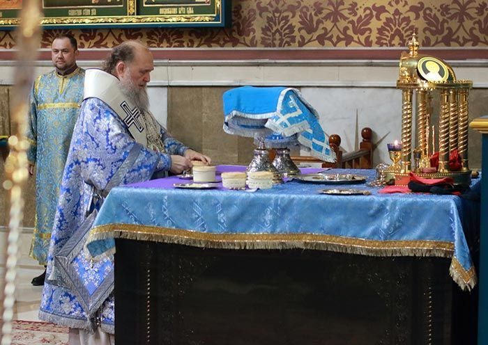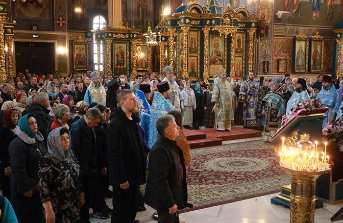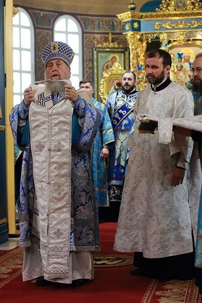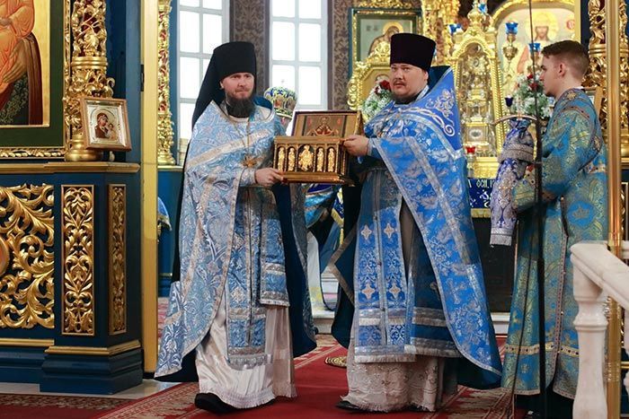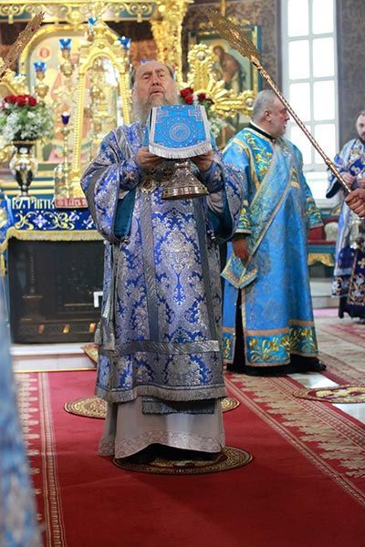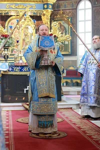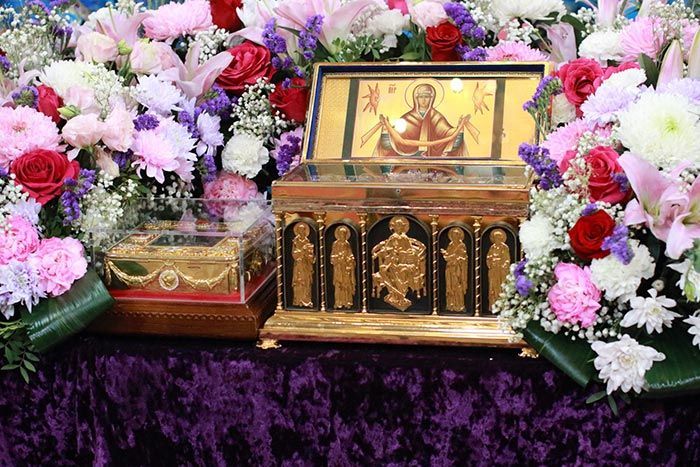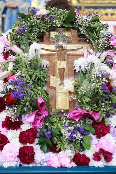 На аналое в центре храма возлежали изнесенный накануне Крест – дар приснопамятного Блаженнейшего Патриарха Иерусалимского Диодора с частицами Животворящего Древа Креста Господня. Рядом с Крестом Христовым был установлен ковчег с частью Пояса Пресвятой Богородицы.
