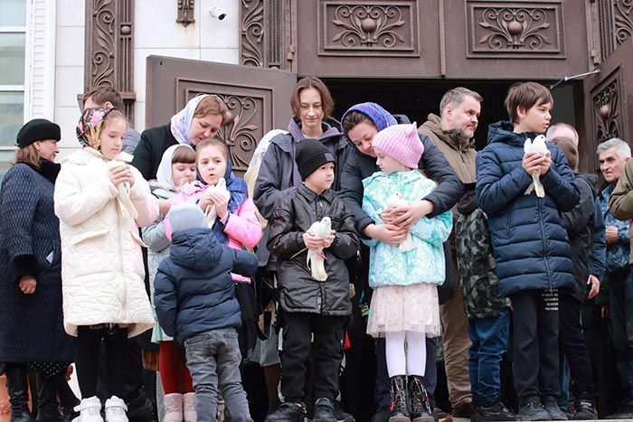 После завершения богослужения, в соответствии с древней традицией Благовещения, владыка митрополит, духовенство, прихожане и учащиеся детской воскресной школы на крыльце собора выпустили на волю птиц – белых голубей.
