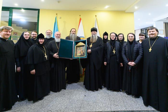 Чудотворную икону в паломничестве в Казахстан сопровождают: настоятельница Алексеевской женского ставропигиального монастыря Москвы, руководитель Правового управления Московской Патриархии игумения Ксения (Чернега), духовник Алексеевского монастыря протоиерей Артемий Владимиров, сестры обители.
