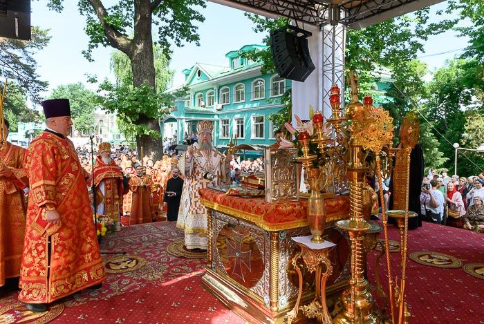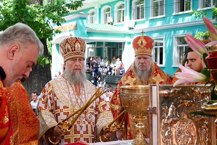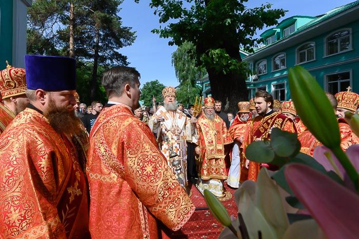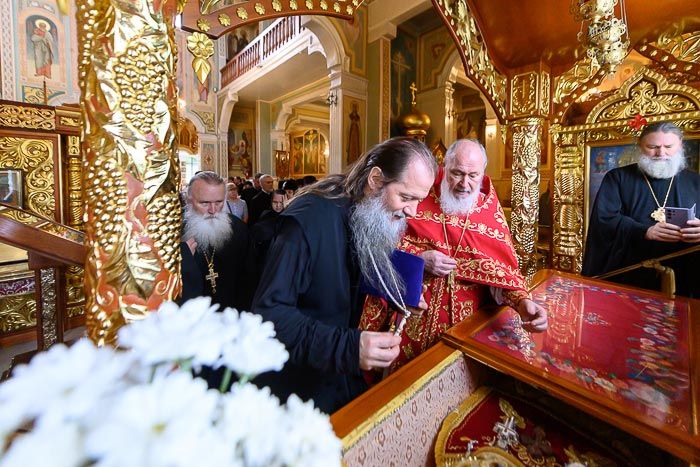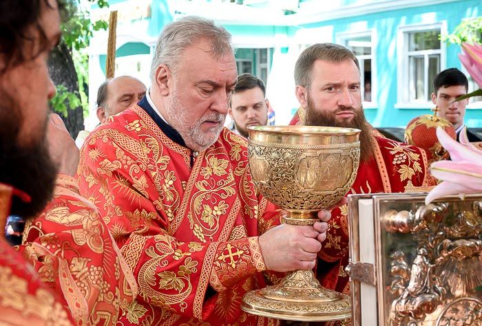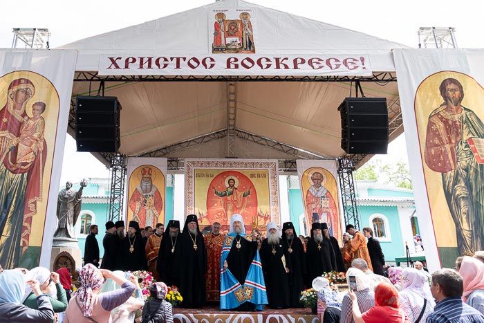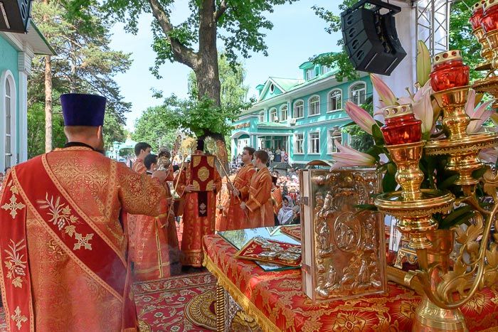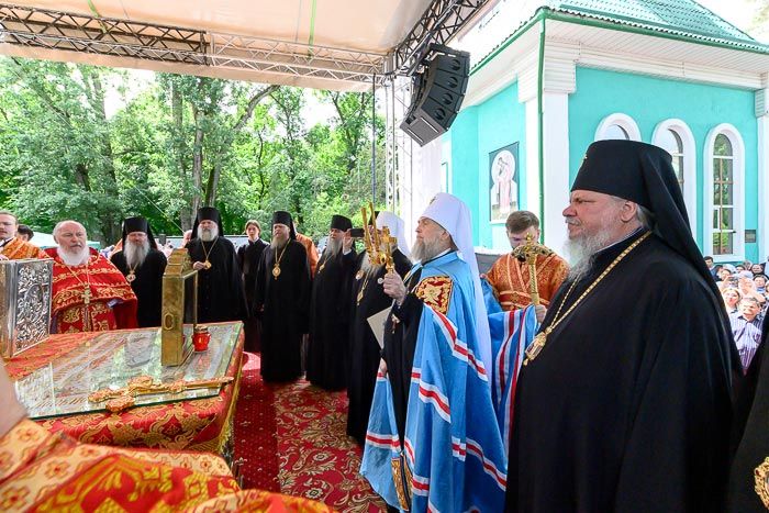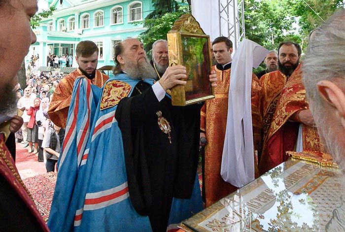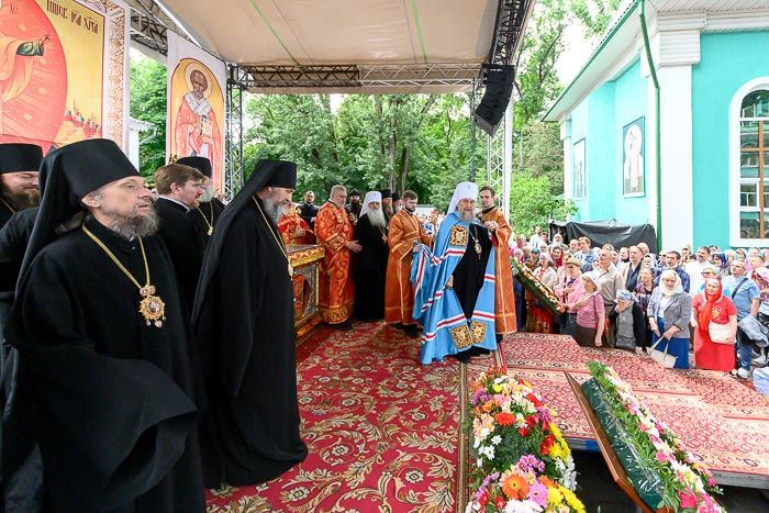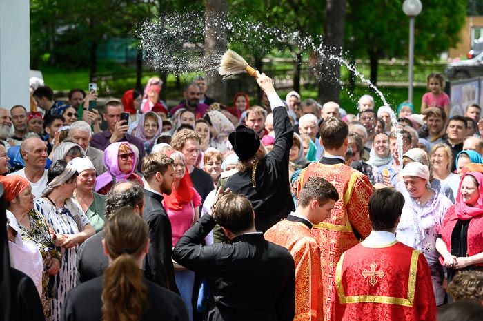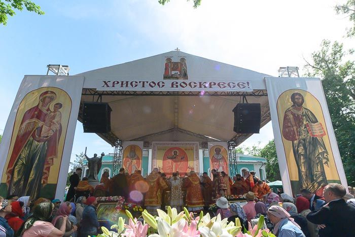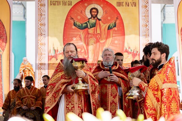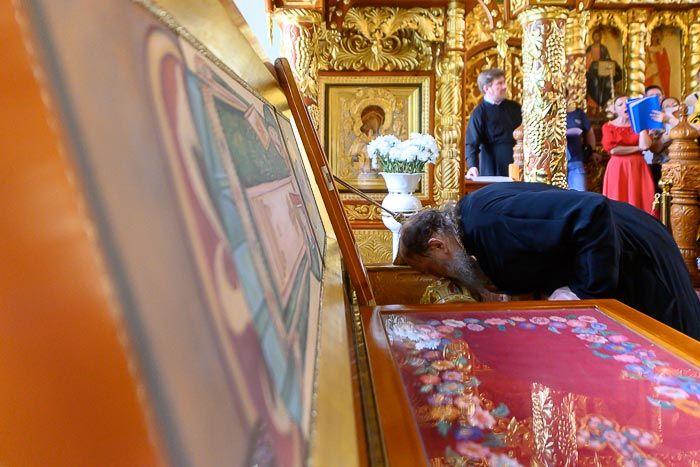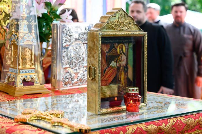После чтения часов, перед началом Литургии, при пении пасхальных тропарей великая святыня – чудотворная икона Пресвятой Богородицы «Целительница» – была встречена у ворот храма, перенесена крестным ходом к месту совершения богослужения и установлена на престоле.