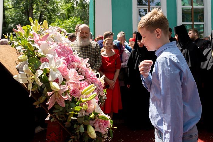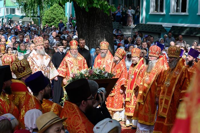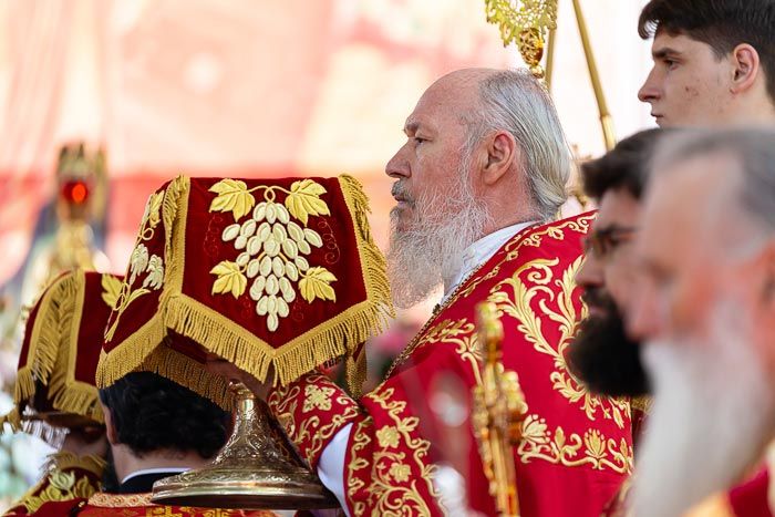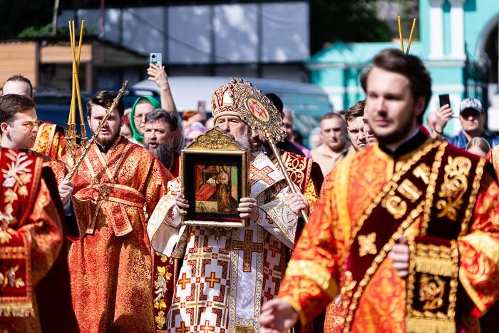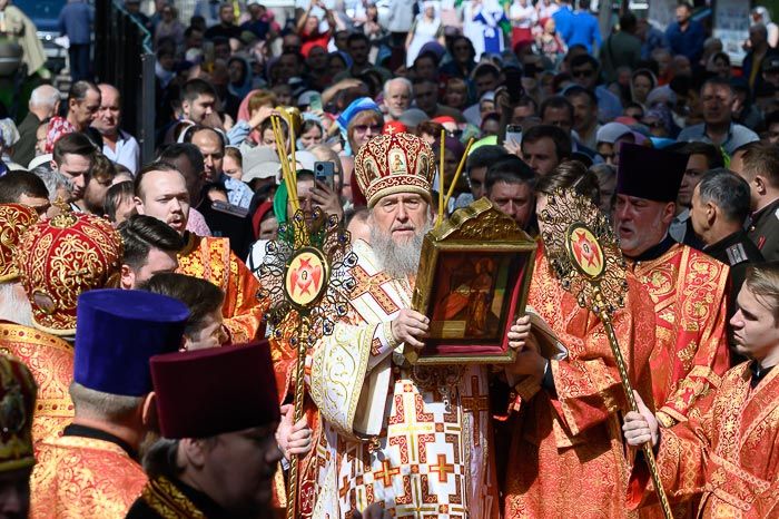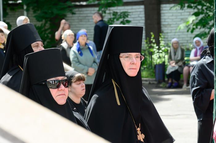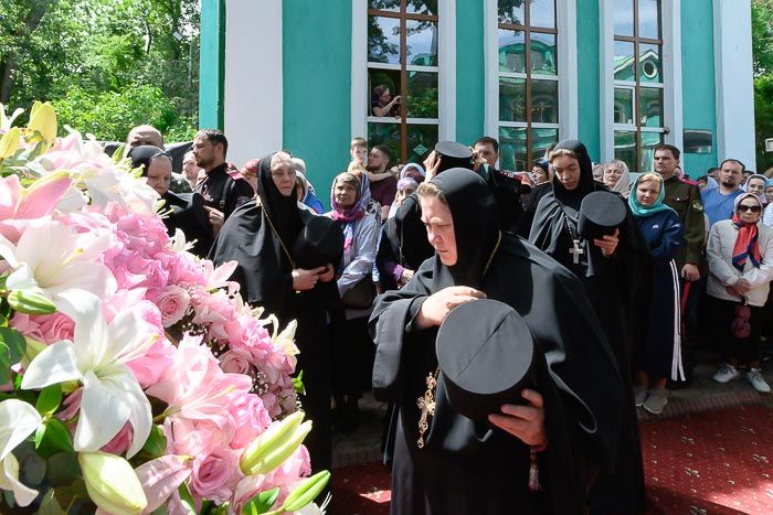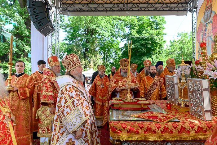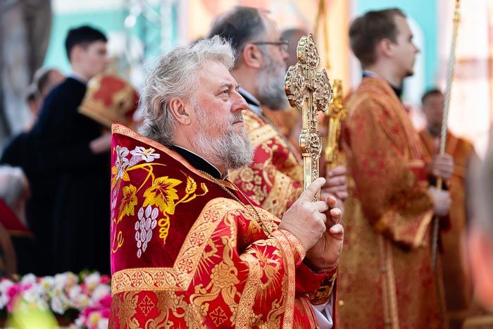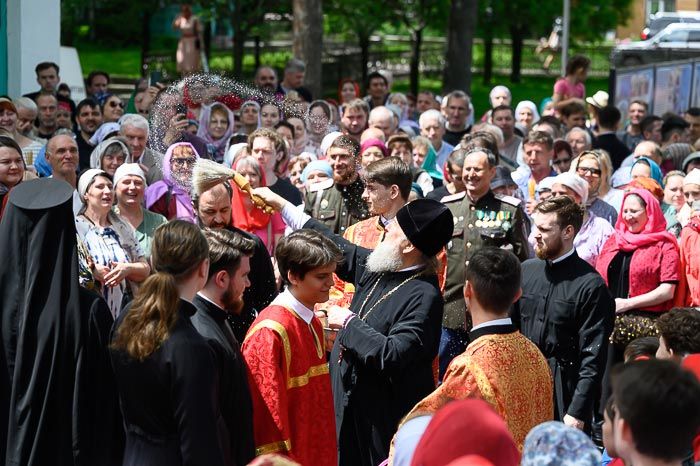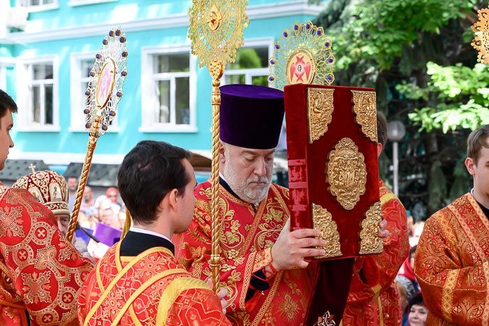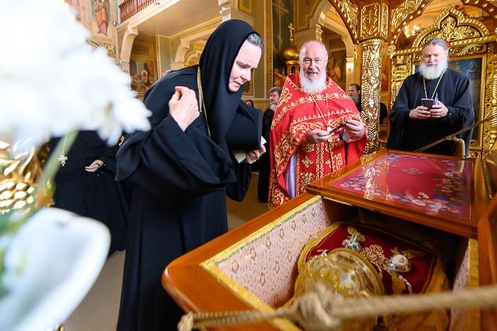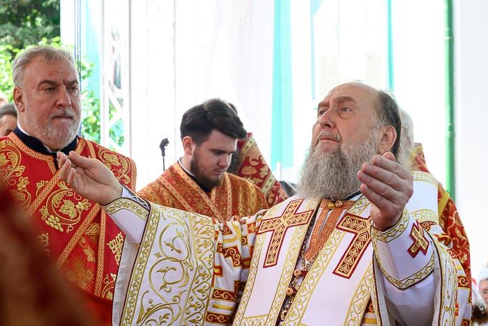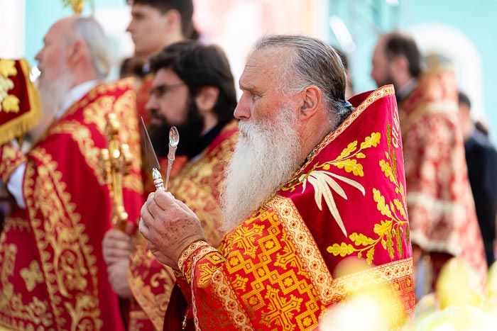 После чтения часов, перед началом Литургии, при пении пасхальных тропарей великая святыня – чудотворная икона Пресвятой Богородицы «Целительница» – была встречена у ворот храма, перенесена крестным ходом к месту совершения богослужения и установлена на престоле.