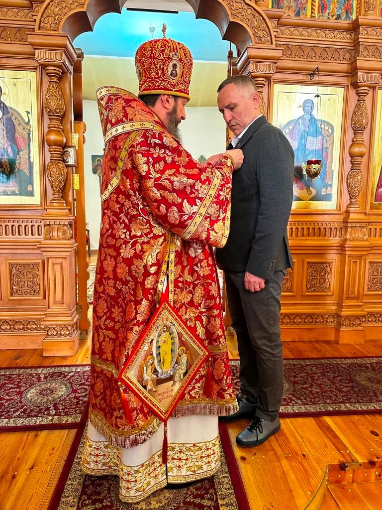 В ответном слове настоятель храма протоиерей Игорь Копылов поблагодарил от лица прихожан архиепископа Амфилохия и А.В. Холдина за радость совместной молитвы и ценный подарок для храма, который, как отметил протоиерей Игорь Копылов, станет украшением Никольского храма и важной святыней для все православных христиан города. Так же после богослужения архиепископ Амфилохий наградил А.В. Холдина в связи с 55-летием со дня рождения орденом Православной Церкви Казахстана в честь священноисповедника Николая, митрополита Алма-Атинского.