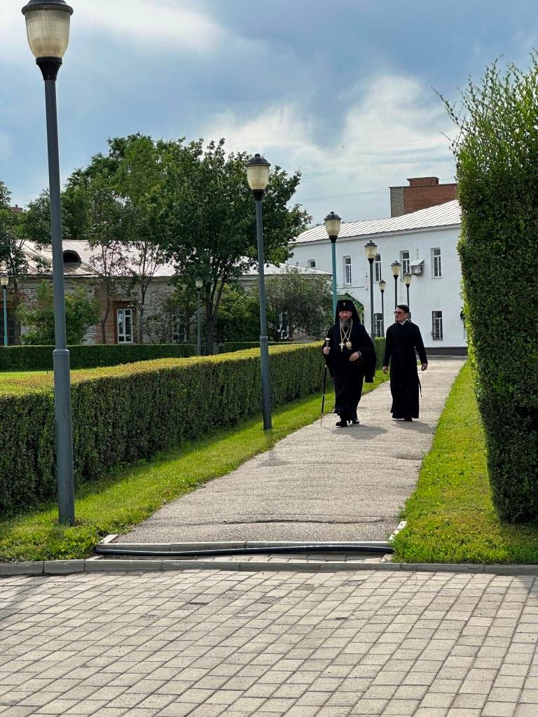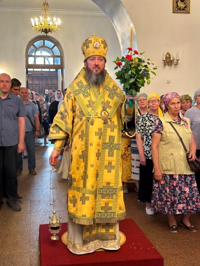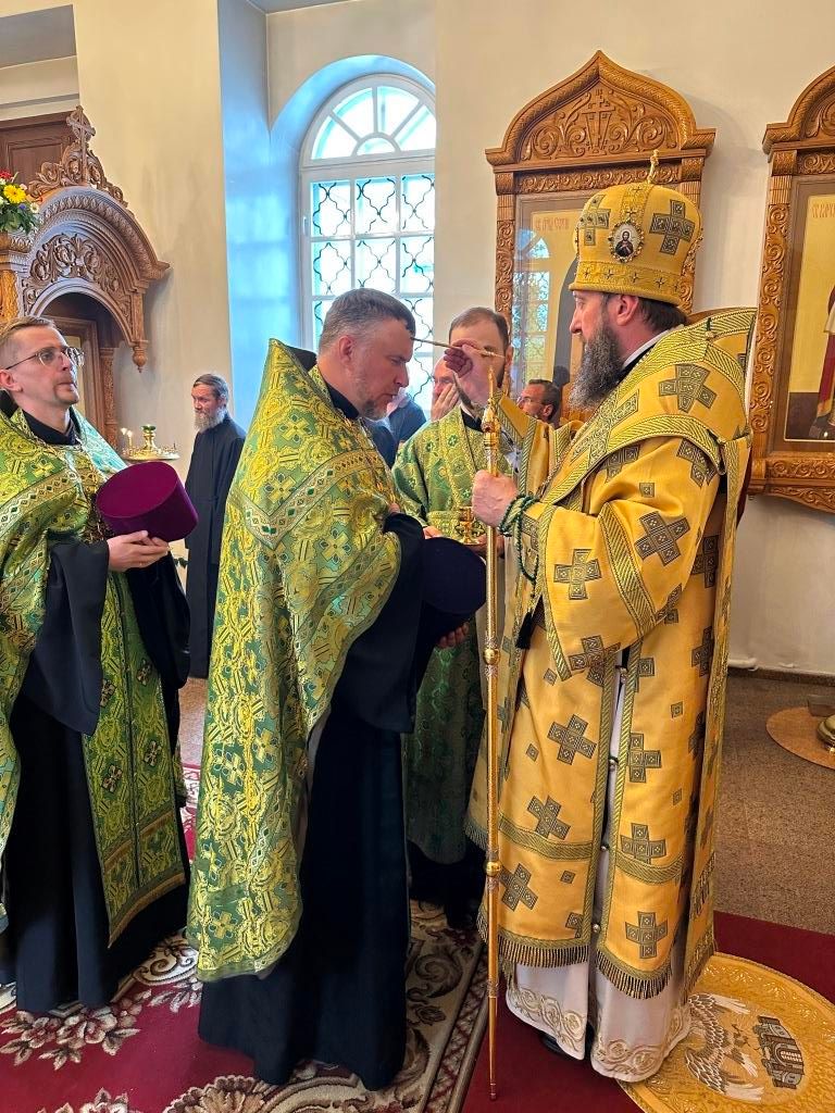 Его Высокопреосвященству сослужили: ключарь Андреевского кафедрального собора, духовник Свято-Троицкого мужского монастыря иеромонах Никодим (Авдеев), клирики Андреевского собора иерей Виталий Адаменков и иерей Константин Дьяков, секретарь епархии диакон Илия Кван, протодиакон Андрей Дудник. Хор под управлением регента Н. Романцовой исполнял богослужебные песнопения Всенощного бдения и праздника Святой Троицы.