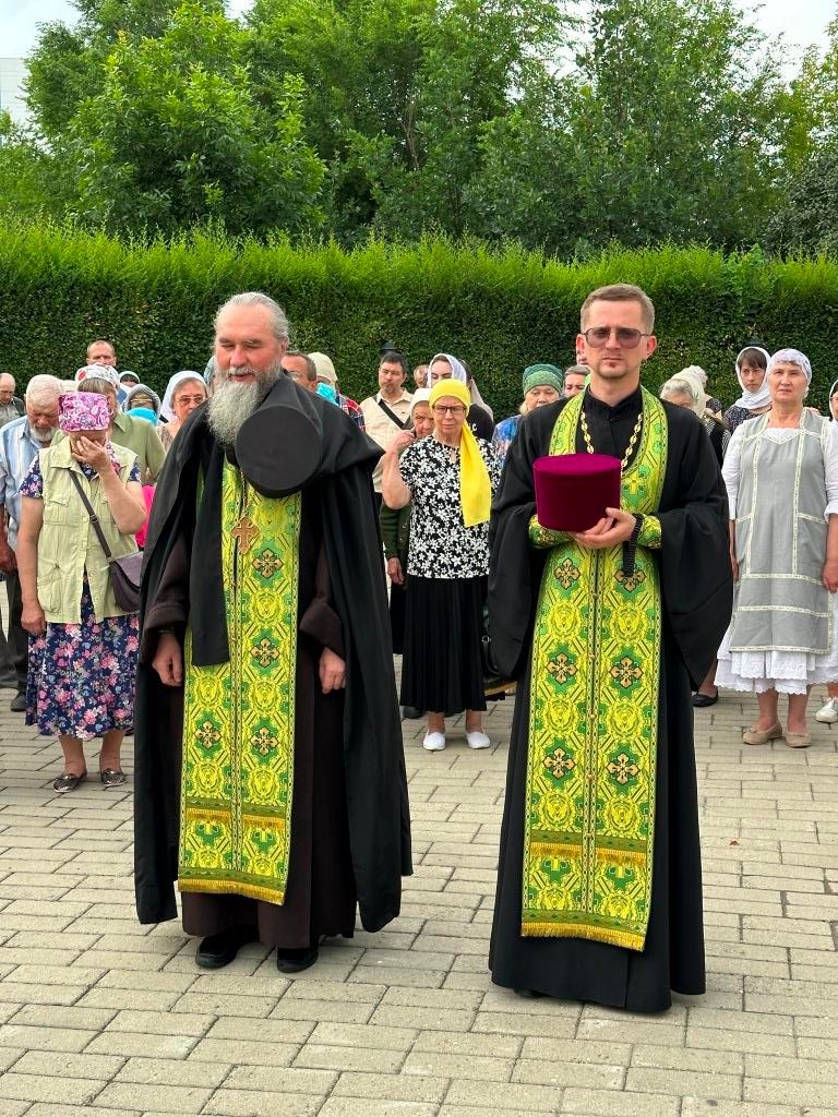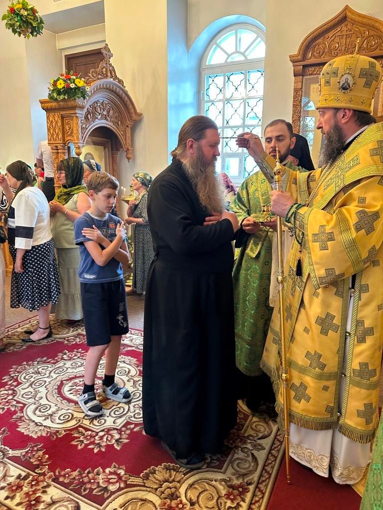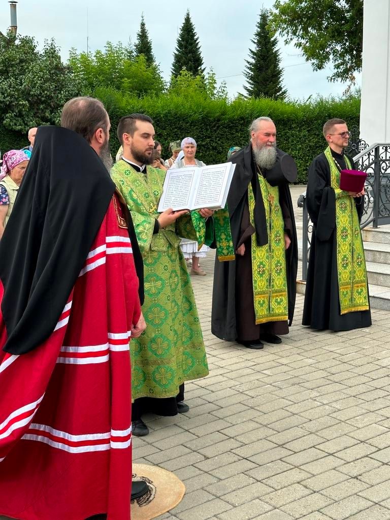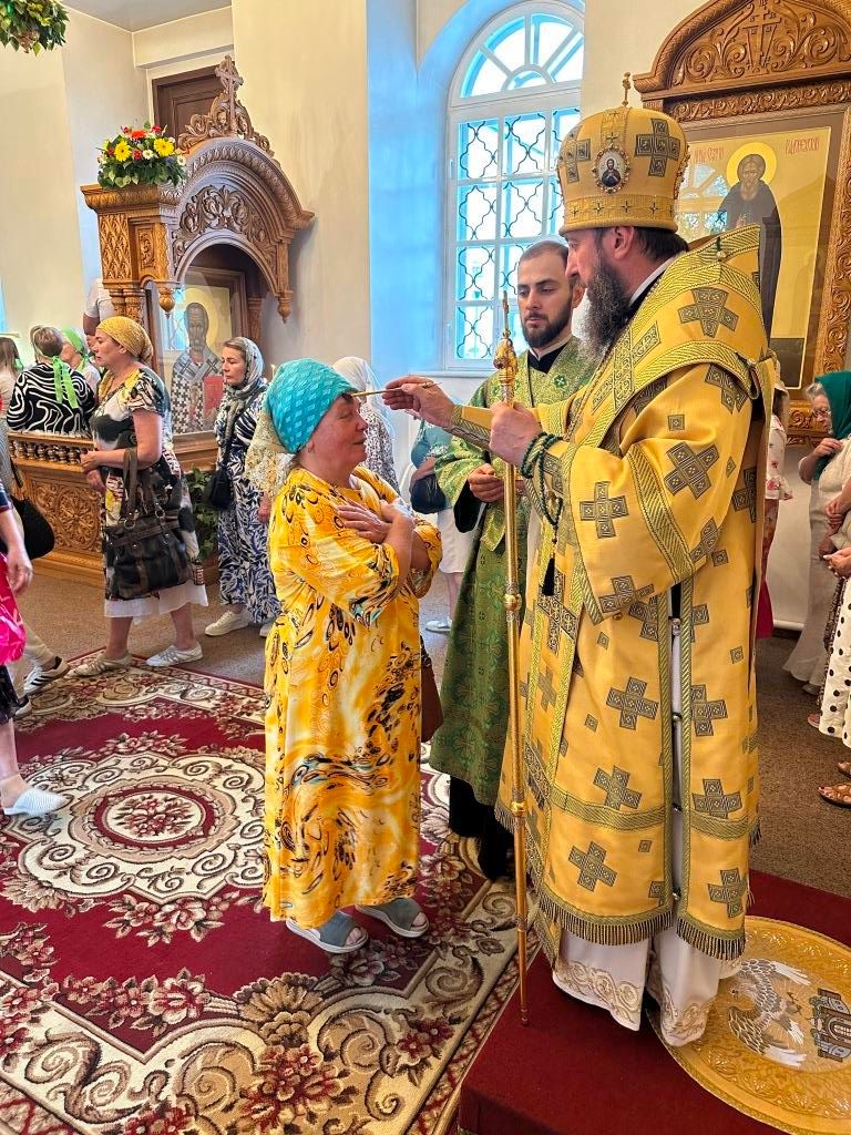За богослужением совершалась лития – сугубое моление с освящением хлеба, пшеницы, вина и елея. По традиции, молебное последование литии было совершено в соединении с крестным ходом вокруг храма. После чтения праздничного евангельского зачала архиепископ Амфилохий помазал клир и паству освященным елеем.