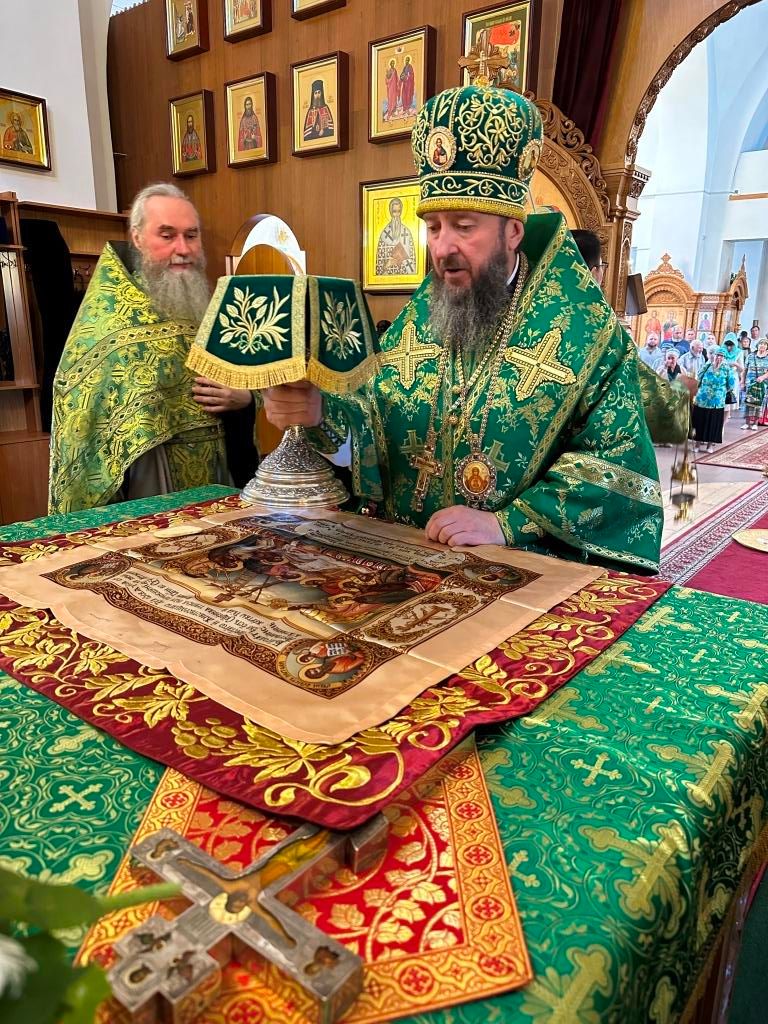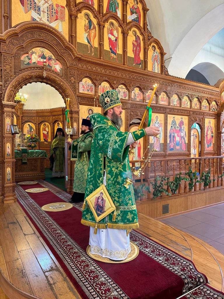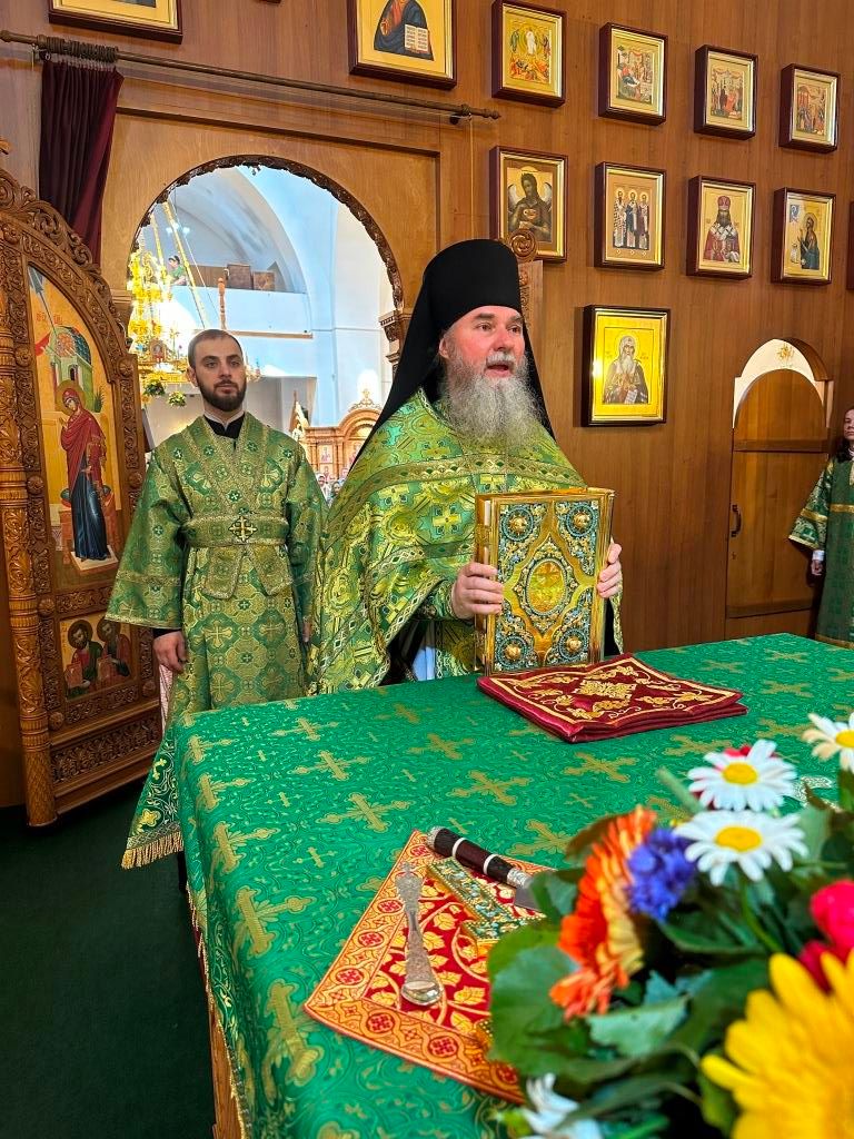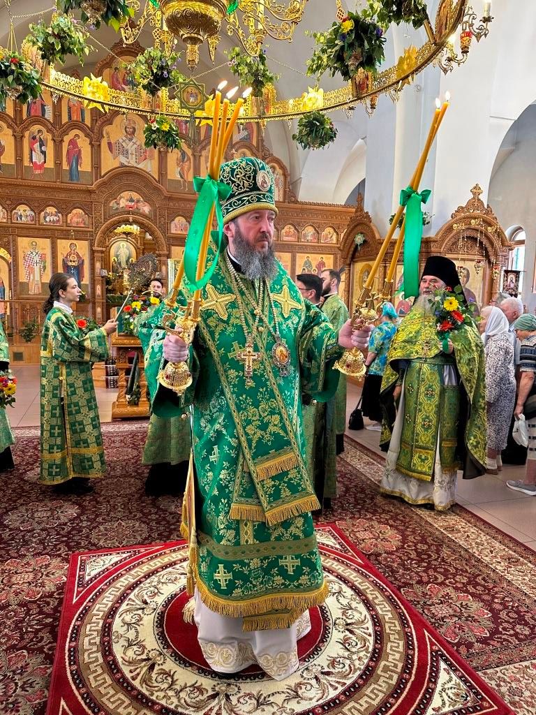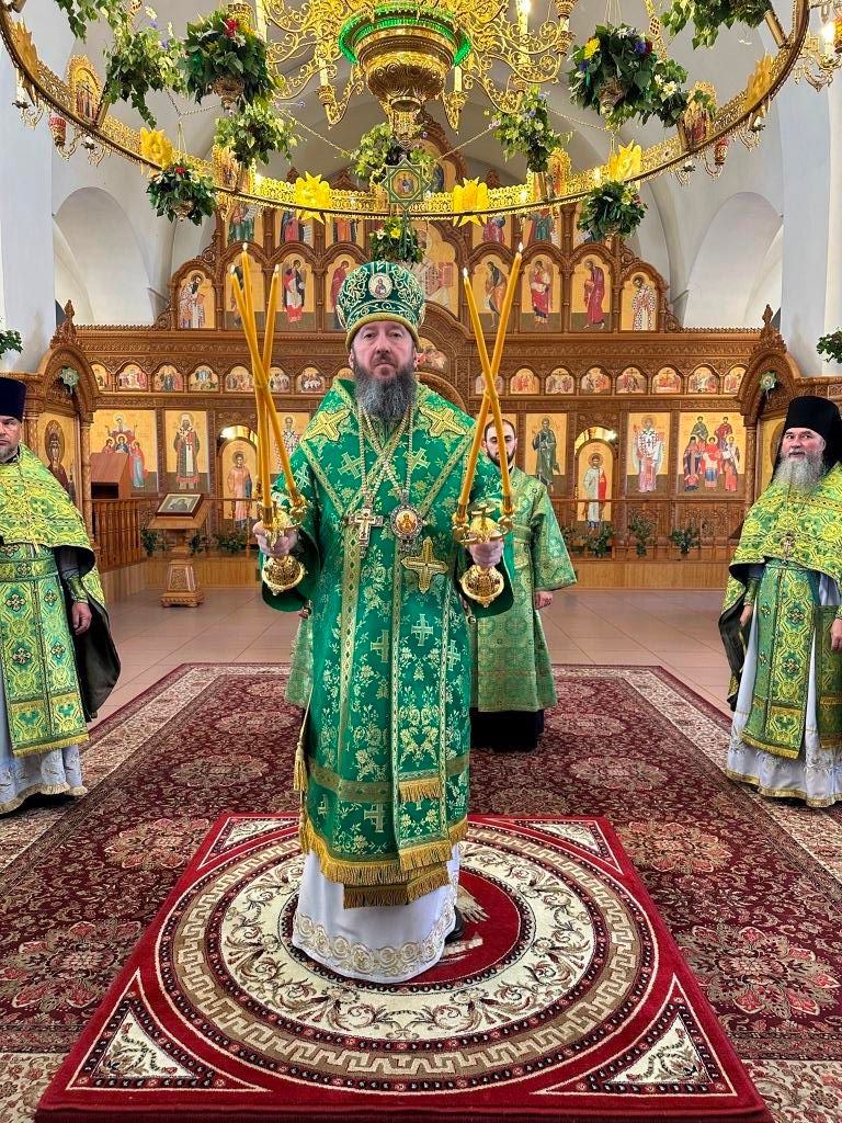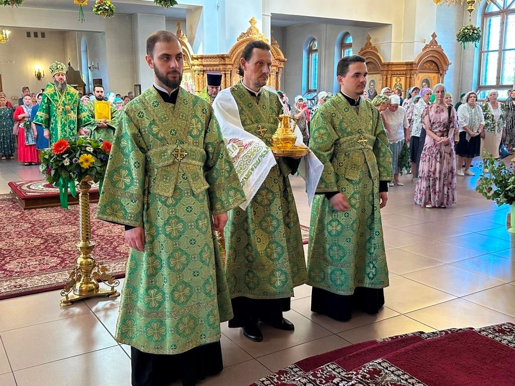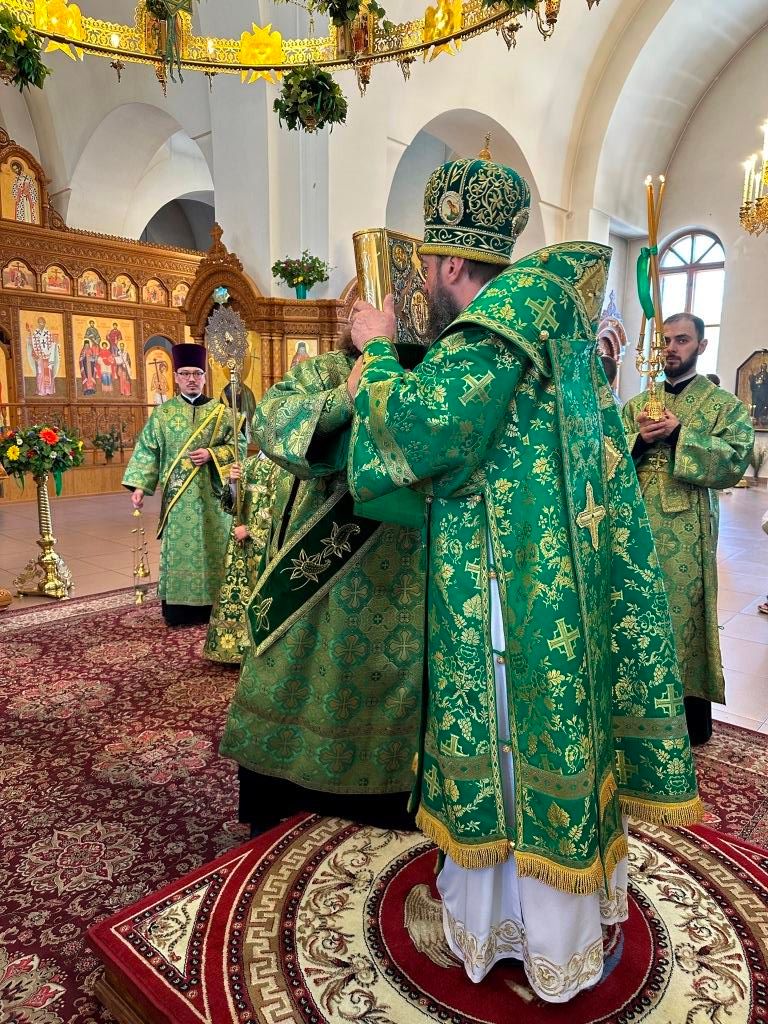 Песнопения праздника Пятидесятницы и Божественной Литургии исполнял хор кафедрального собора под управлением регента Н. Романцовой. За богослужением молились прихожане кафедрального собора и насельники Свято-Троицкого монастыря, сотрудники епархиального управления. Перед началом Божественной Литургии в Свято-Троицком храме был совершен праздничный молебен с чином освящения вводы.