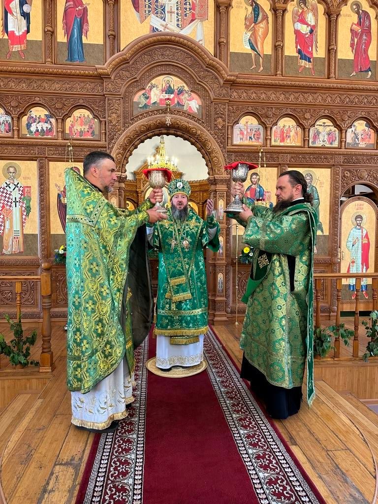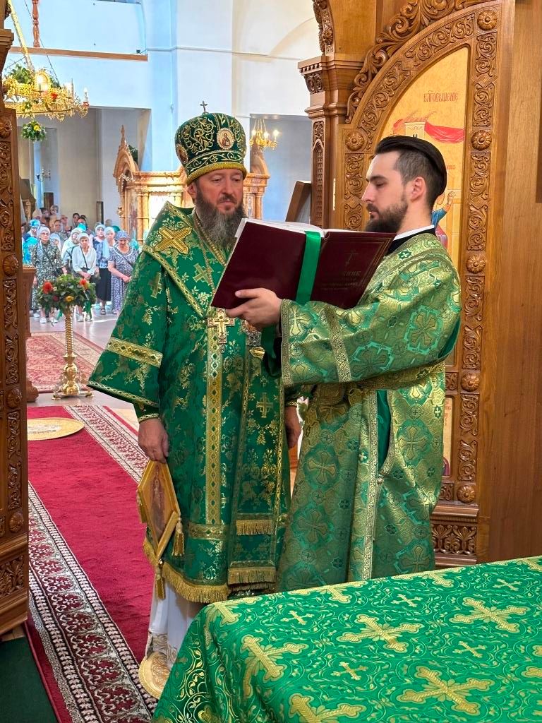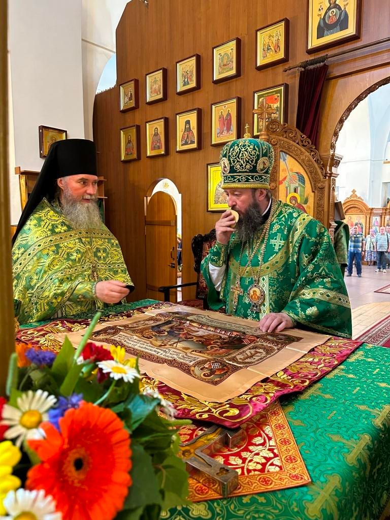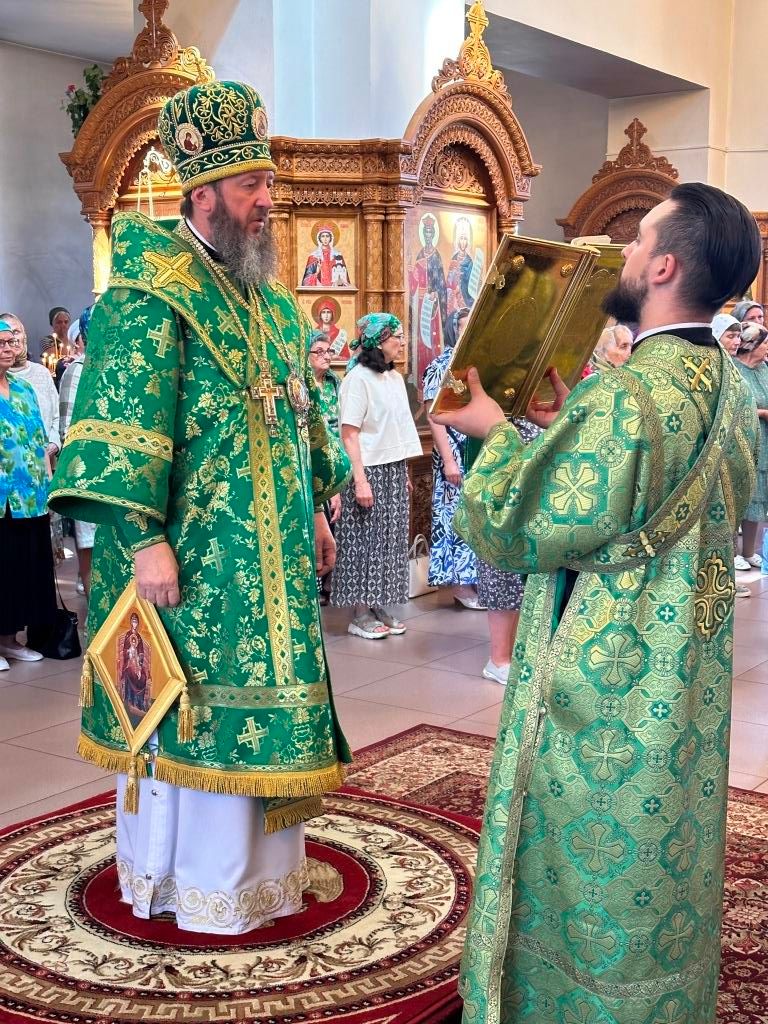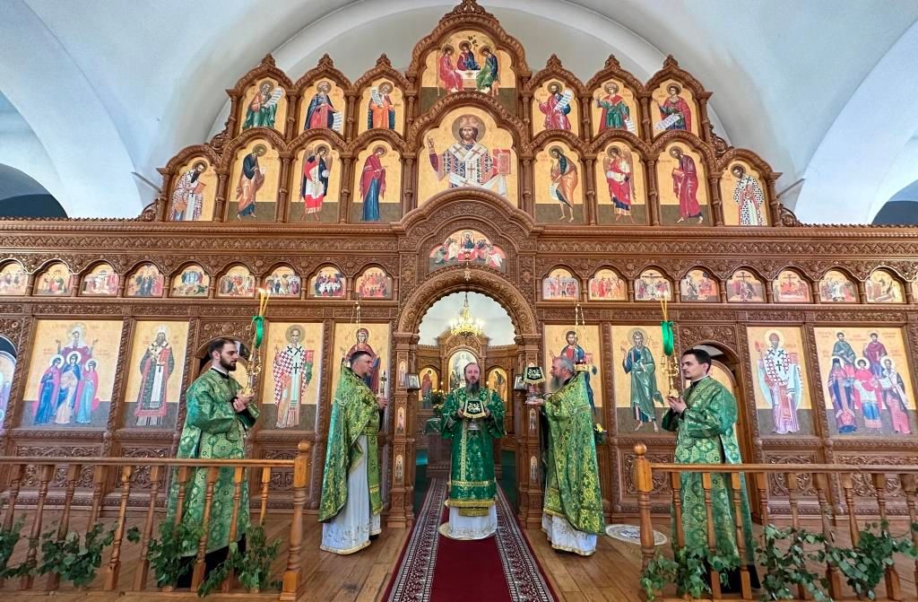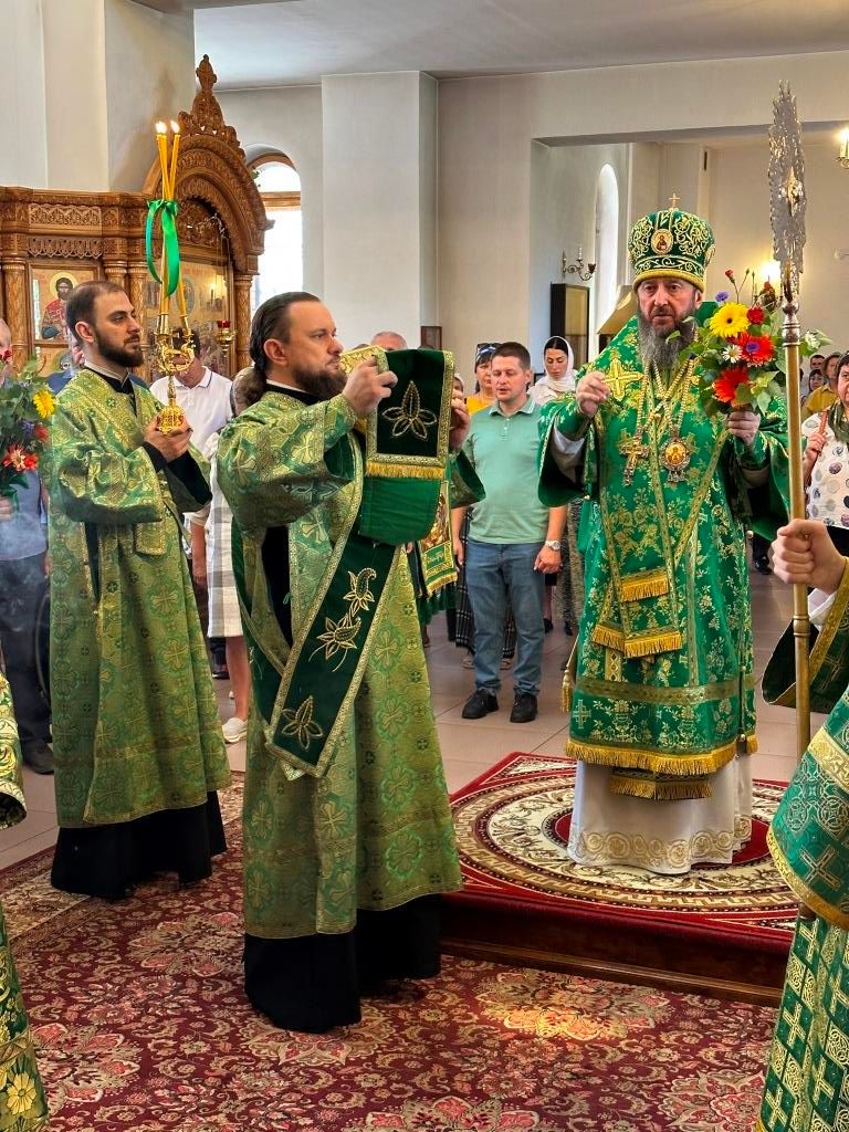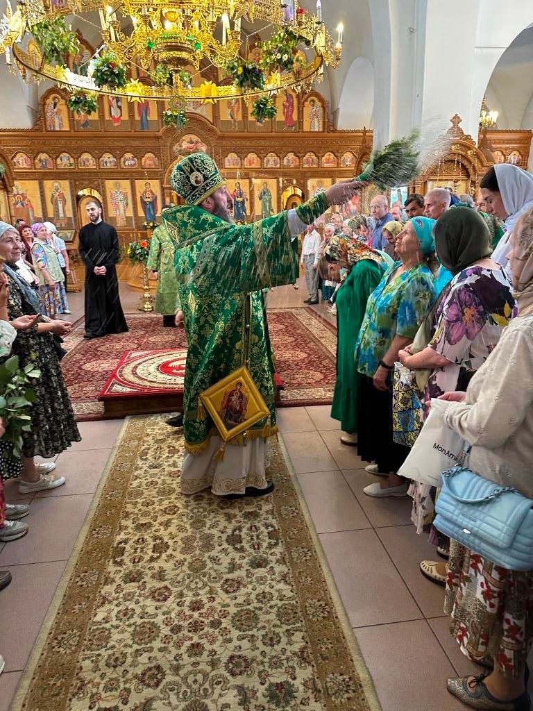 Песнопения праздника Пятидесятницы и Божественной Литургии исполнял хор кафедрального собора под управлением регента Н. Романцовой. За богослужением молились прихожане кафедрального собора и насельники Свято-Троицкого монастыря, сотрудники епархиального управления. Перед началом Божественной Литургии в Свято-Троицком храме был совершен праздничный молебен с чином освящения вводы.