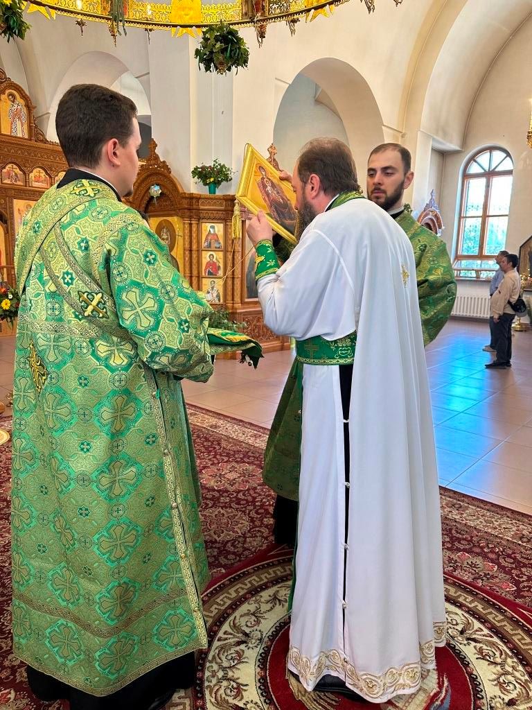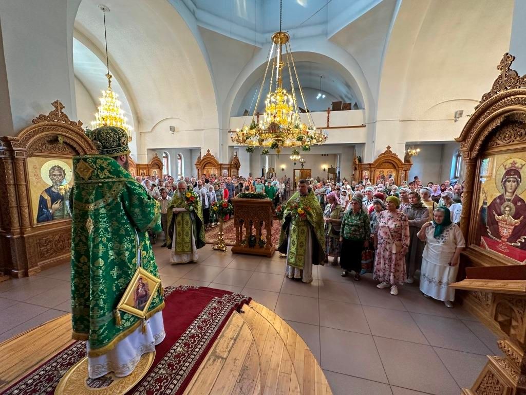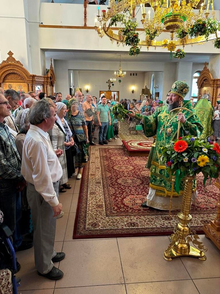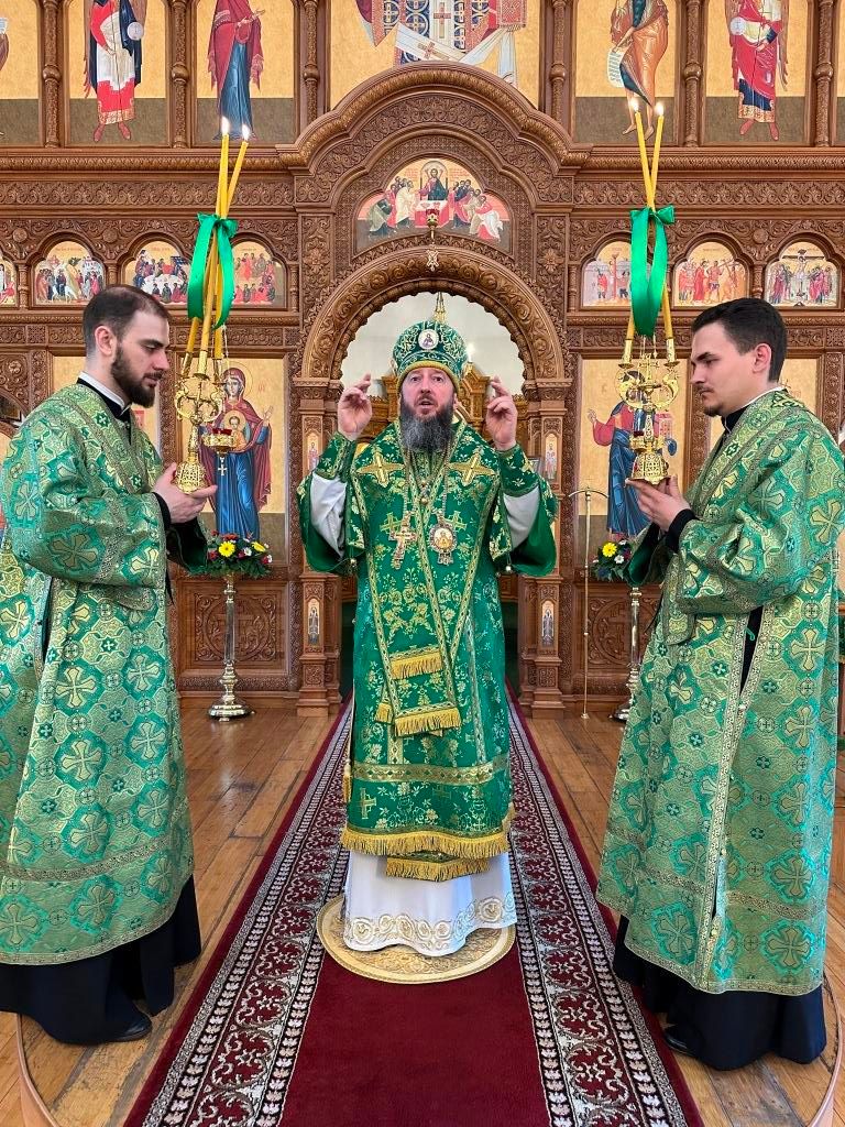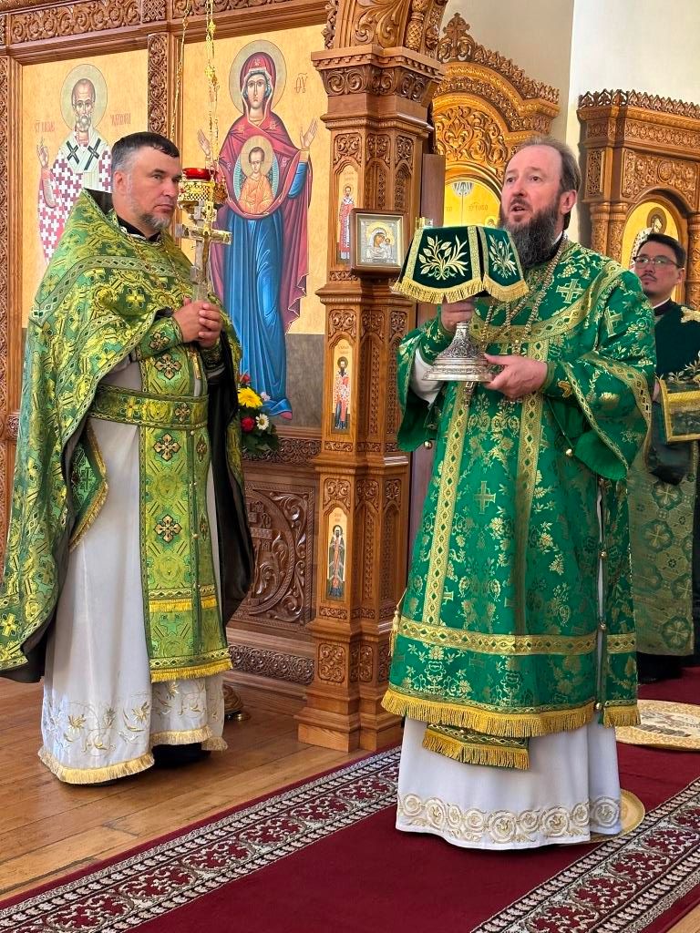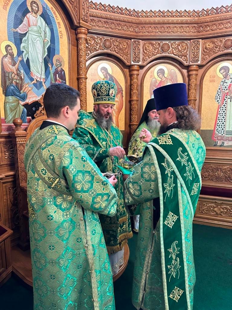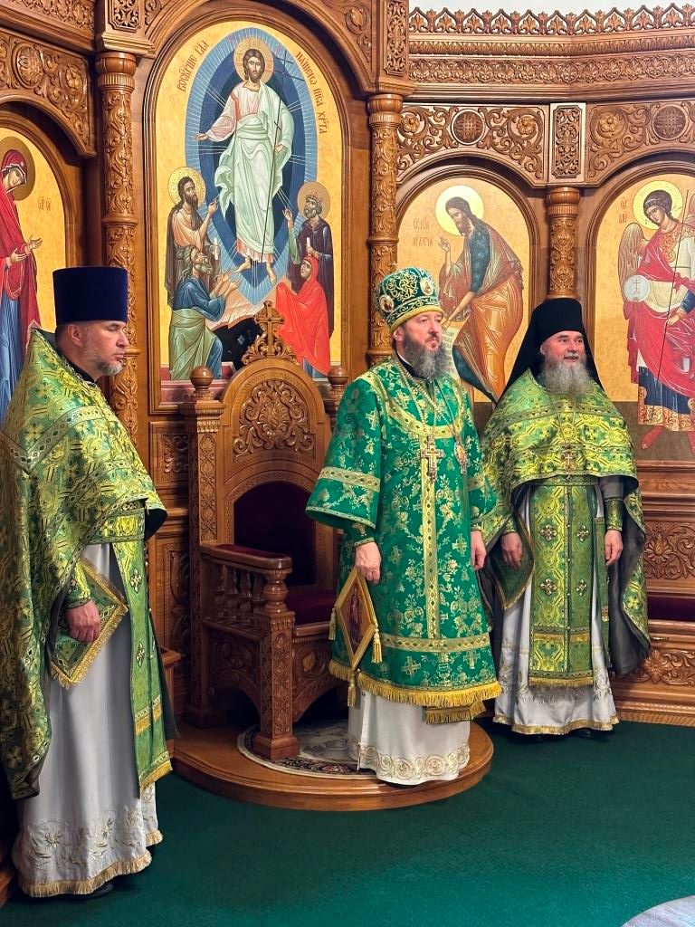 Песнопения праздника Пятидесятницы и Божественной Литургии исполнял хор кафедрального собора под управлением регента Н. Романцовой. За богослужением молились прихожане кафедрального собора и насельники Свято-Троицкого монастыря, сотрудники епархиального управления. Перед началом Божественной Литургии в Свято-Троицком храме был совершен праздничный молебен с чином освящения вводы.