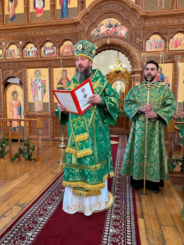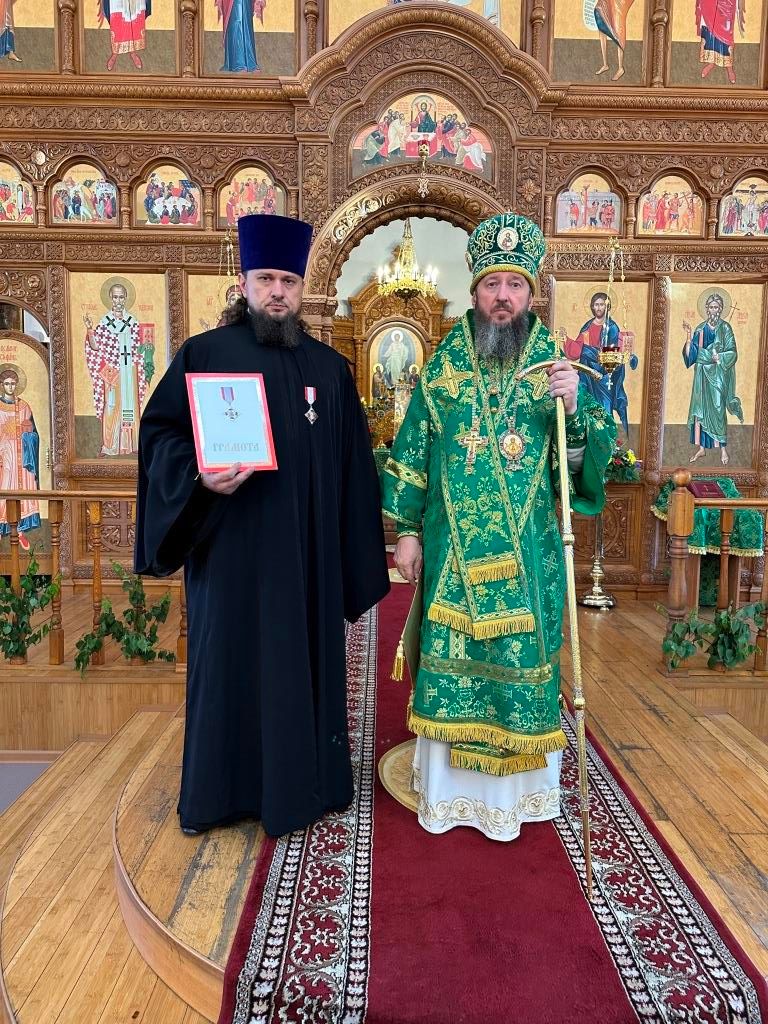 После богослужения Высокопреосвященнейший Владыка во внимание к многолетним усердным трудам на благо Церкви Христовой и в связи с 45-летием со дня рождения наградил клирика Андреевского кафедрального собора протодиакона Андрея Дудника орденом священномученика Пимена, епископа Верненского и Семиреченского.
