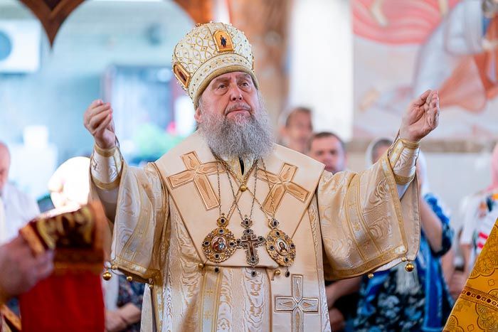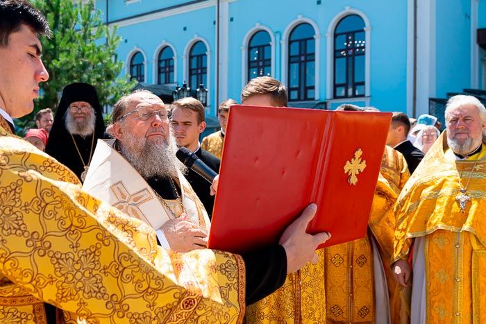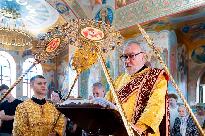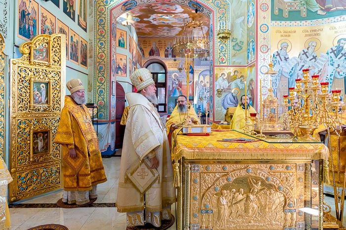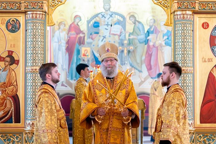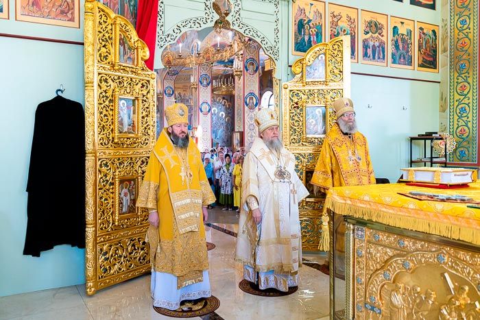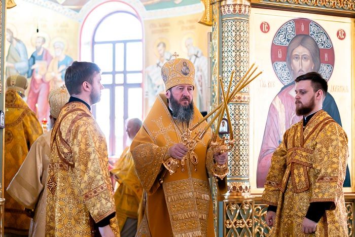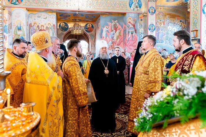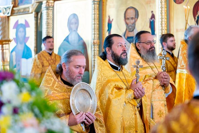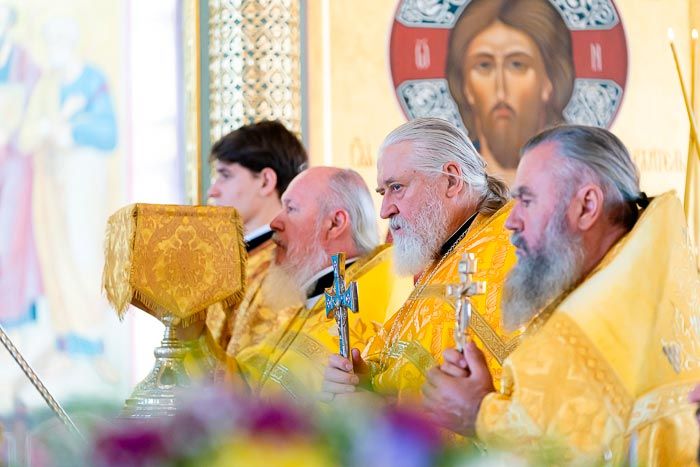 Литургия завершилась славлением апостолам Петру и Павлу – духовенство и хор исполнили тропарь, кондак и величание первоверховным ученикам Христовым, владыка митрополит прочитал молитву святым.