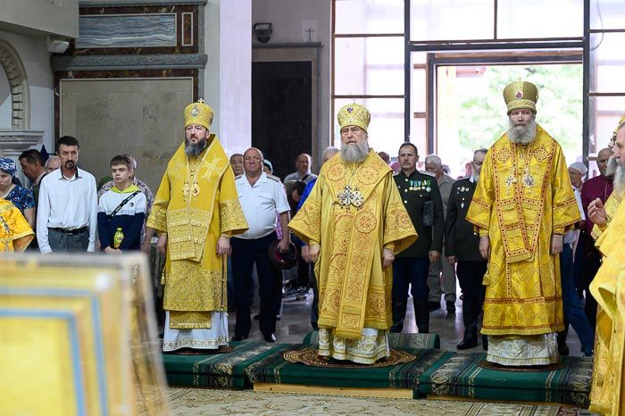 Главе Митрополичьего округа сослужили: архиепископ Усть-Каменогорский и Семипалатинский Амфилохий, викарий Астанайской епархии епископ Талгарский Вениамин; благочинный храмов Алма-Аты, настоятель Никольского собора протоиерей Валерий Захаров; настоятель алма-атинского храма в честь иконы Божией Матери «Всех скорбящих Радость» протоиерей Евгений Воробьев, руководитель отдела образования и катехизации Митрополичьего округа, настоятель Покровской церкви и храма в честь Собора Пресвятой Богородицы протоиерей Евгений Бобылев; настоятель Параскевинской церкви и Александро-Невского храма протоиерей Иоанн Лопатин, ключарь Христорождественского собора протоиерей Александр Гайченя, настоятель Богоявленского храма протоиерей Валерий Шаврин, руководитель отдела Митрополичьего округа по связям с общественностью, ключарь Вознесенского кафедрального собора Южной столицы протоиерей Александр Суворов, настоятель храма в честь Богоявления Господня села Маловодное протоиерей Николай Ткаченко, ключарь Петропавловского храма протоиерей Кирилл Шкляр, благочинный Илийского церковного округа протоиерей Александр Зырянов, ключарь Никольского собора протоиерей Игорь Светличный, настоятель Ильинской церкви поселка Караой протоиерей Георгий Лаговский, иерей Алексий Мураев, руководитель личного секретариата митрополита иеромонах Прохор (Ендовицкий), исполняющий обязанности благочинного Талгарского церковного округа, клирик Никольского храма города Талгар иерей Кирилл Фрейганг; настоятель Димитриевского храма села Байсерке иерей Владимир Шишлов, ключарь Адриано-Наталиевского храма иерей Иоанн Коноплев; протодиакон Николай Гринкевич, секретарь Усть-Каменогорской епархии диакон Илия Кван, диакон Иоанн Чуркин, диакон Иоанн Атырханов.