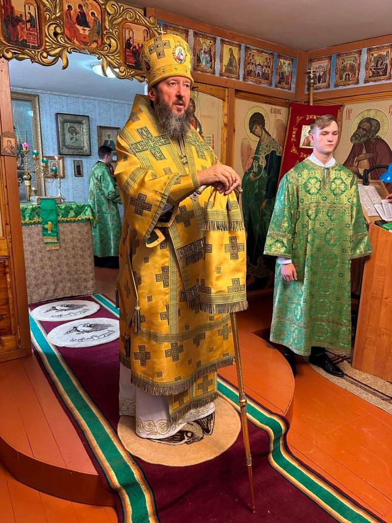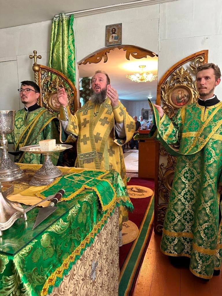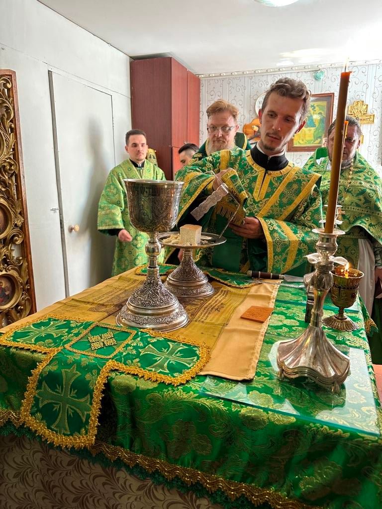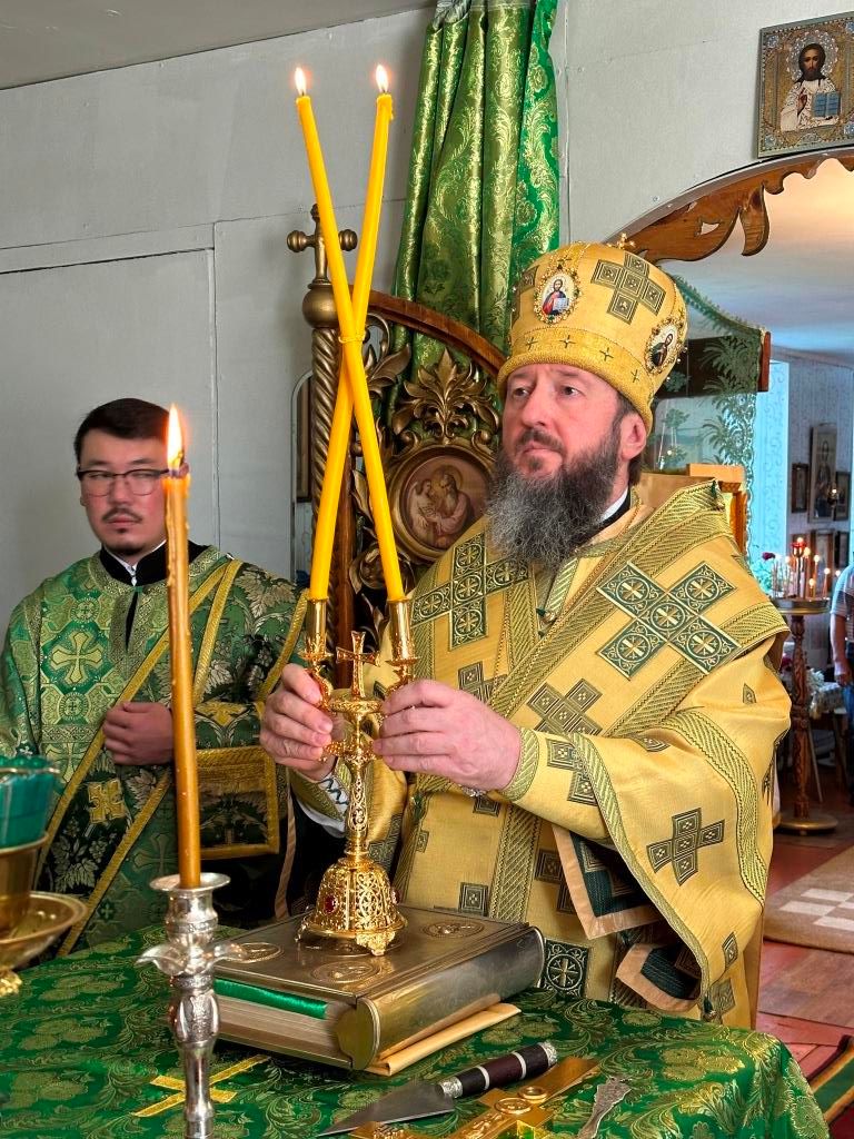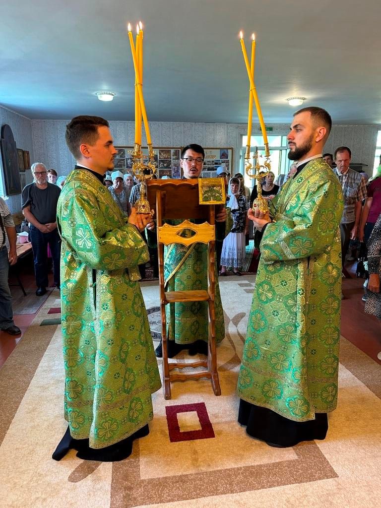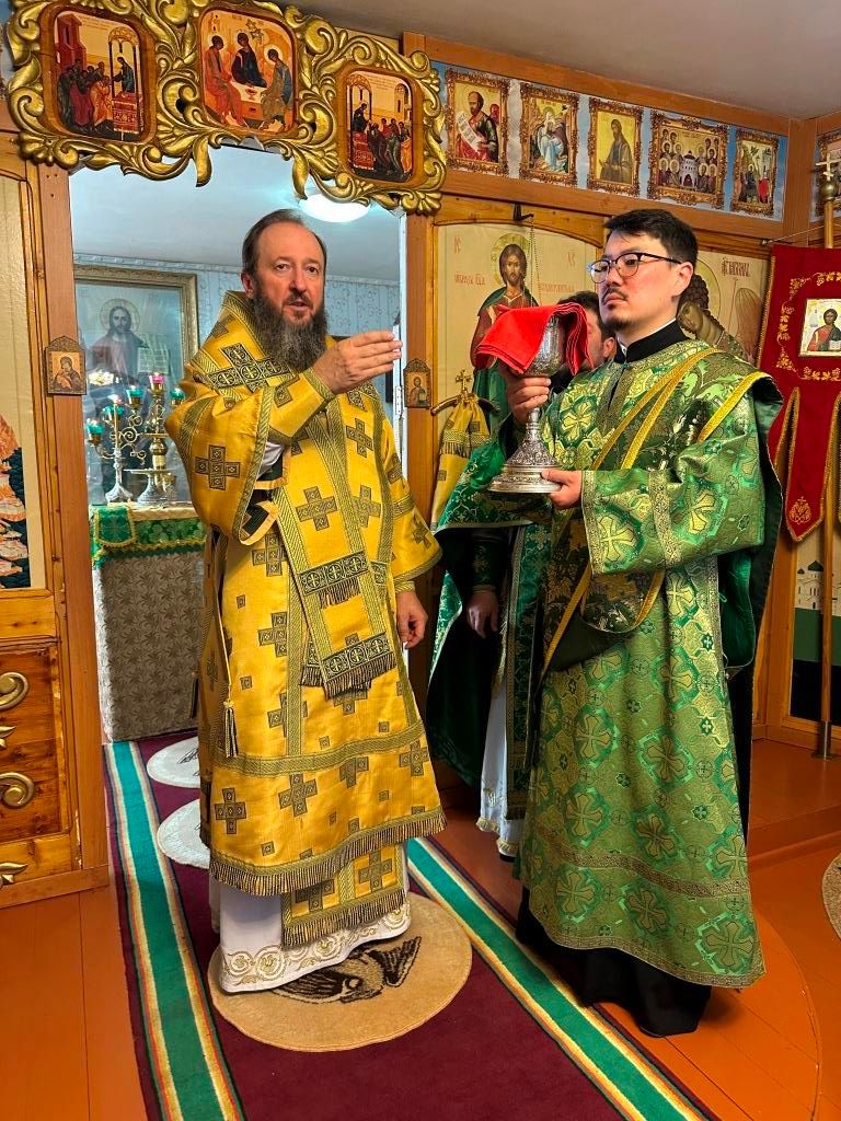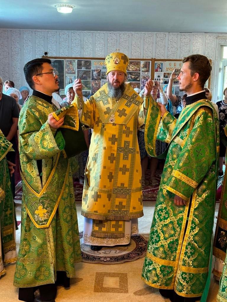 Его Высокопреосвященству сослужили: благочинный Усть-Каменогорского церковного округа иеромонах Силуан (Магилев), духовник епархии протоиерей Игорь Копылов, настоятель Серафимовского храма иерей Георгий Гуцалов, секретарь епархии диакон Илия Кван, диакон Кирилл Нарушин. За праздничным богослужением молились и причащались Христовых Таин прихожане и паломники из окрестных населённых пунктов. Песнопения Божественной Литургии исполнял хор Покровского собора города Усть-Каменогорска под управлением регента А. Король.