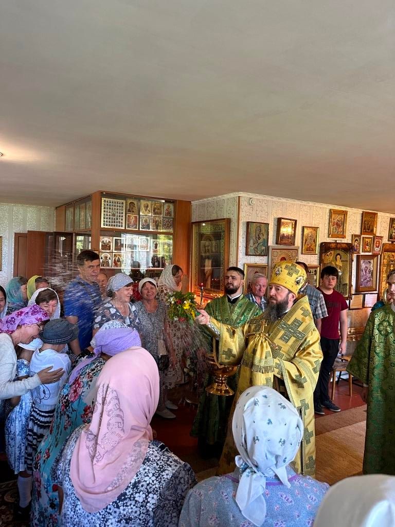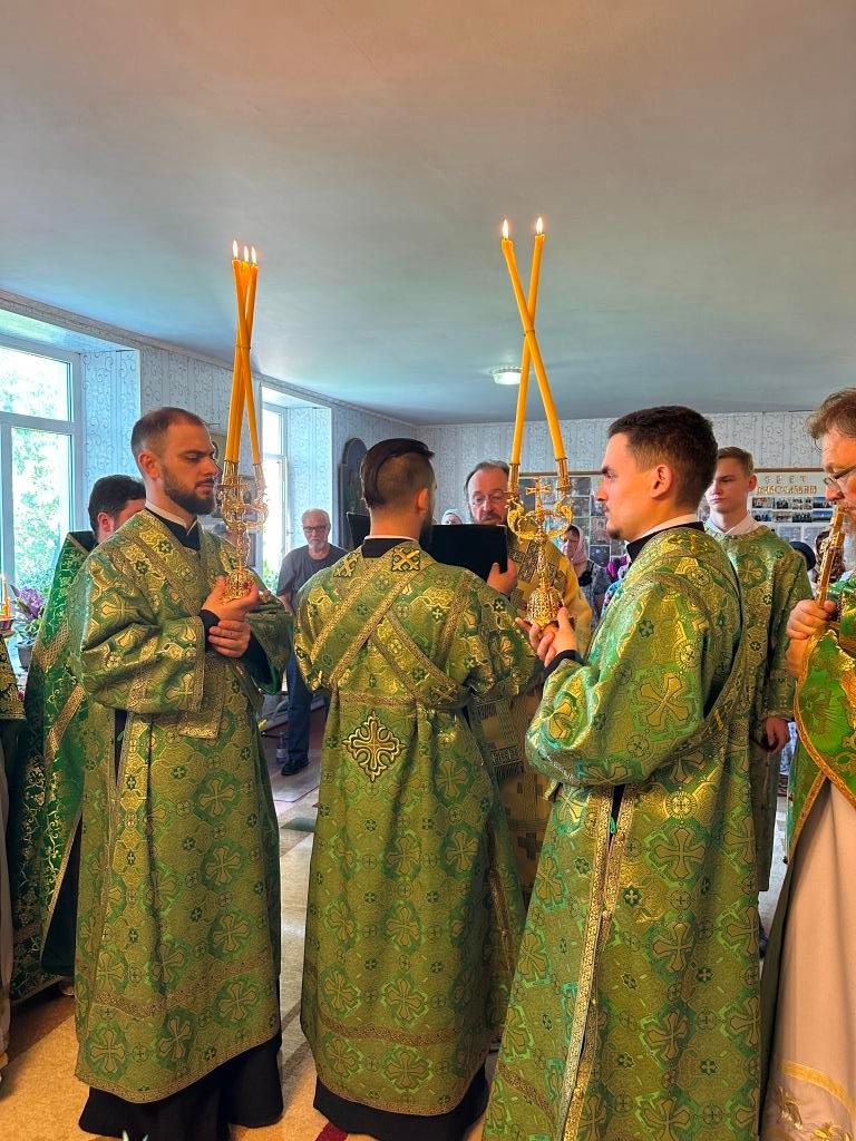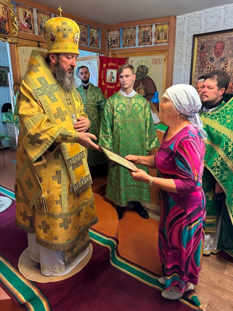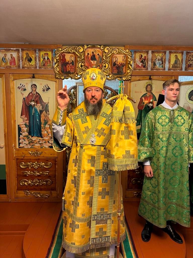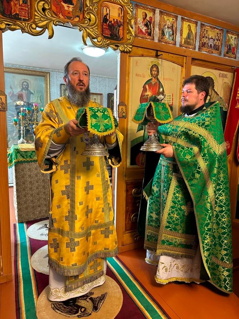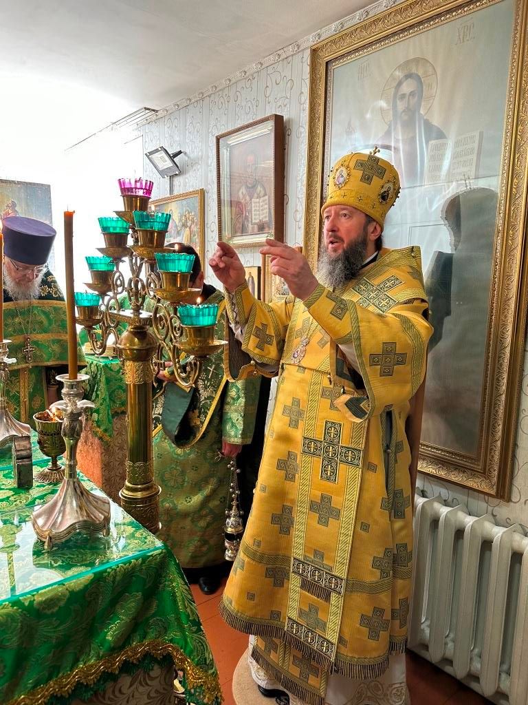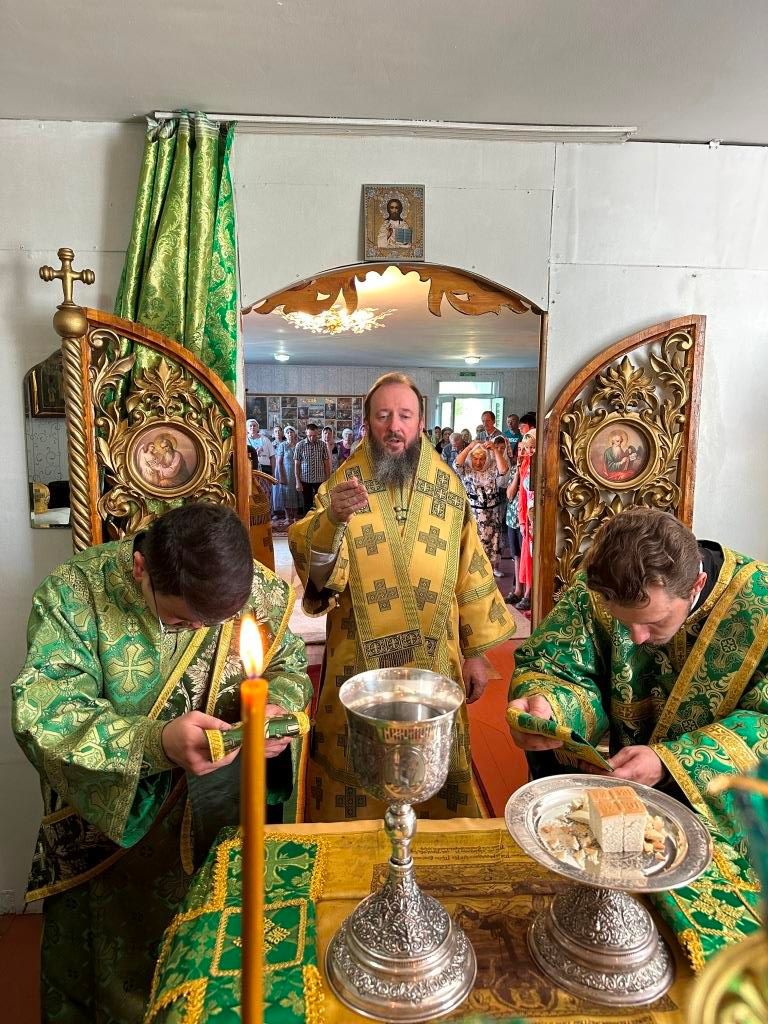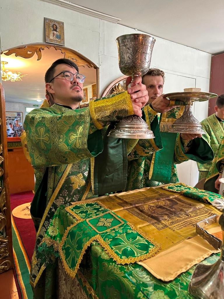 Его Высокопреосвященству сослужили: благочинный Усть-Каменогорского церковного округа иеромонах Силуан (Магилев), духовник епархии протоиерей Игорь Копылов, настоятель Серафимовского храма иерей Георгий Гуцалов, секретарь епархии диакон Илия Кван, диакон Кирилл Нарушин. За праздничным богослужением молились и причащались Христовых Таин прихожане и паломники из окрестных населённых пунктов. Песнопения Божественной Литургии исполнял хор Покровского собора города Усть-Каменогорска под управлением регента А. Король.