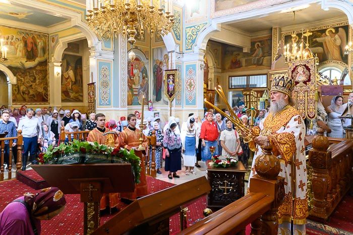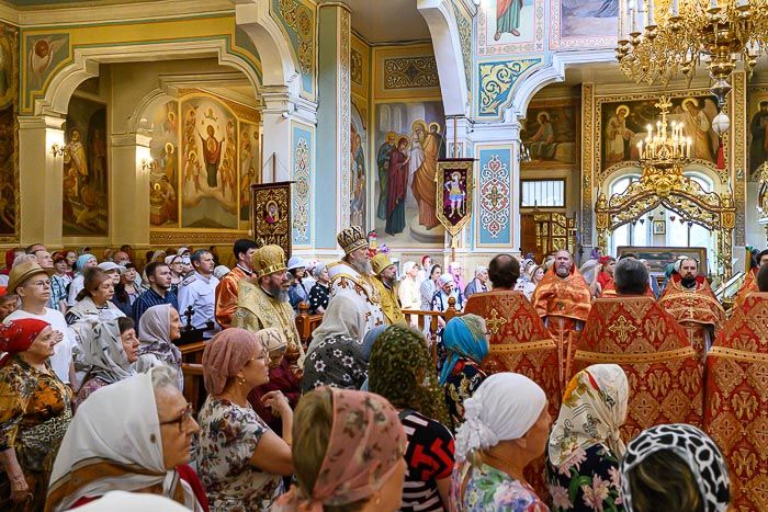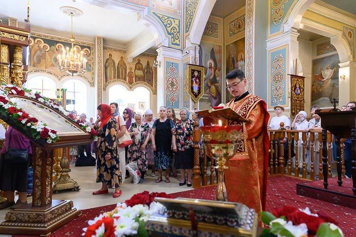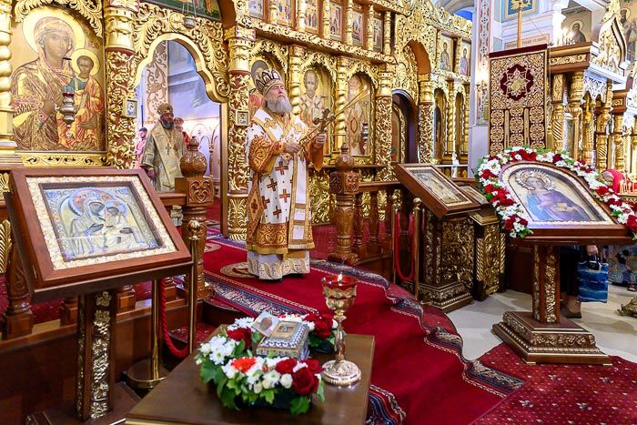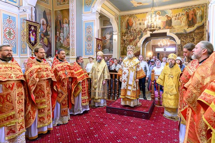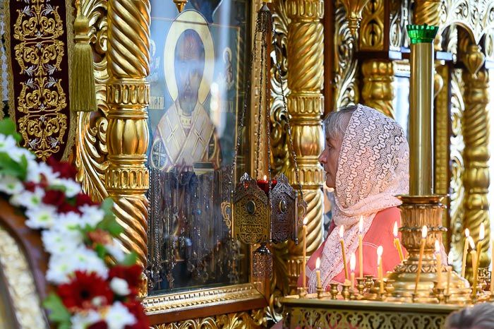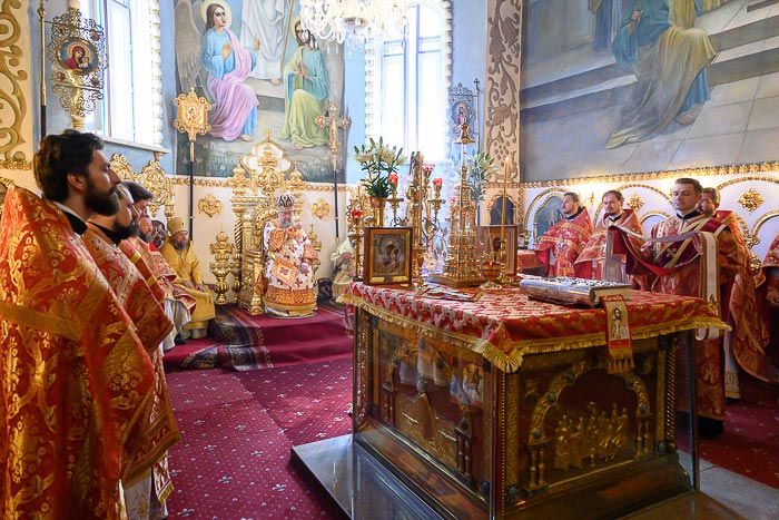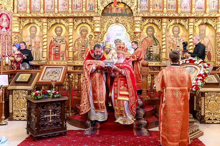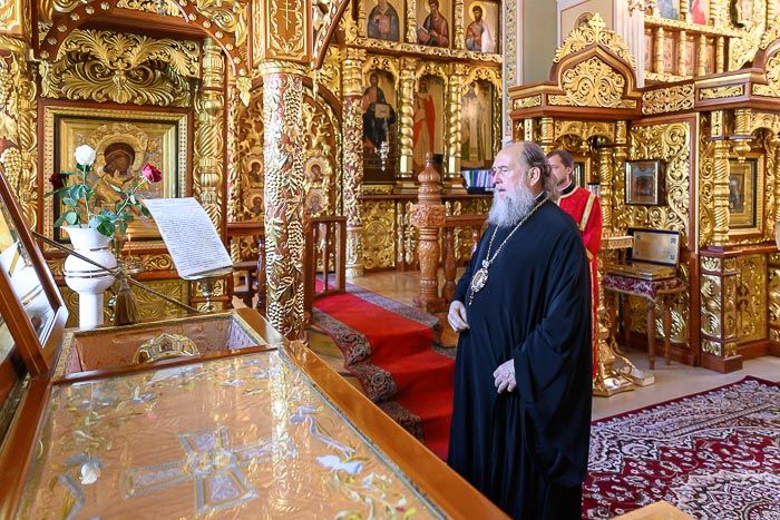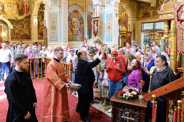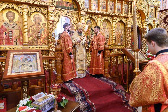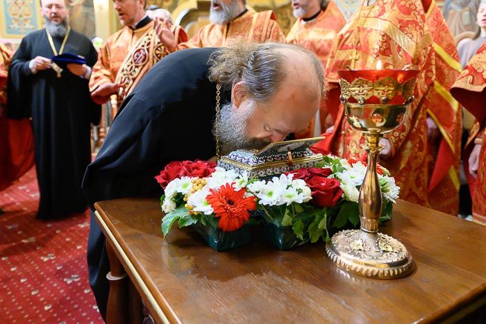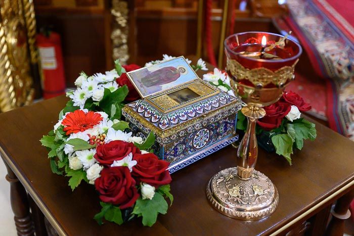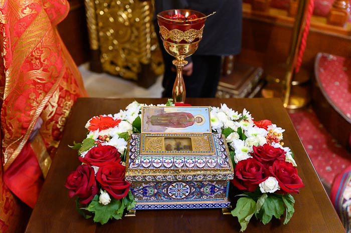 В завершение Литургии состоялось славление великомученику Пантелеимону перед его иконой и ковчегом с частью главы святого целителя, хранящейся в Никольском соборе.