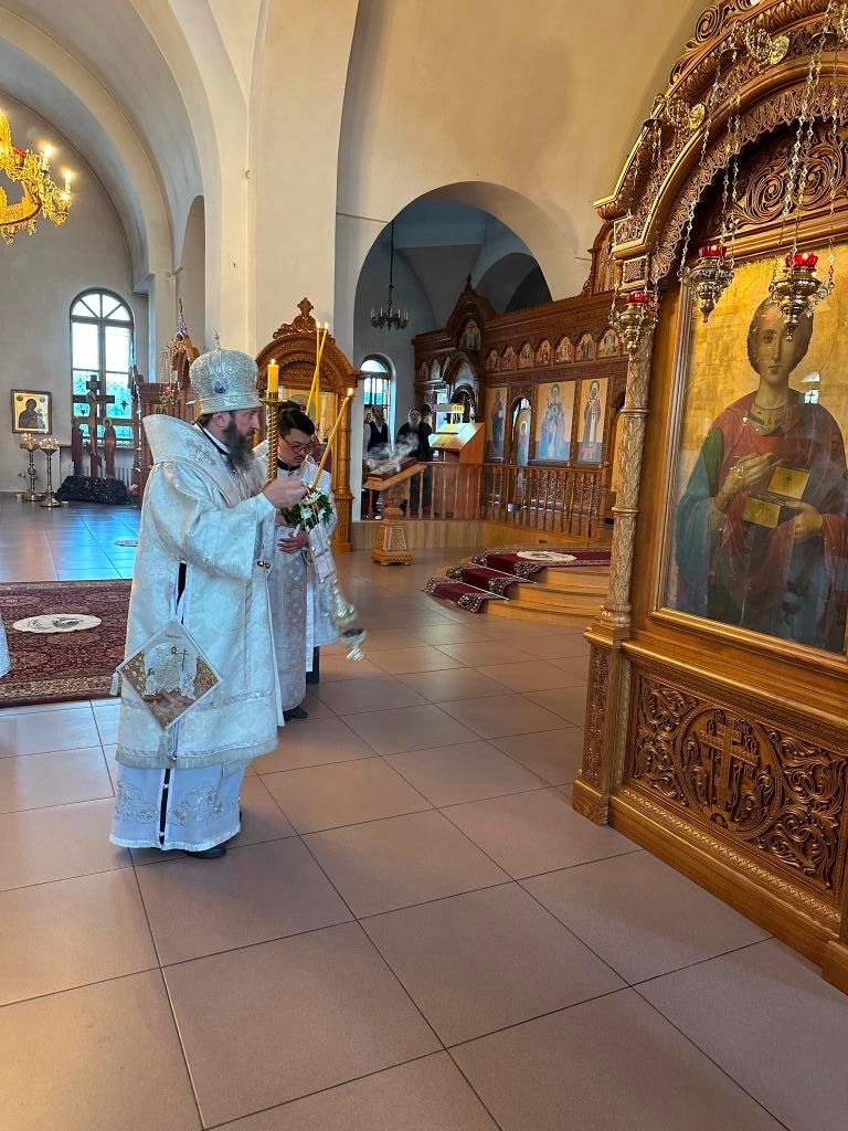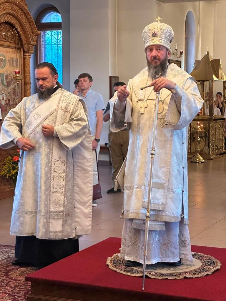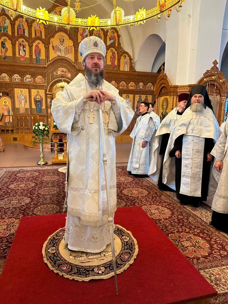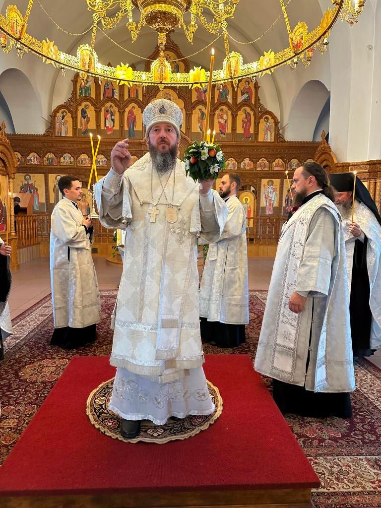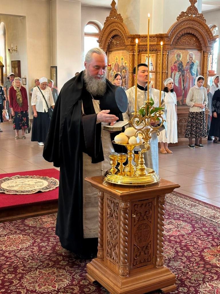 За богослужением совершалась лития – сугубое моление с освящением хлеба, пшеницы, вина и елея. После чтения праздничного евангельского зачала архиепископ Амфилохий помазал клир и паству освященным елеем.