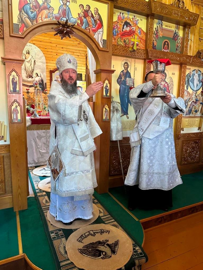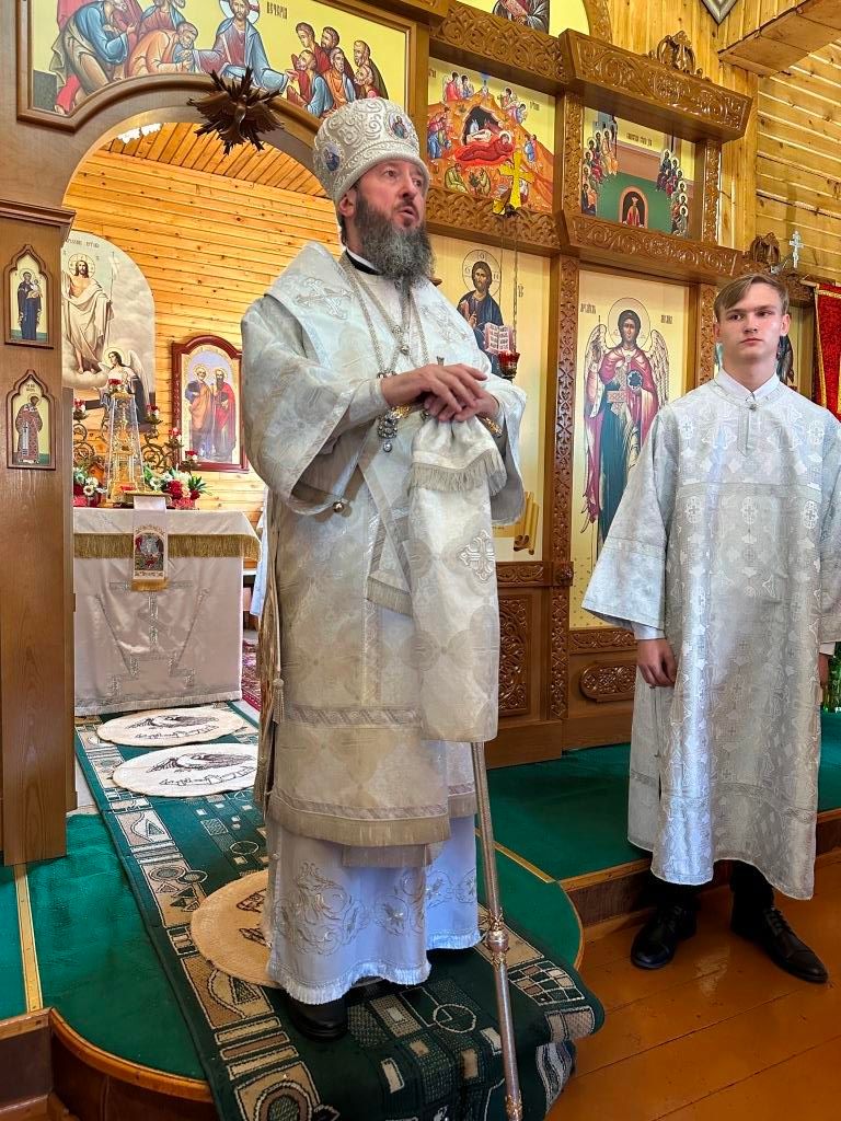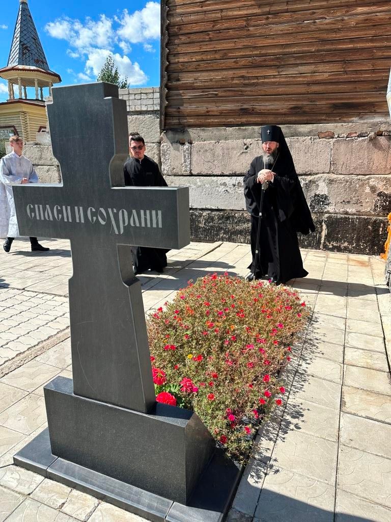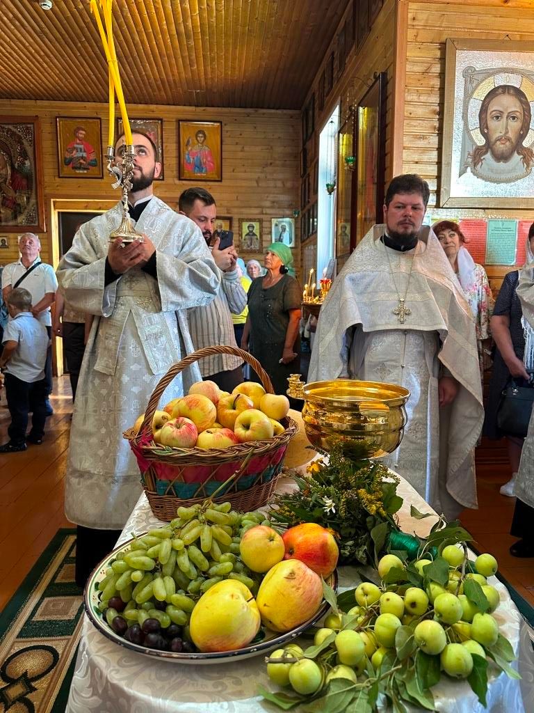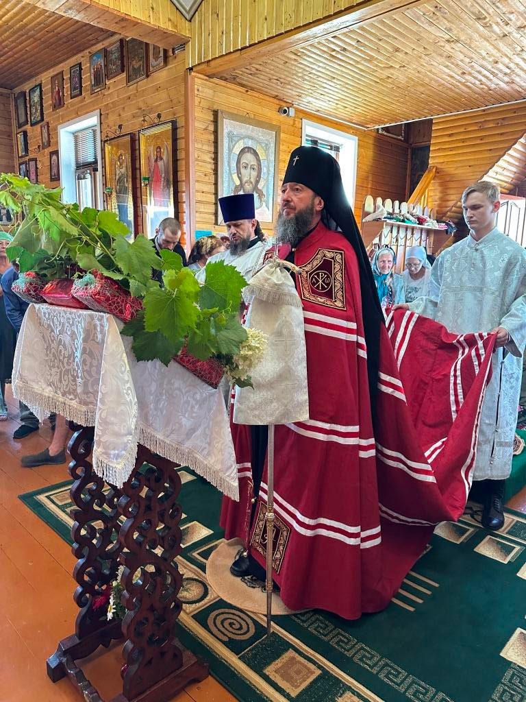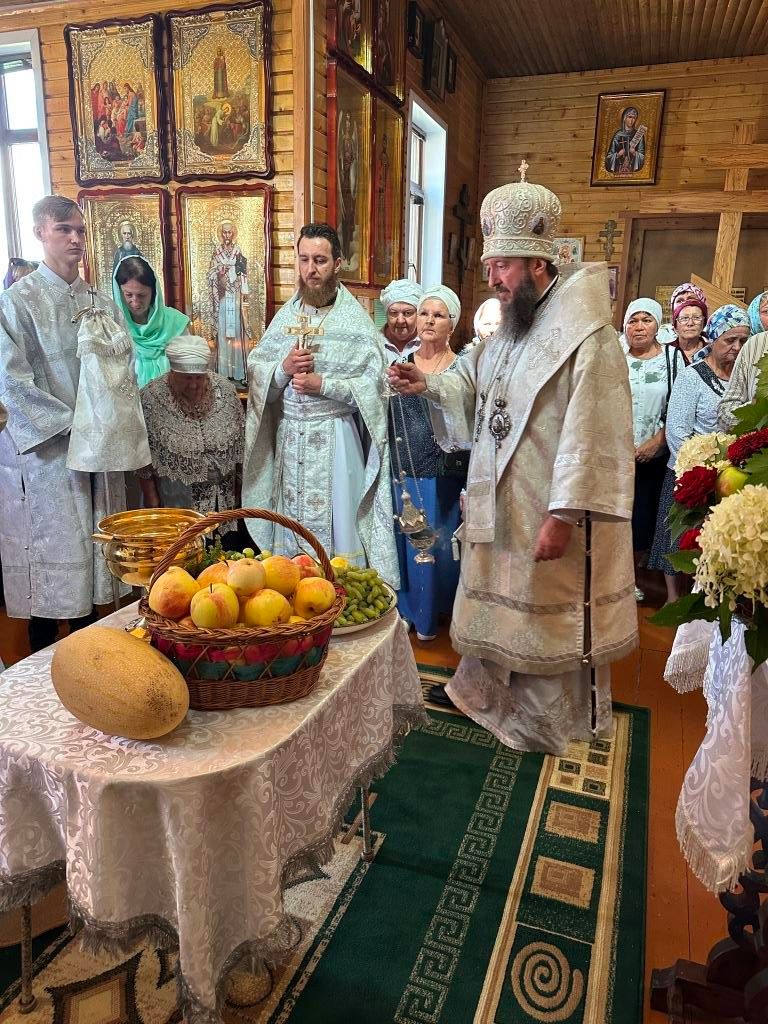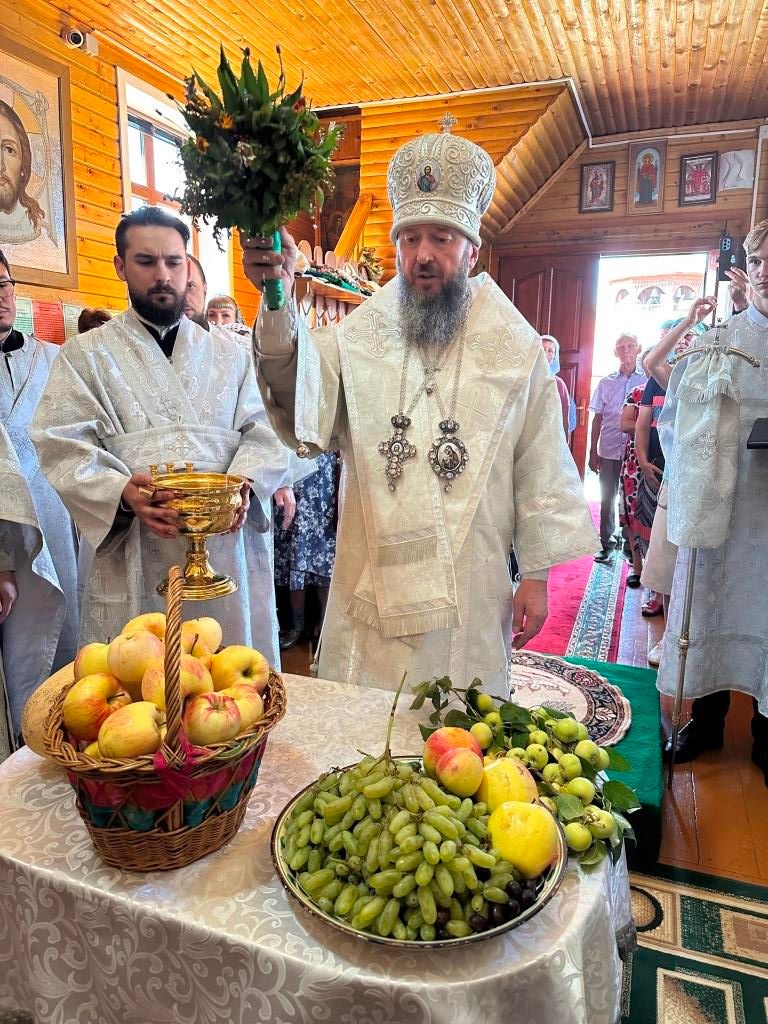 В завершение праздничной Божественной Литургии архипастырь вознес молитву и окропил святой водой плоды нового урожая. На могиле строителя Преображенского храма иерея Виктора Калины была отслужена заупокойная лития.