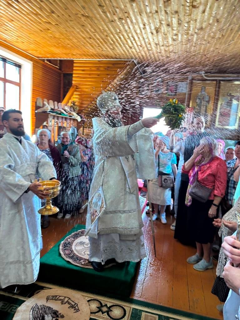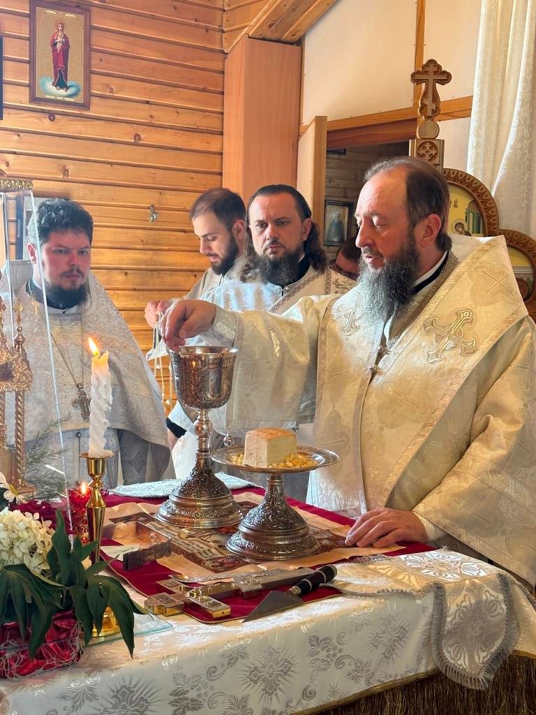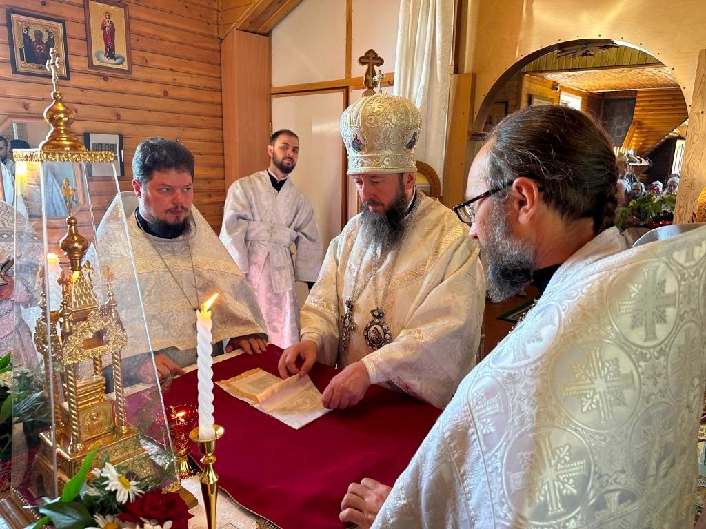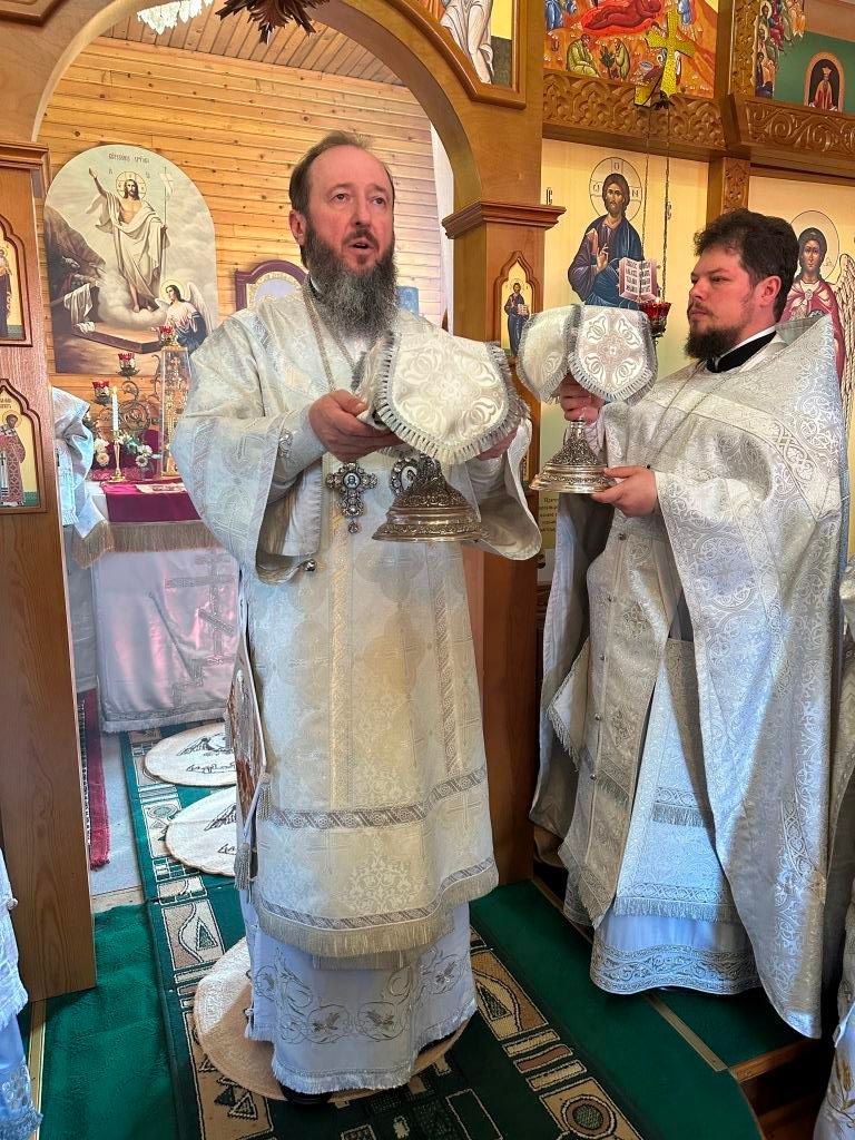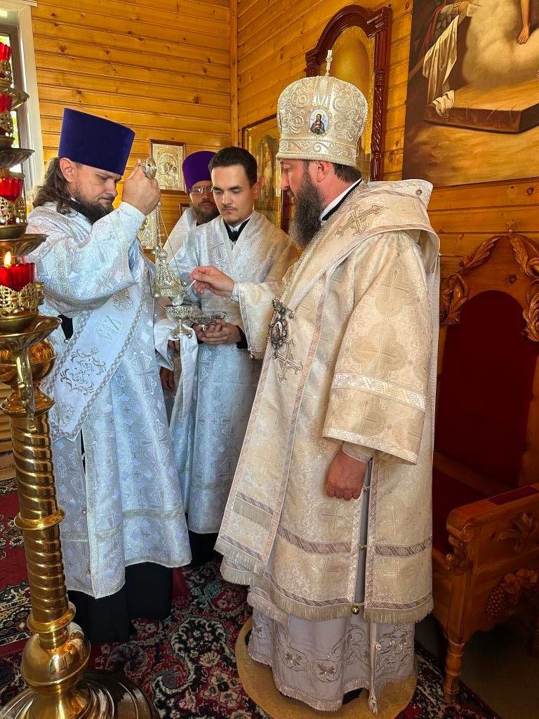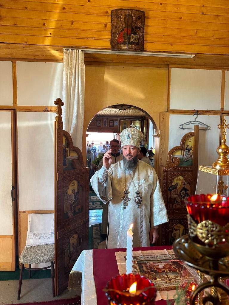 В завершение праздничной Божественной Литургии архипастырь вознес молитву и окропил святой водой плоды нового урожая. На могиле строителя Преображенского храма иерея Виктора Калины была отслужена заупокойная лития.