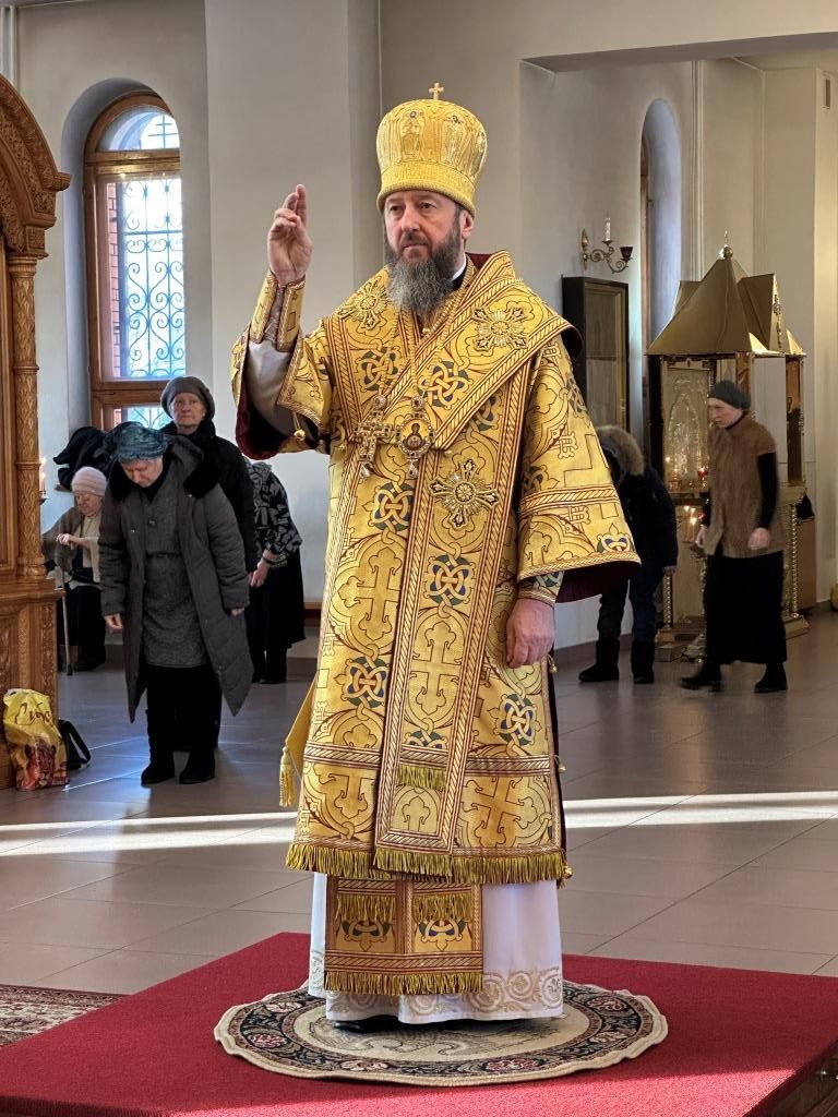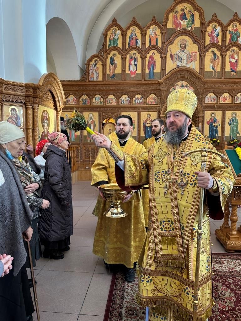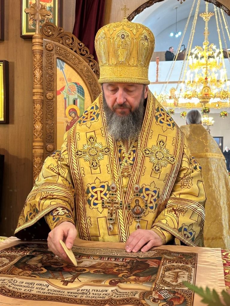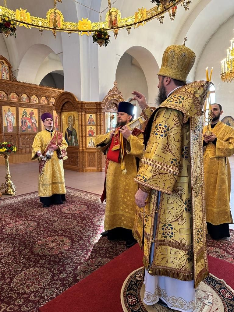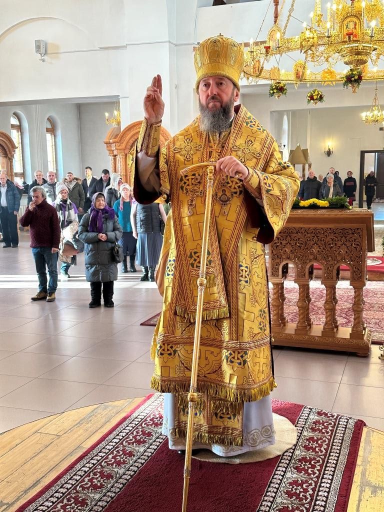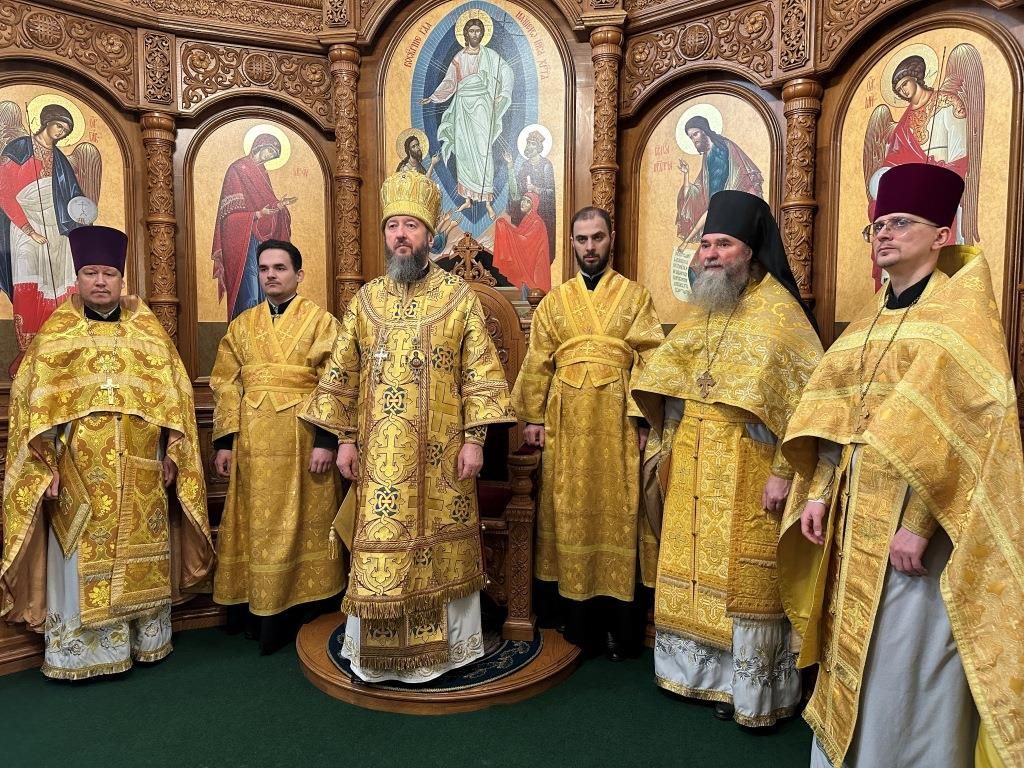 Его Высокопреосвященству сослужили: ключарь кафедрального собора иеромонах Никодим (Авдеев), клирики собора иерей Роман Подрезов и иерей Константин Дьяков, протодиакон Андрей Дудник, секретарь епархии диакон Илия Кван.