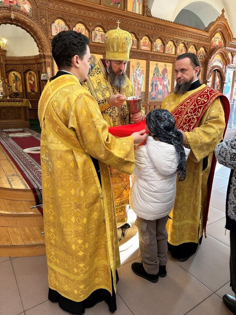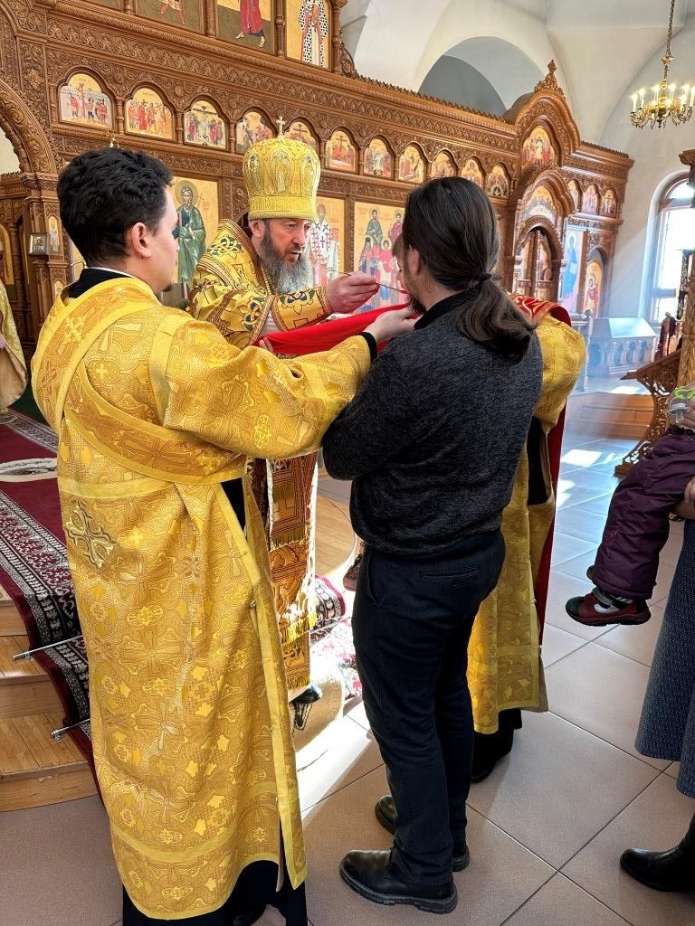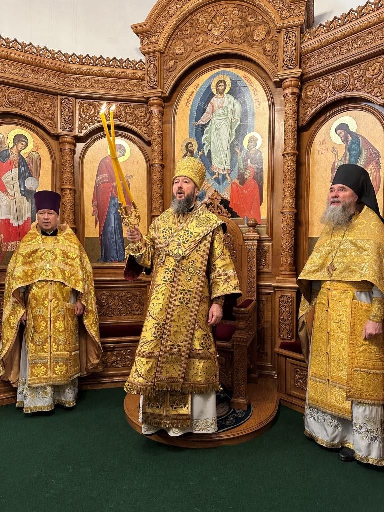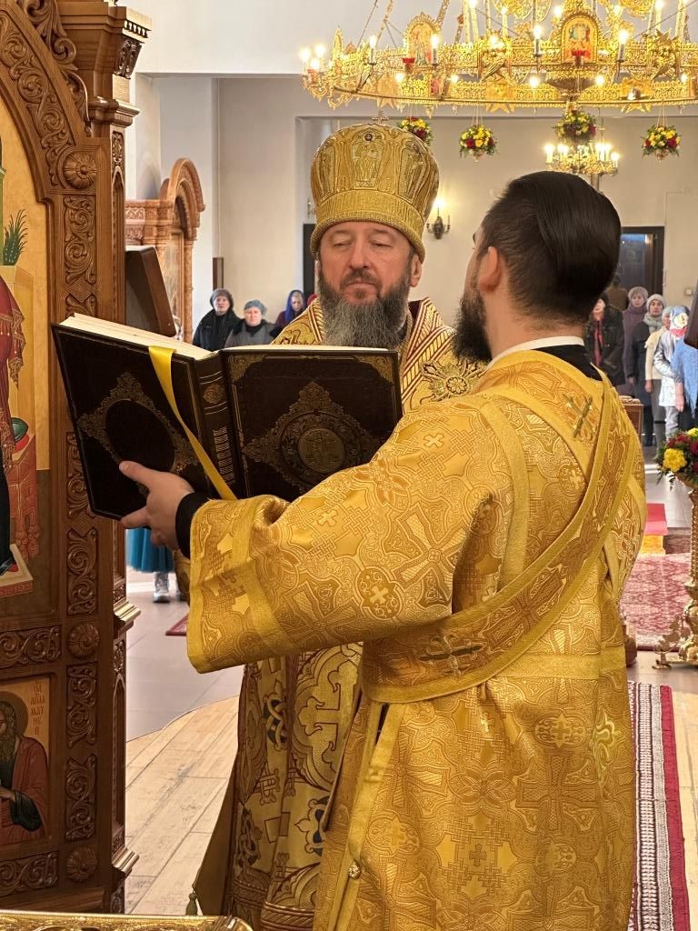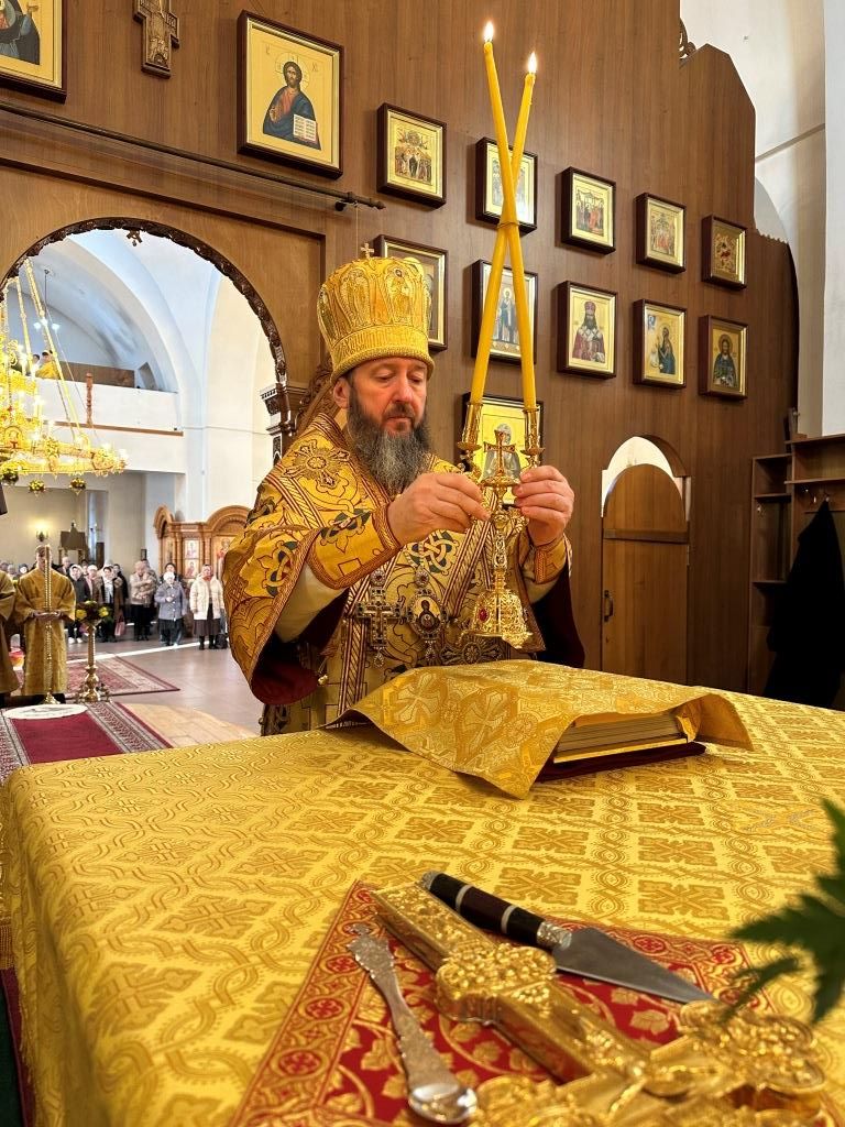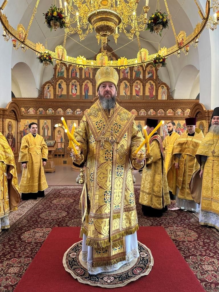 Его Высокопреосвященству сослужили: ключарь кафедрального собора иеромонах Никодим (Авдеев), клирики собора иерей Роман Подрезов и иерей Константин Дьяков, протодиакон Андрей Дудник, секретарь епархии диакон Илия Кван.