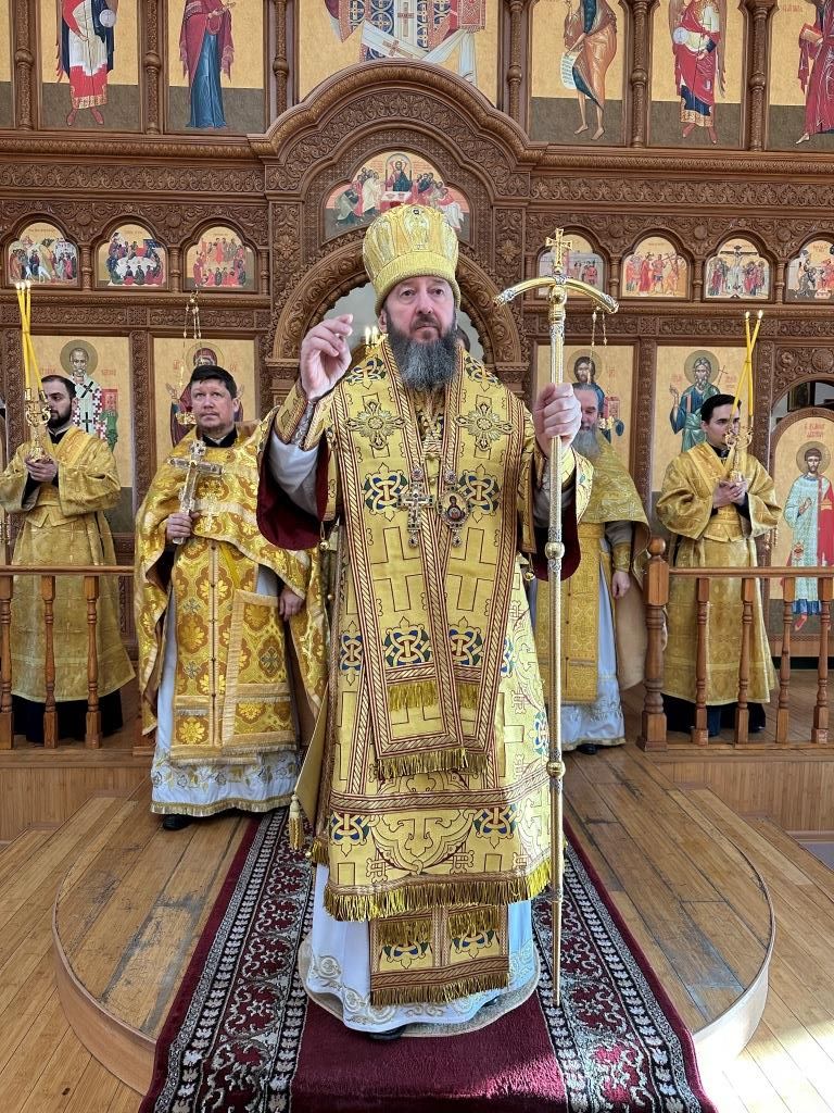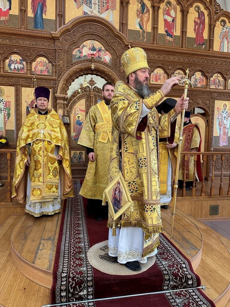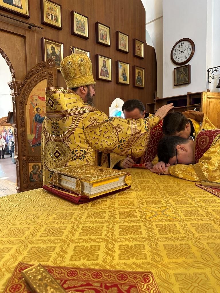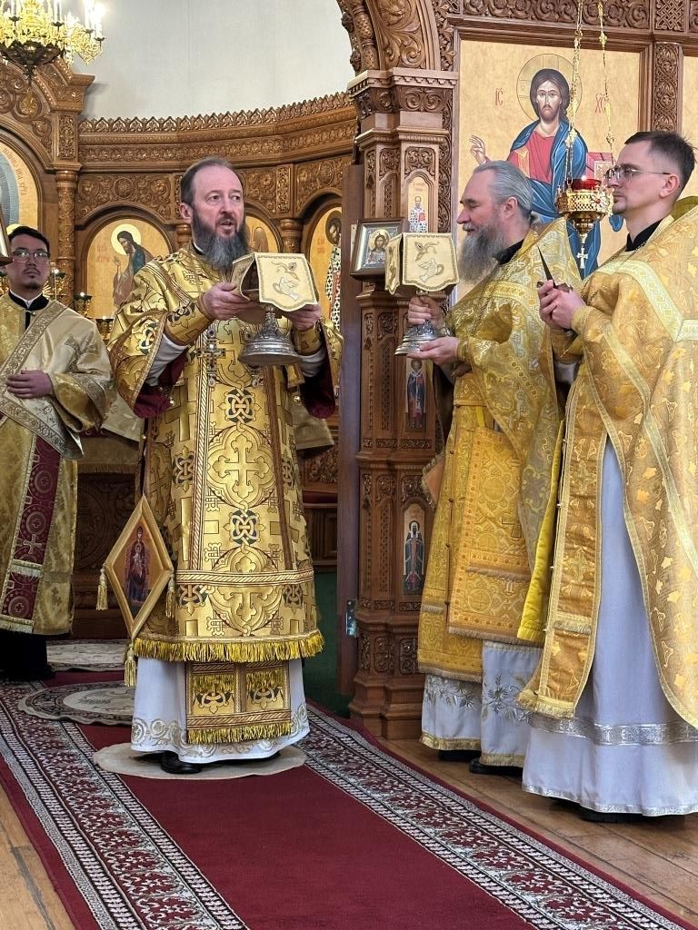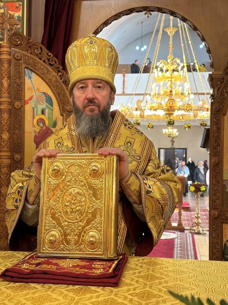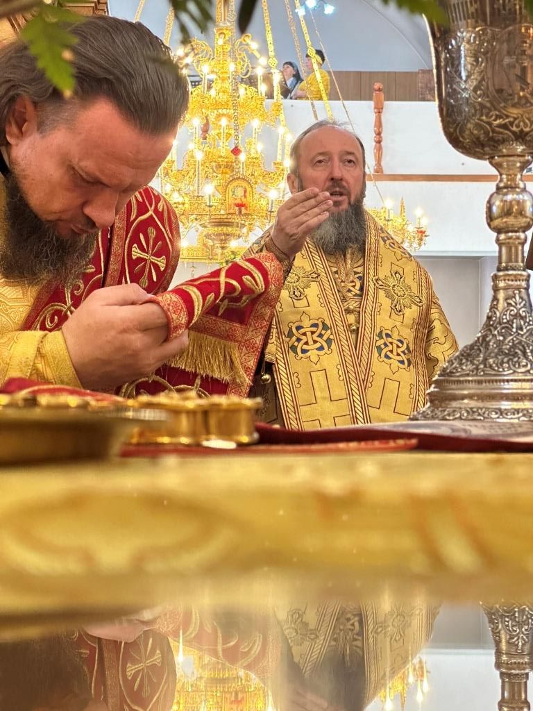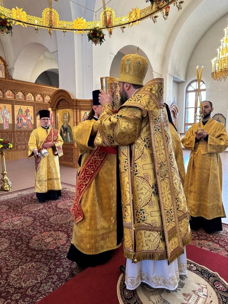 Его Высокопреосвященству сослужили: ключарь кафедрального собора иеромонах Никодим (Авдеев), клирики собора иерей Роман Подрезов и иерей Константин Дьяков, протодиакон Андрей Дудник, секретарь епархии диакон Илия Кван.