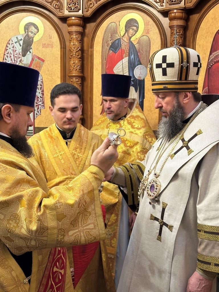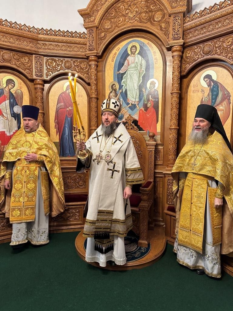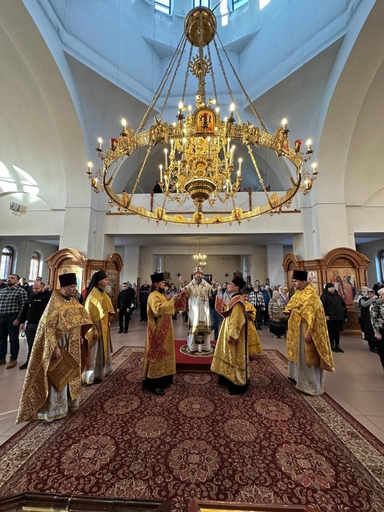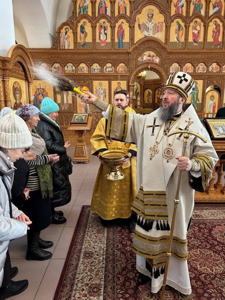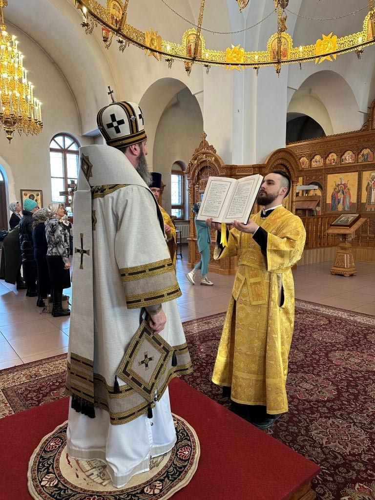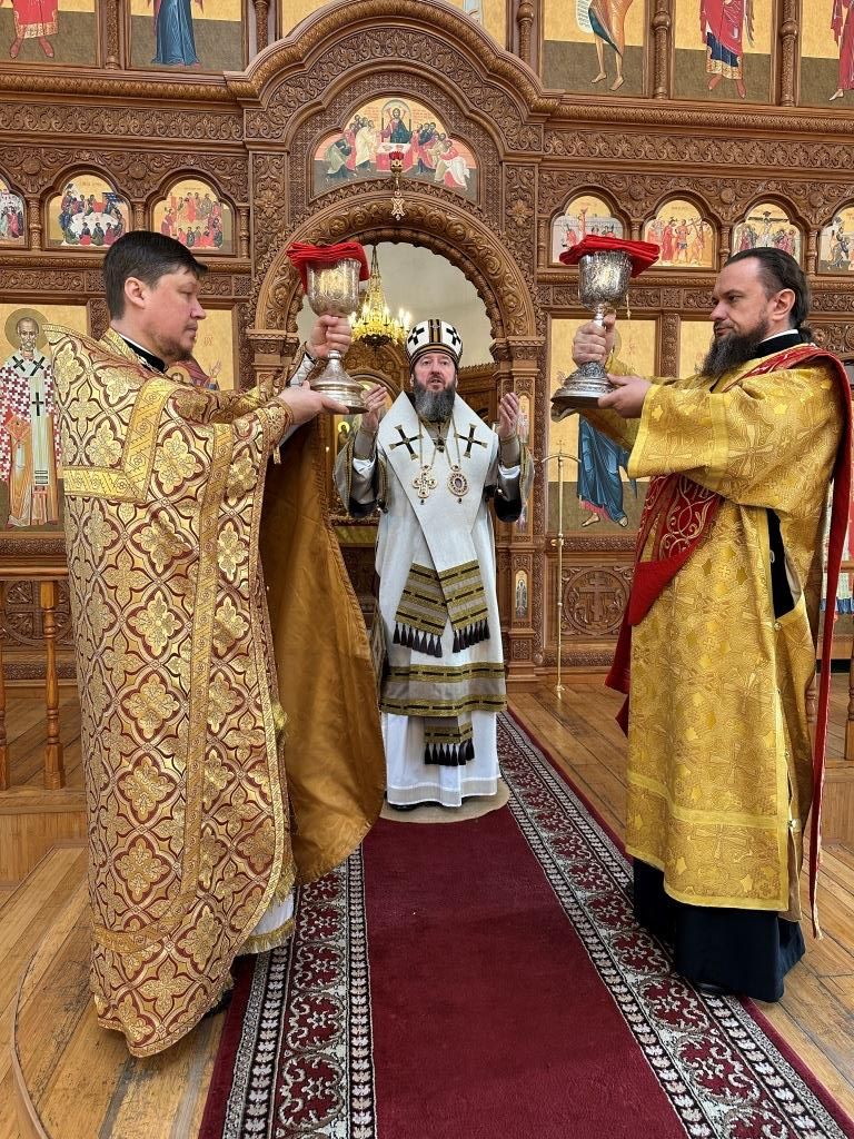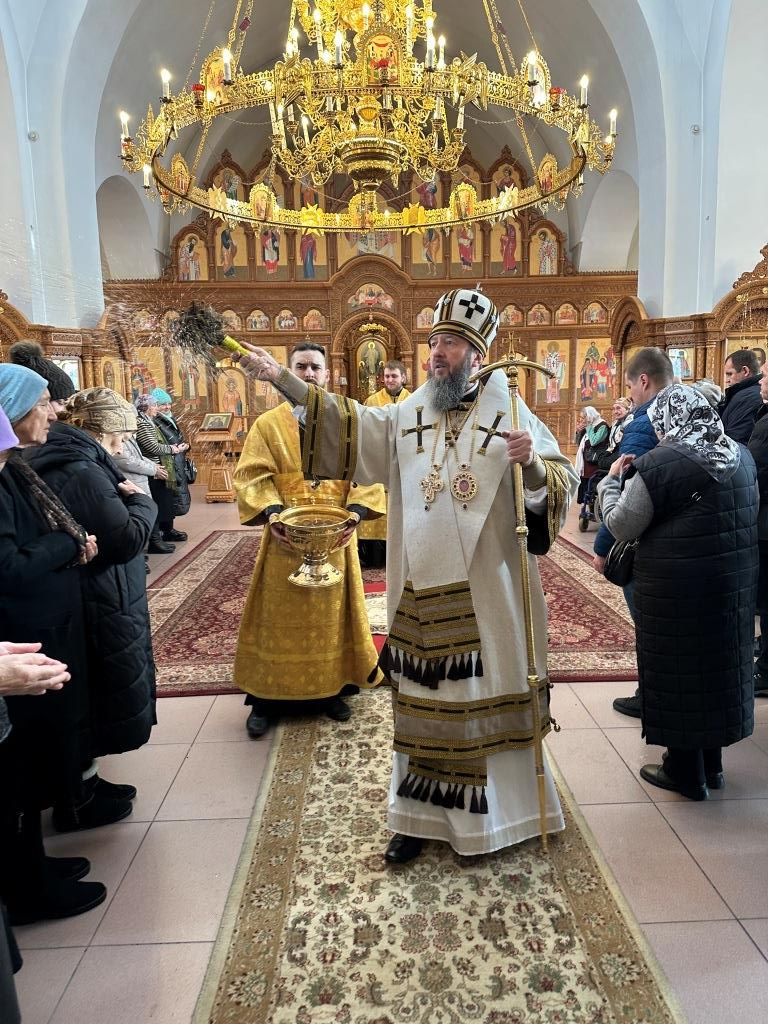 Его Высокопреосвященству сослужили: ключарь кафедрального собора иеромонах Никодим (Авдеев), клирики собора иерей Виталий Адаменков и иерей Роман Подрезов, протодиакон Андрей Дудник, секретарь епархии диакон Илия Кван.
