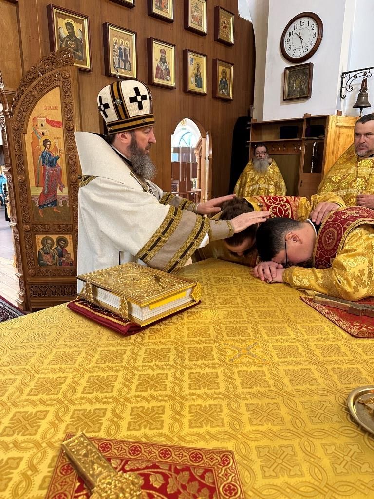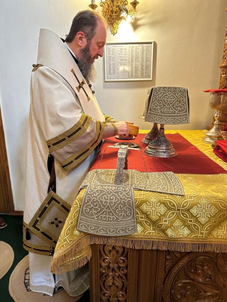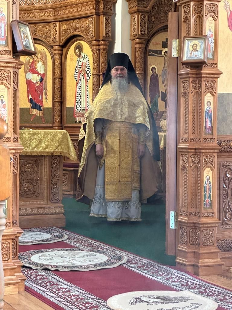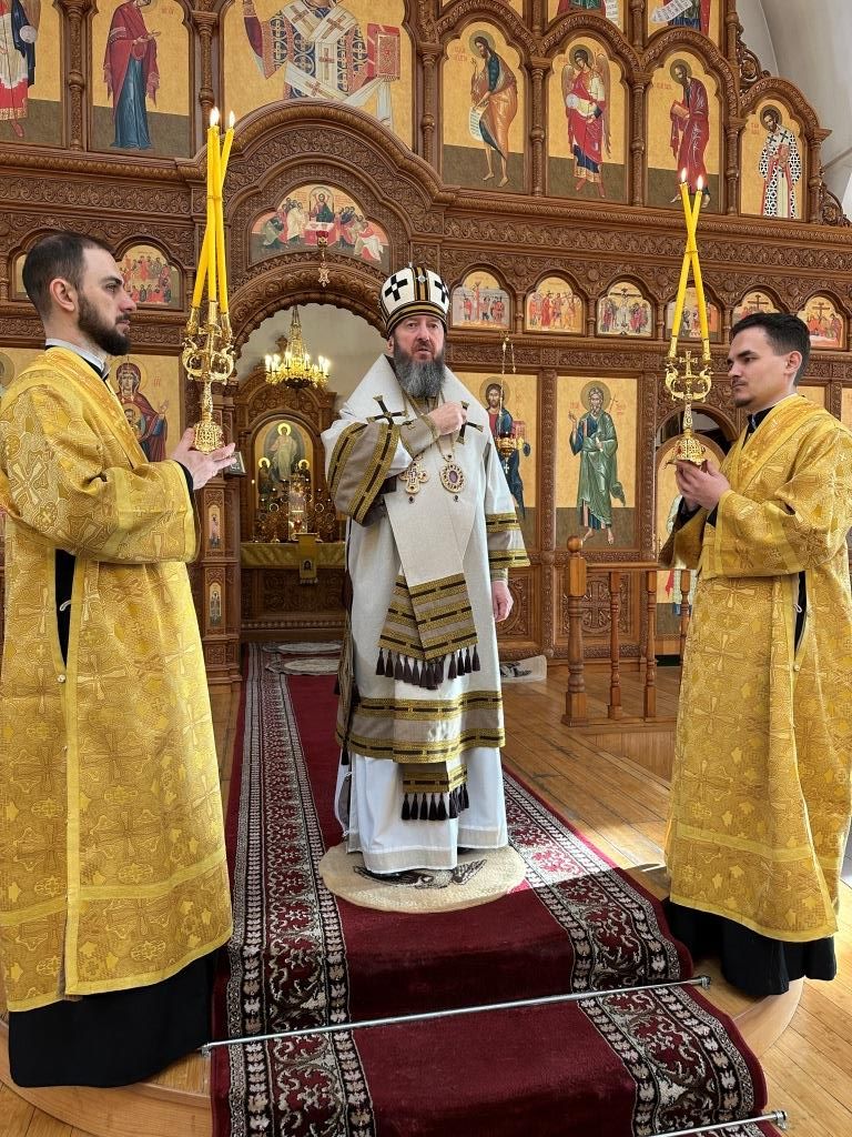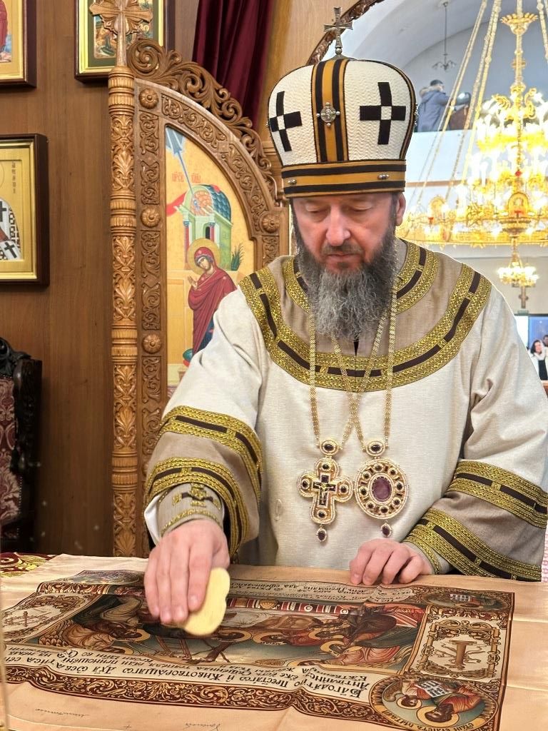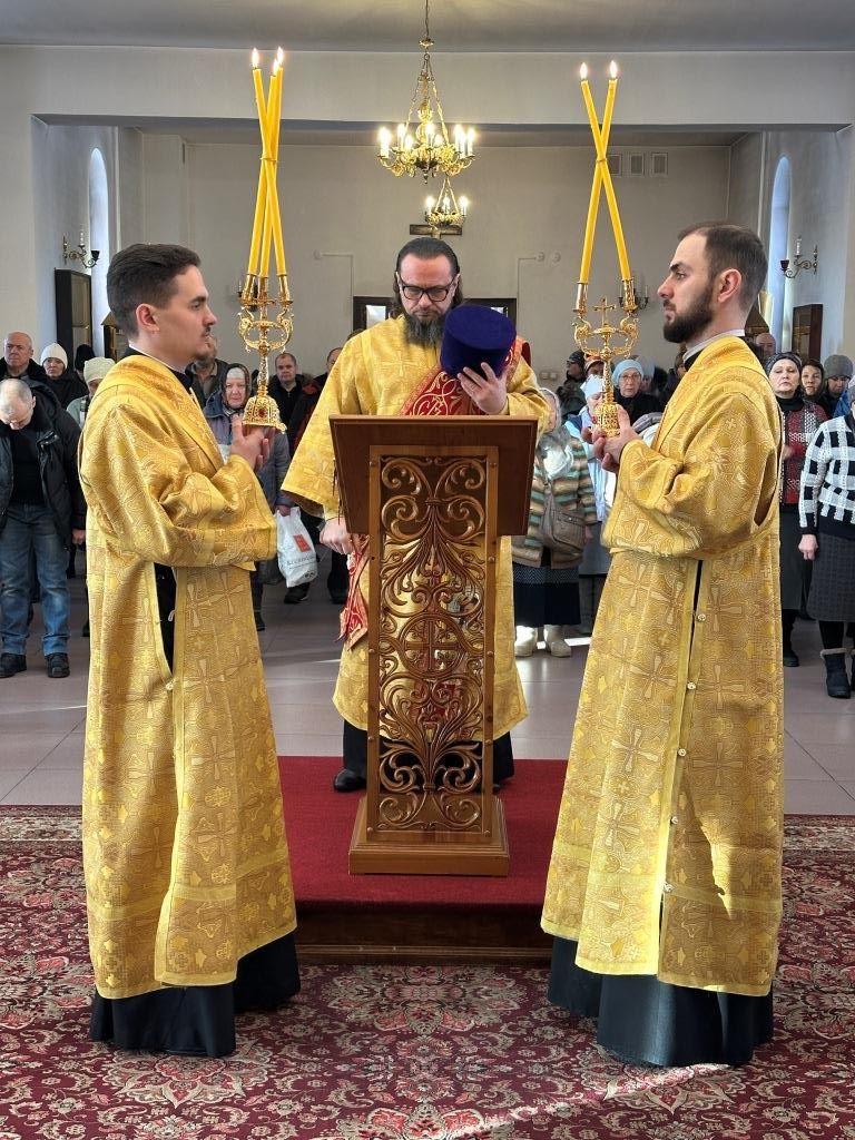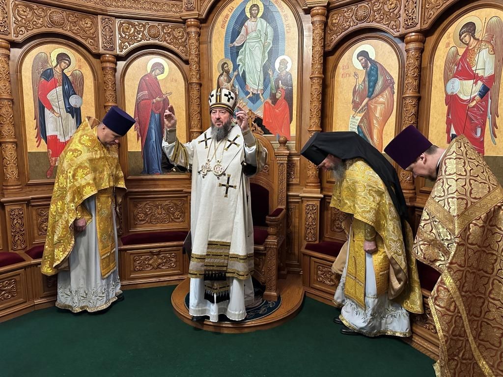 Его Высокопреосвященству сослужили: ключарь кафедрального собора иеромонах Никодим (Авдеев), клирики собора иерей Виталий Адаменков и иерей Роман Подрезов, протодиакон Андрей Дудник, секретарь епархии диакон Илия Кван.
