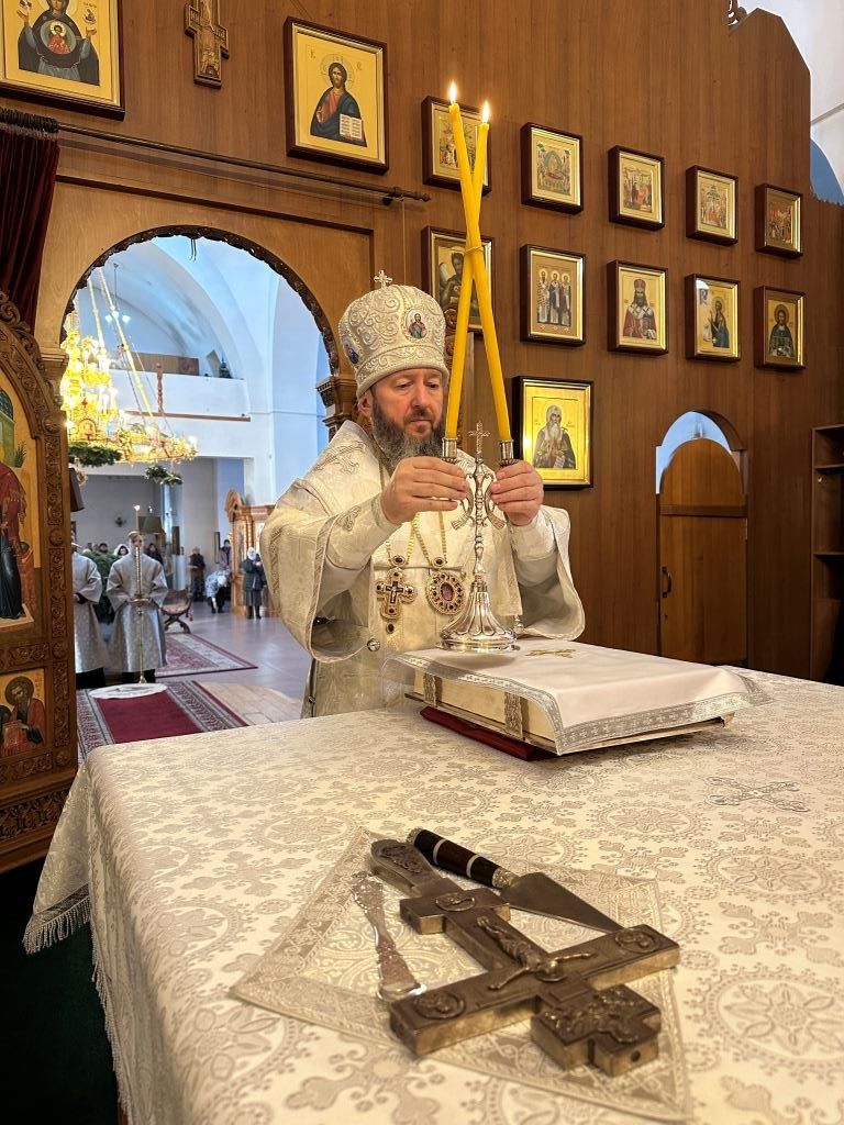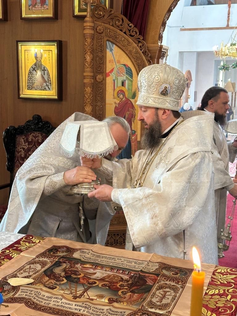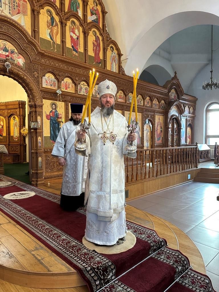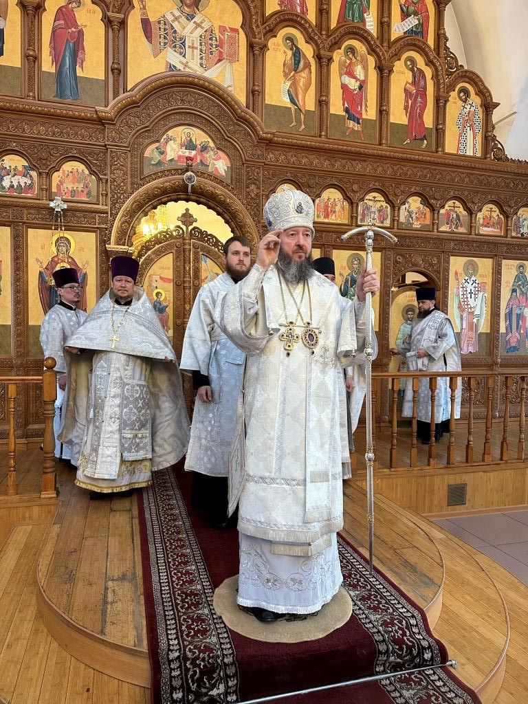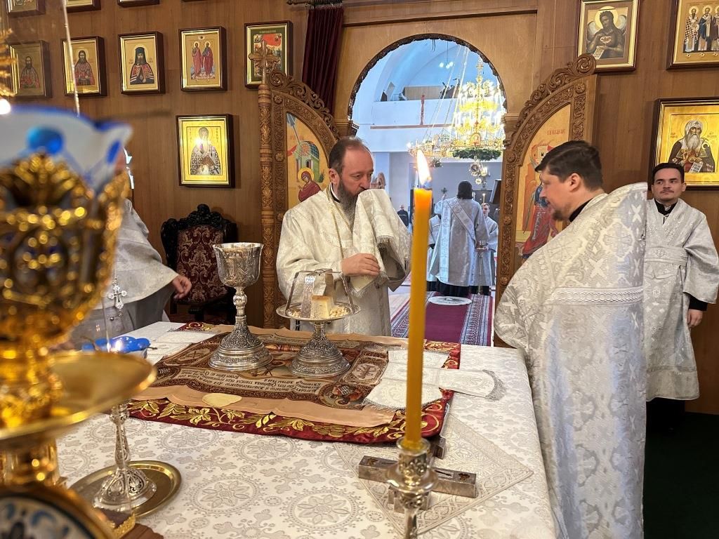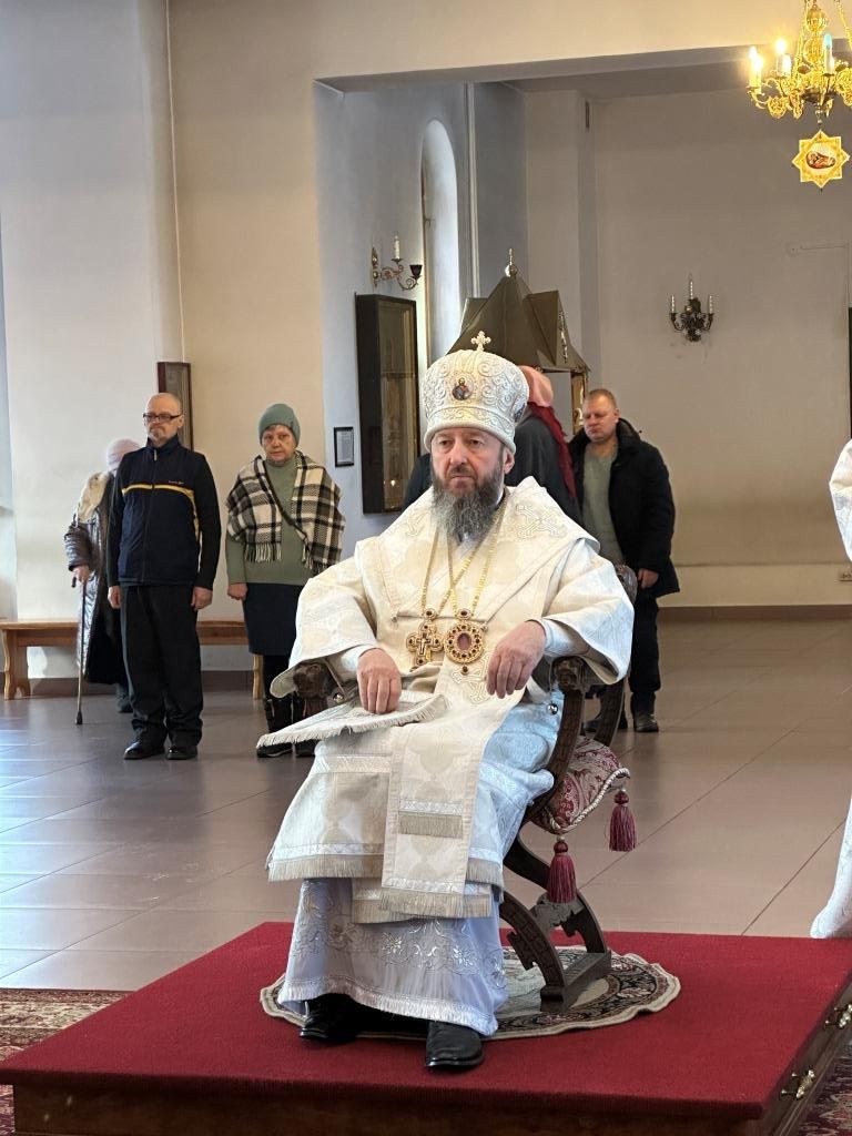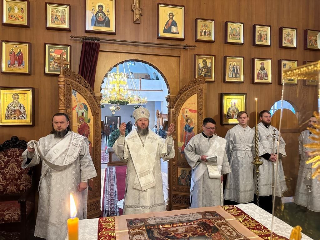 Его Высокопреосвященству сослужили: ключарь Андреевского собора иеромонах Никодим (Авдеев), клирики собора иерей Роман Подрезов, иерей Константин Дьяков, протодиакон Андрей Дудник, секретарь епархии диакон Илия Кван.