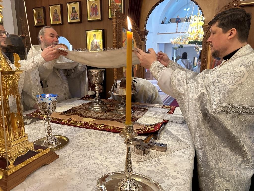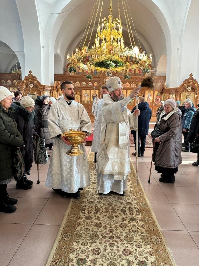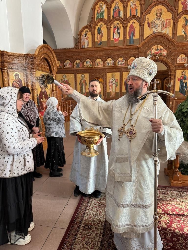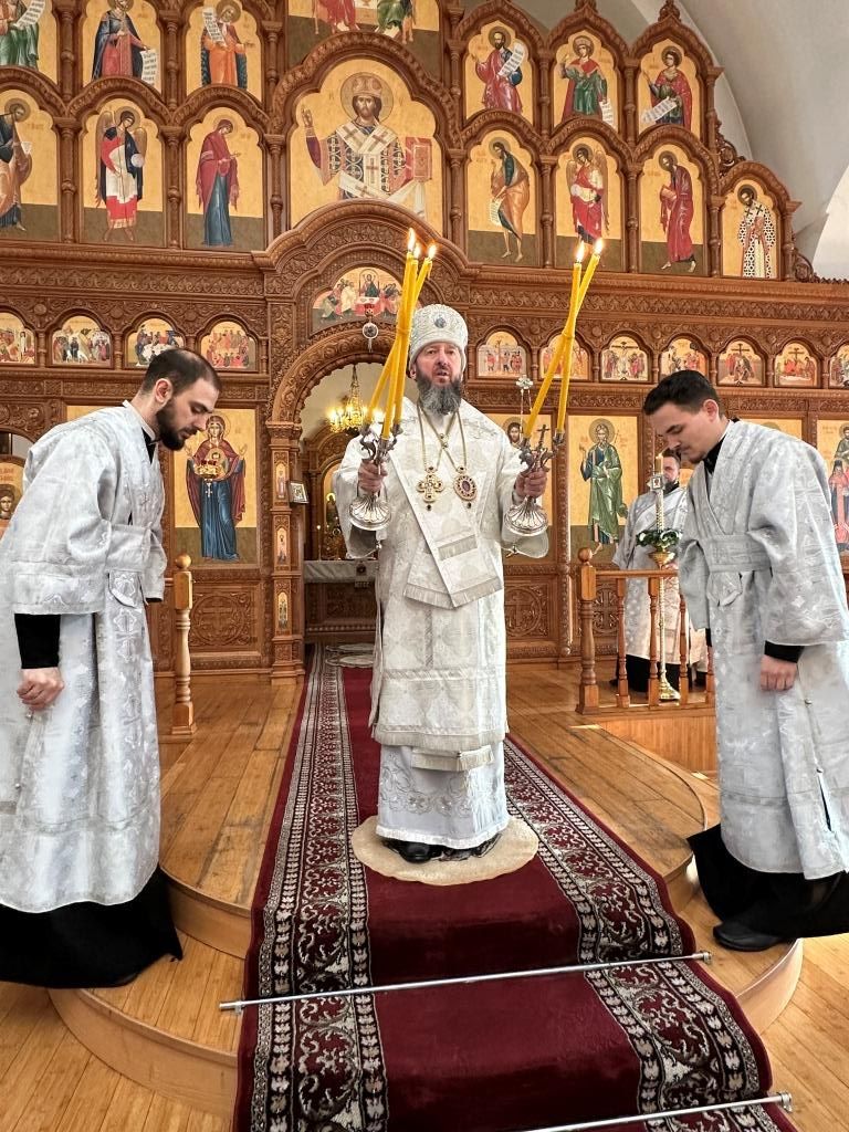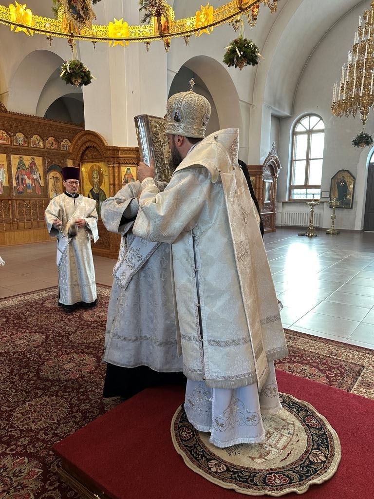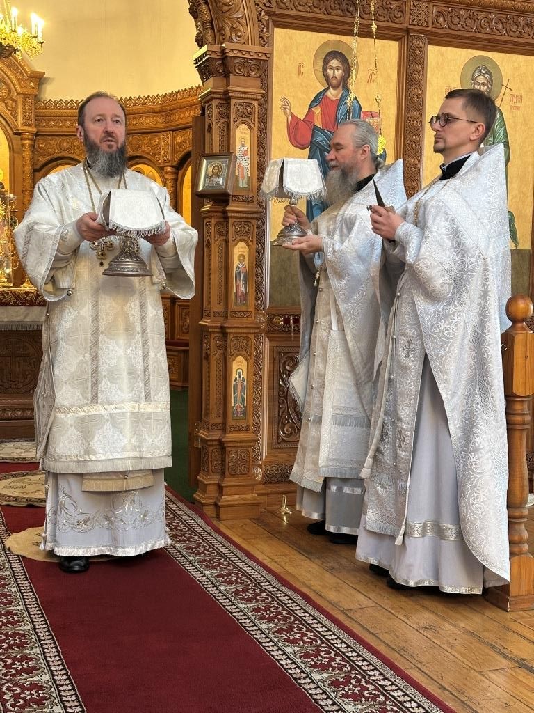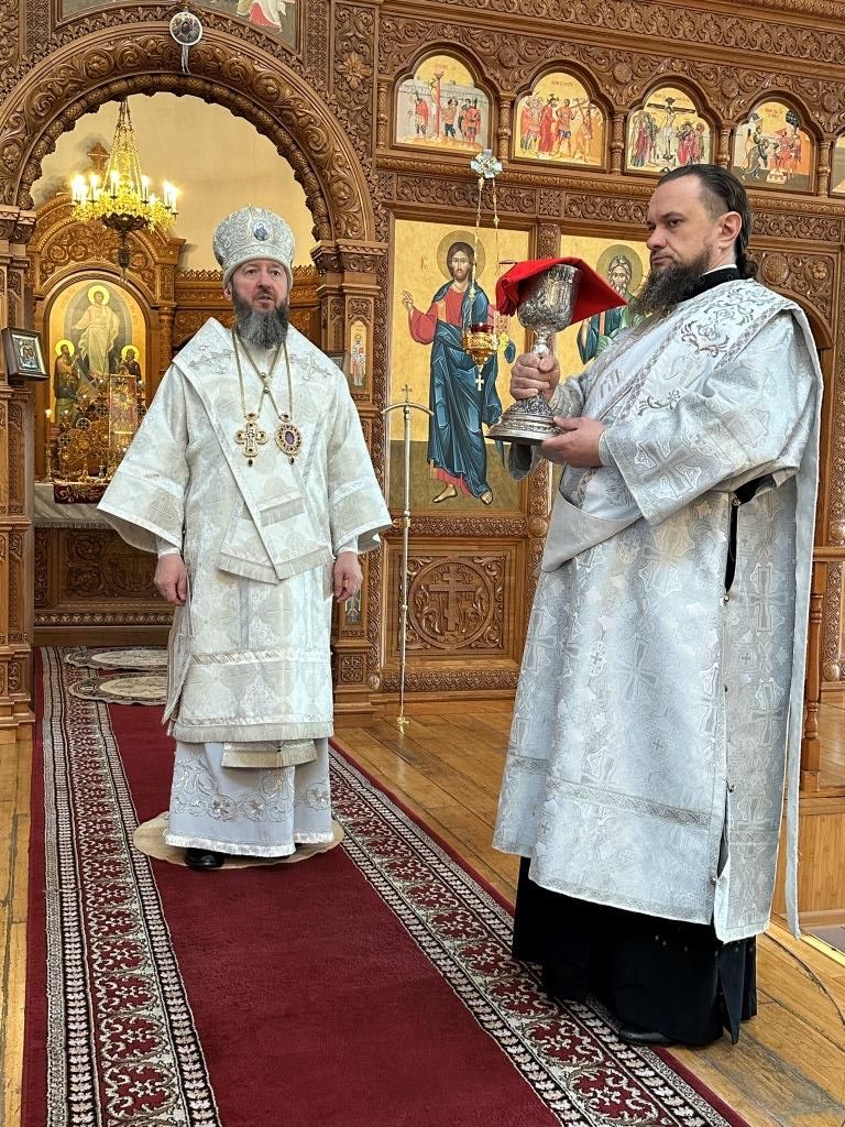 Его Высокопреосвященству сослужили: ключарь Андреевского собора иеромонах Никодим (Авдеев), клирики собора иерей Роман Подрезов, иерей Константин Дьяков, протодиакон Андрей Дудник, секретарь епархии диакон Илия Кван.
