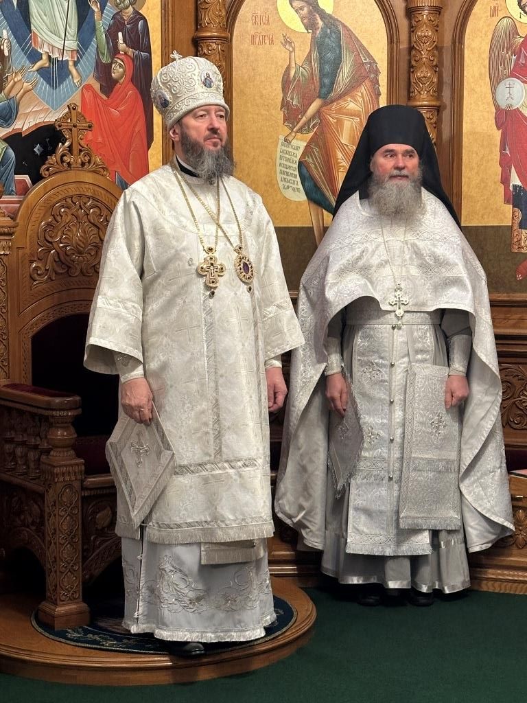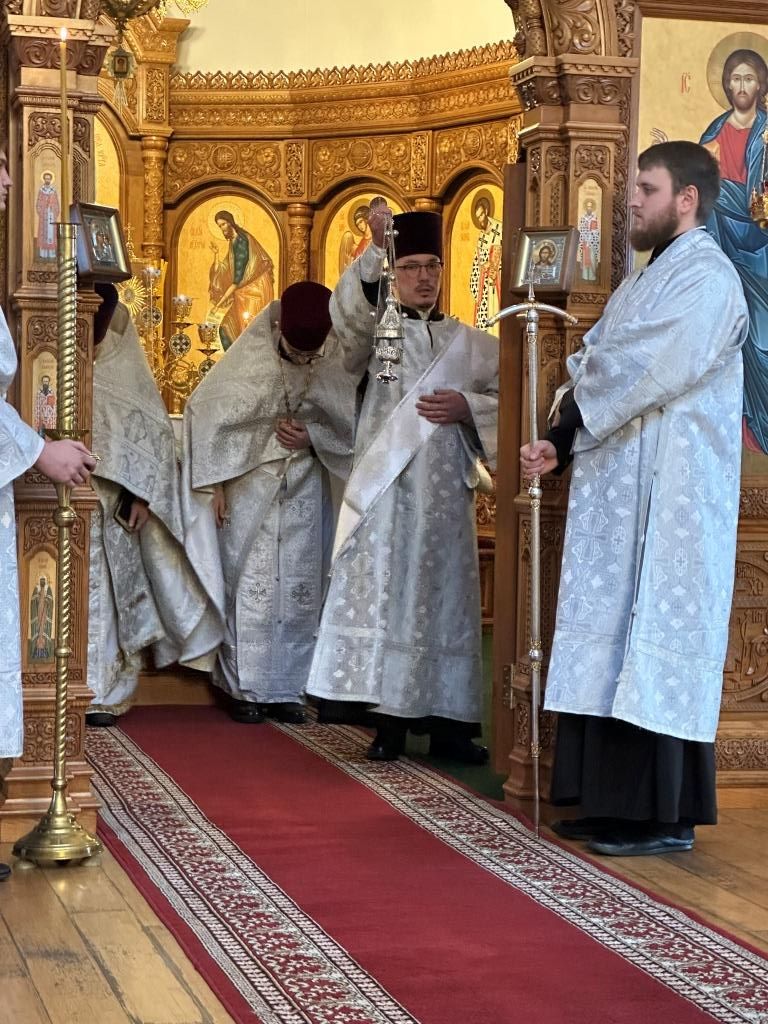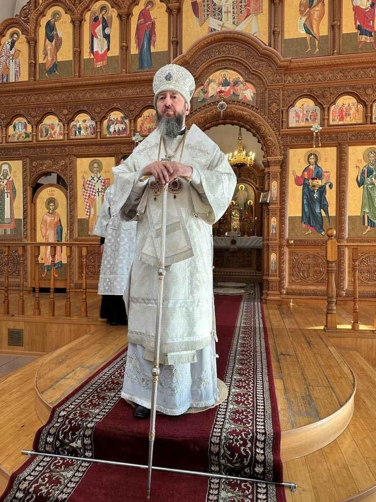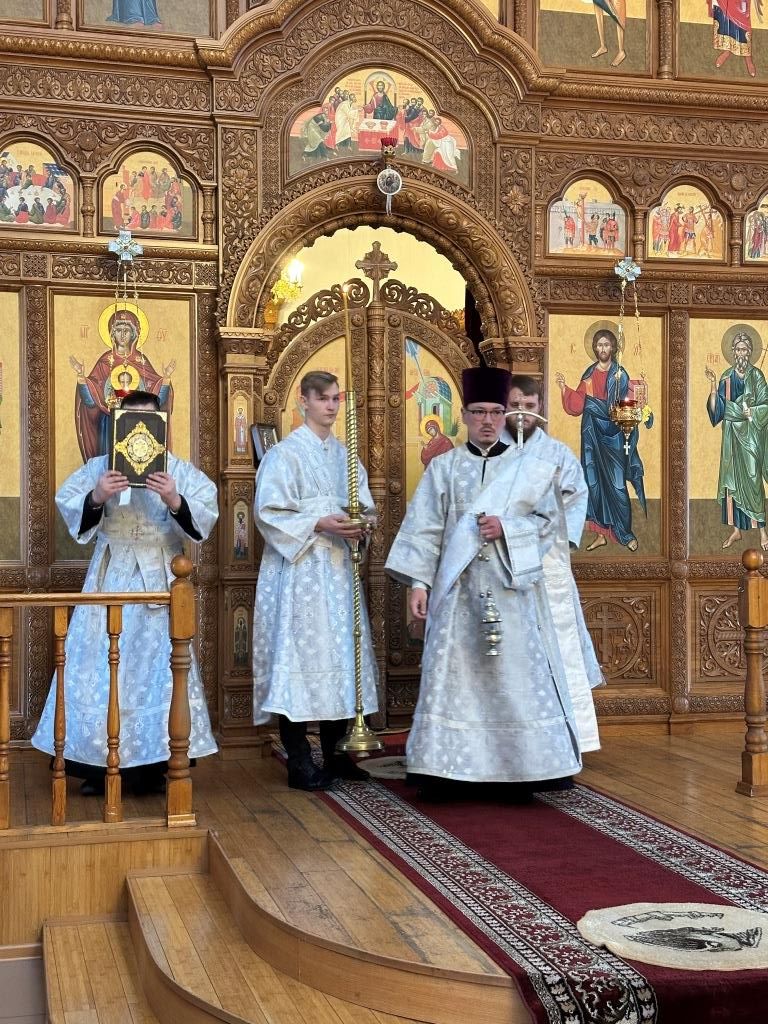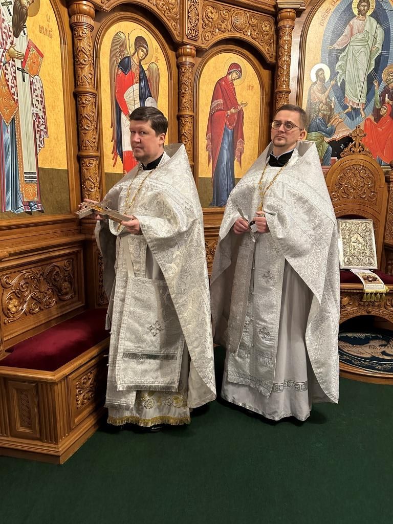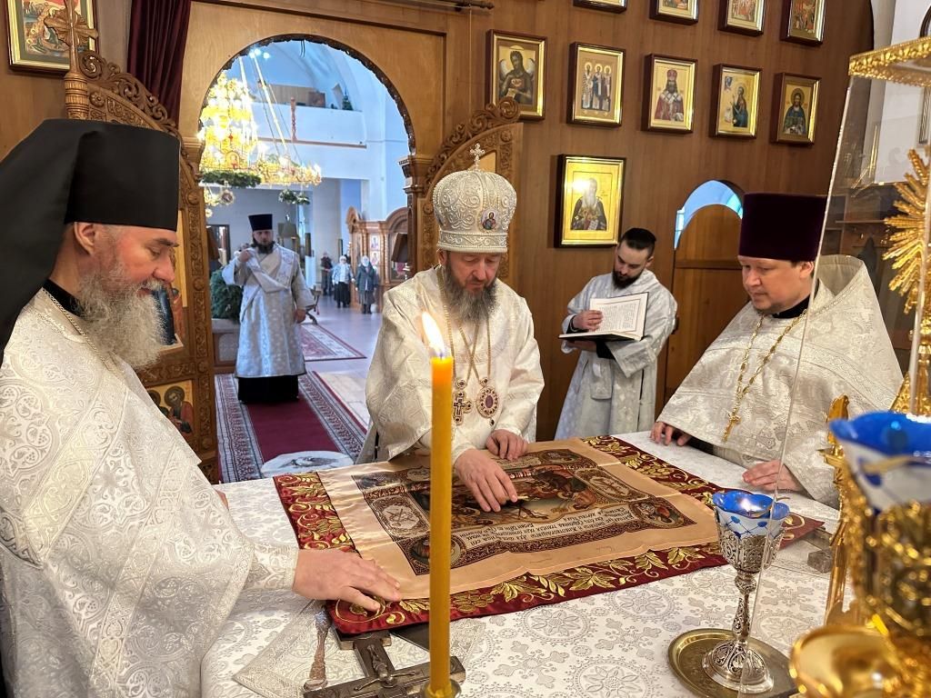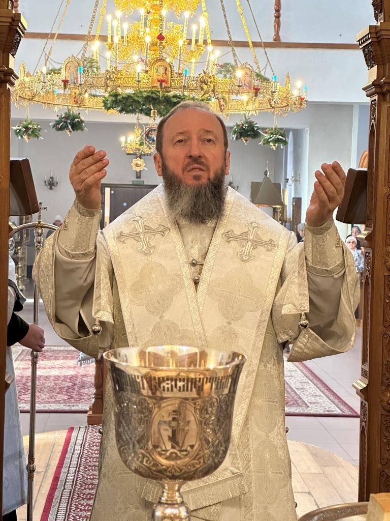 Его Высокопреосвященству сослужили: ключарь Андреевского собора иеромонах Никодим (Авдеев), клирики собора иерей Роман Подрезов, иерей Константин Дьяков, протодиакон Андрей Дудник, секретарь епархии диакон Илия Кван.
