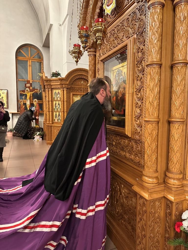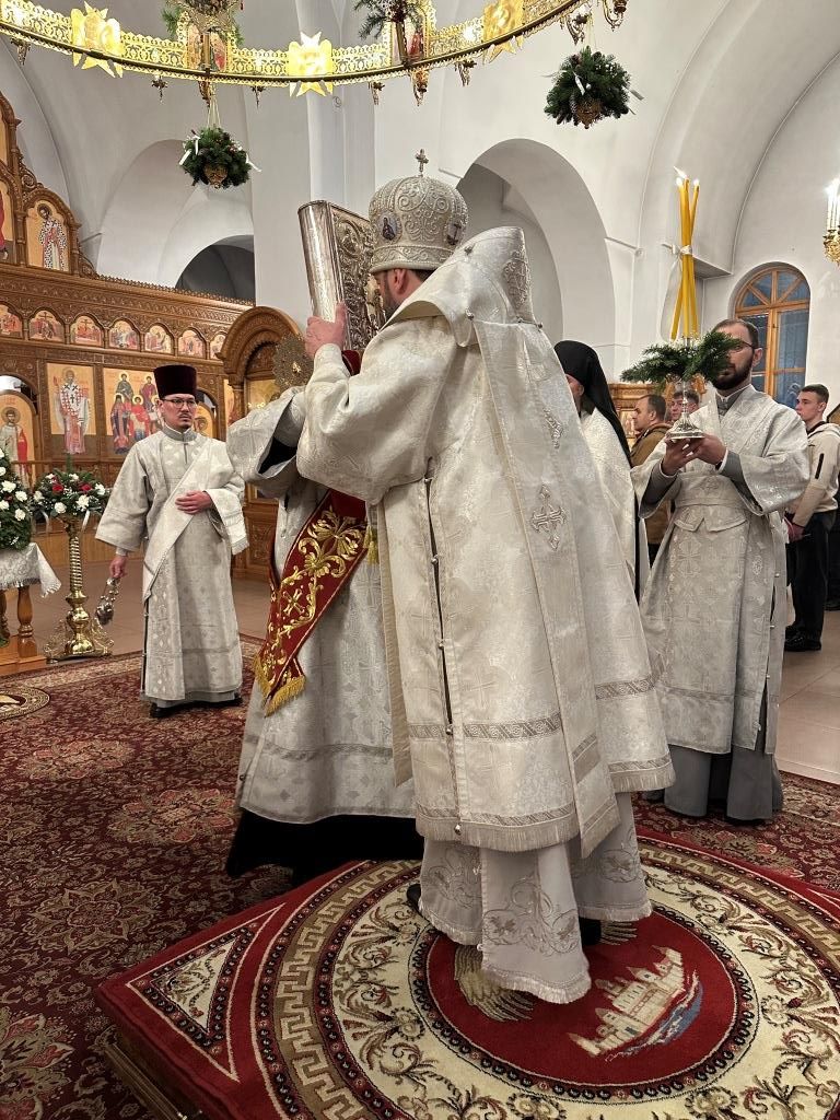 После окончания Божественной Литургии Архипастырь с духовенством и народом Божиим воспел славление Богомладенцу Иисусу у праздничной иконы. В завершение богослужения архиепископ Амфилохий поздравил всех собравшихся с Рождеством Христовым и обратился к прихожанам и паломникам со словами святительского наставления: