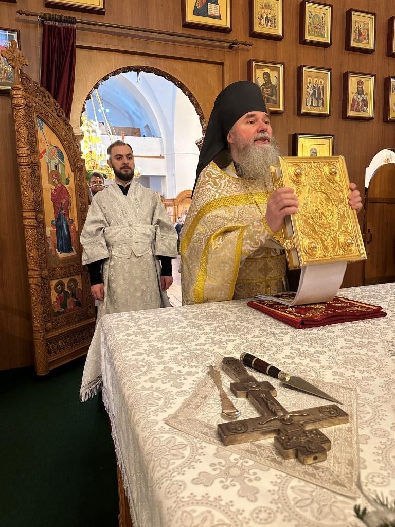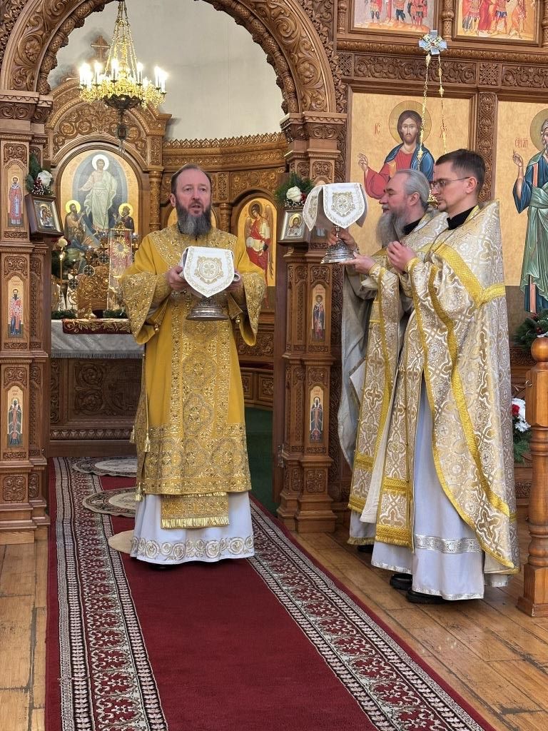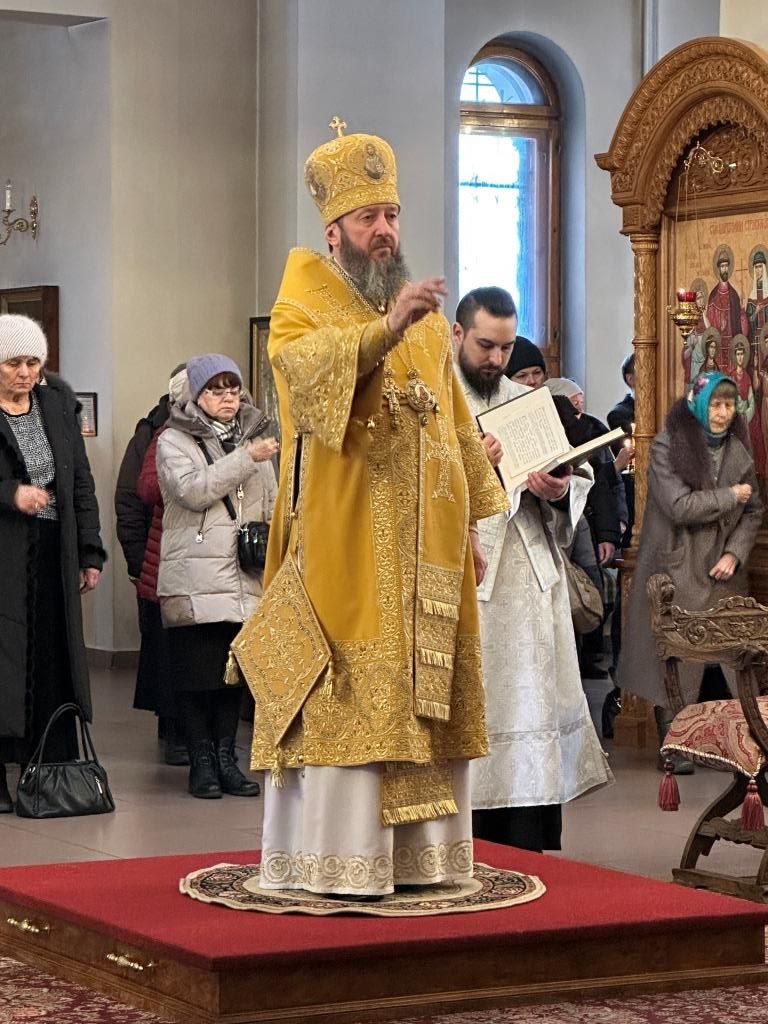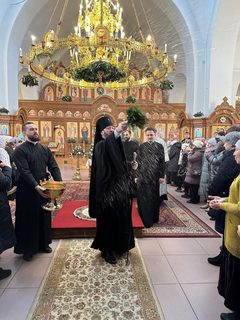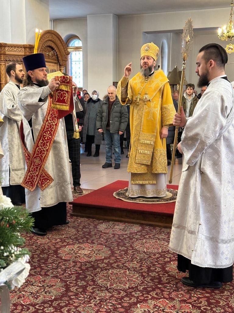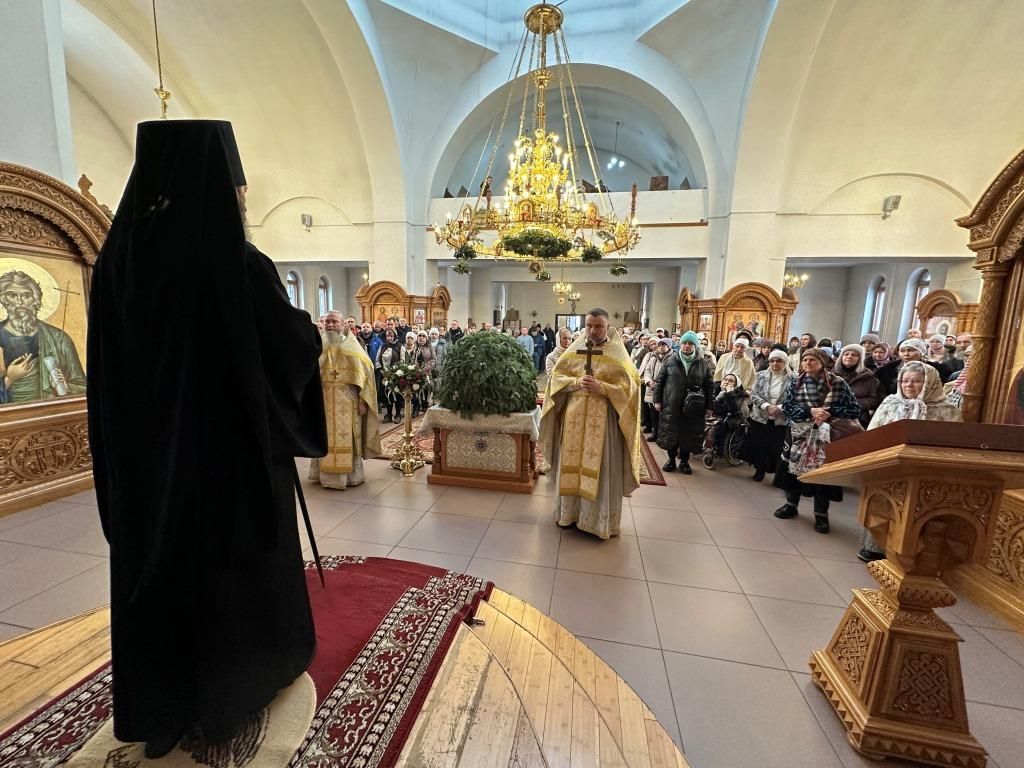 Иерарху сослужили: ключарь кафедрального собора иеромонах Никодим (Авдеев), клирики собора иерей Виталий Адаменков и иерей Константин Дьяков, протодиакон Андрей Дудник, секретарь епархии диакон Илия Кван.