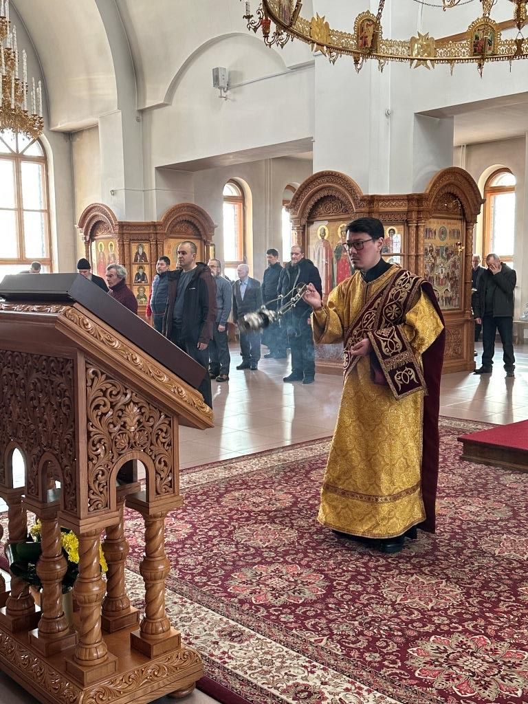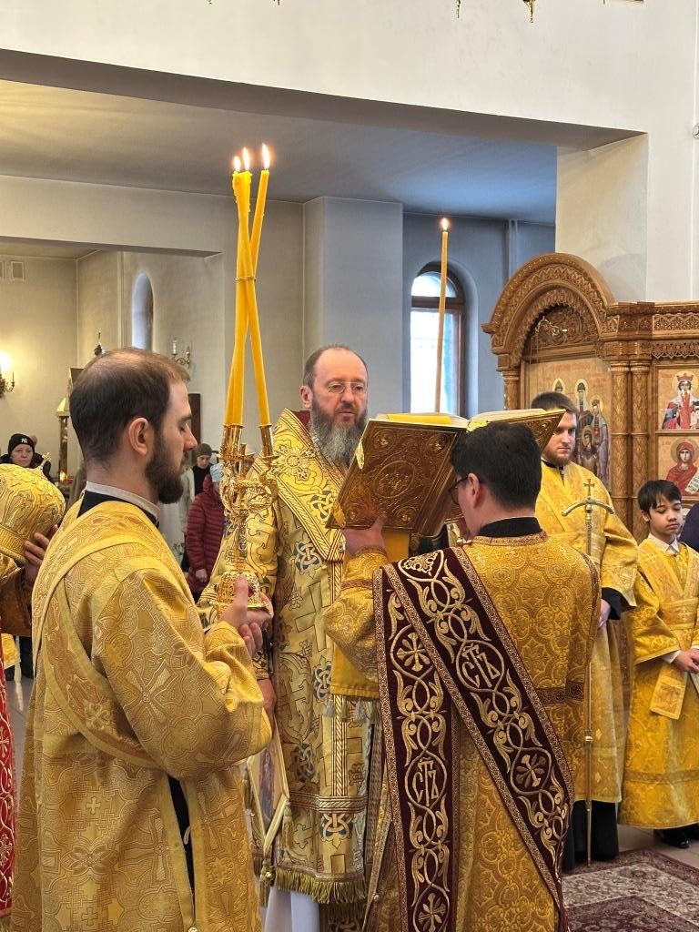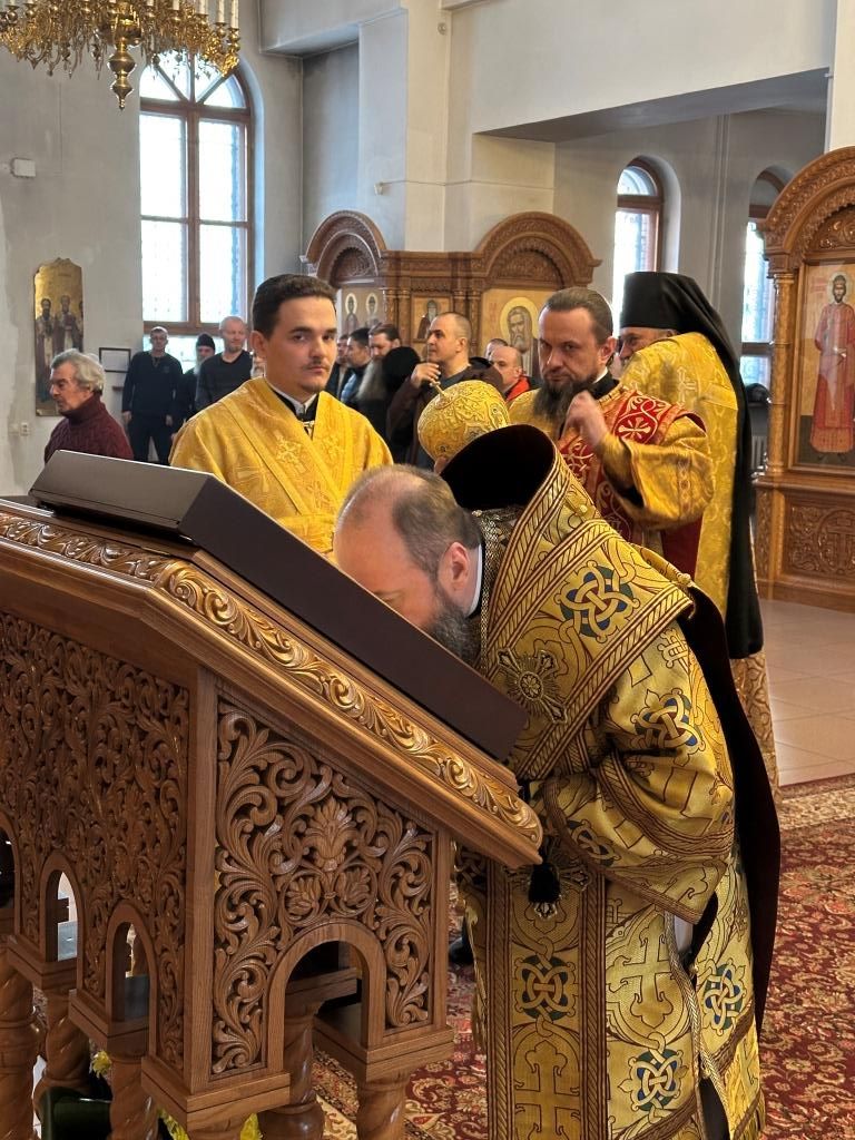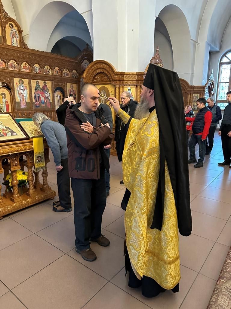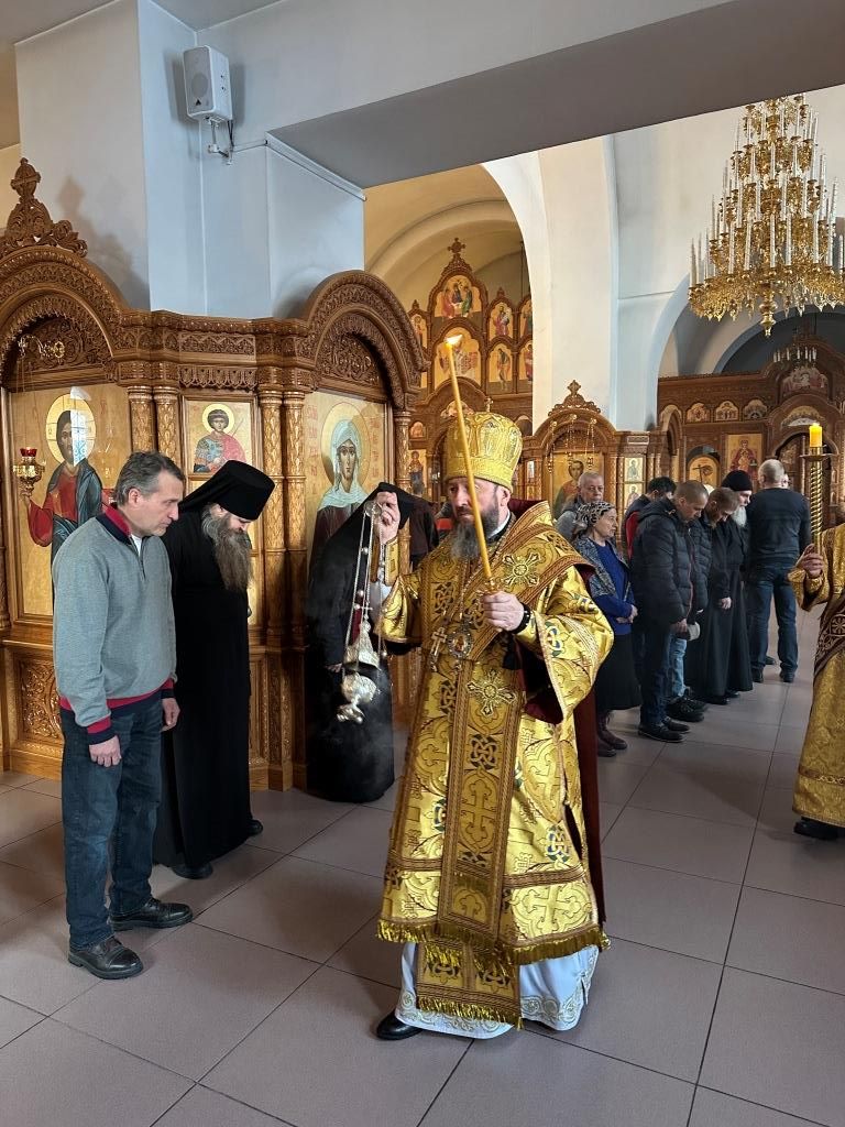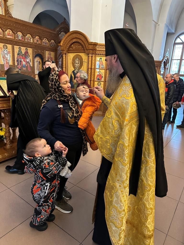 На утрене пелись особые молитвенные последования, настраивающие внимание народа Божия на грядущий Великий пост – псалом 136 «На реках Вавилонских» и стихиры Триоди «Покаяния отвези ми двери, Живодавче». После чтения воскресного евангельского зачала, архиепископ Амфилохий помазал клир и паству освященным елеем.