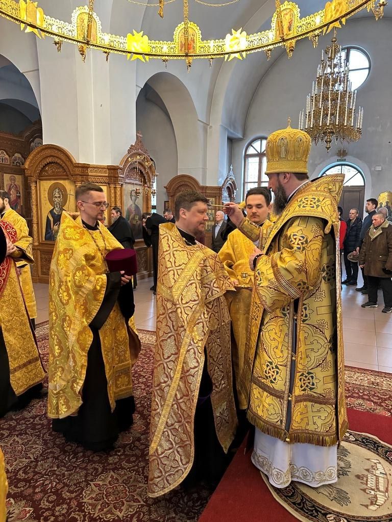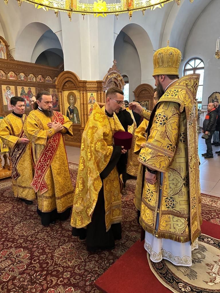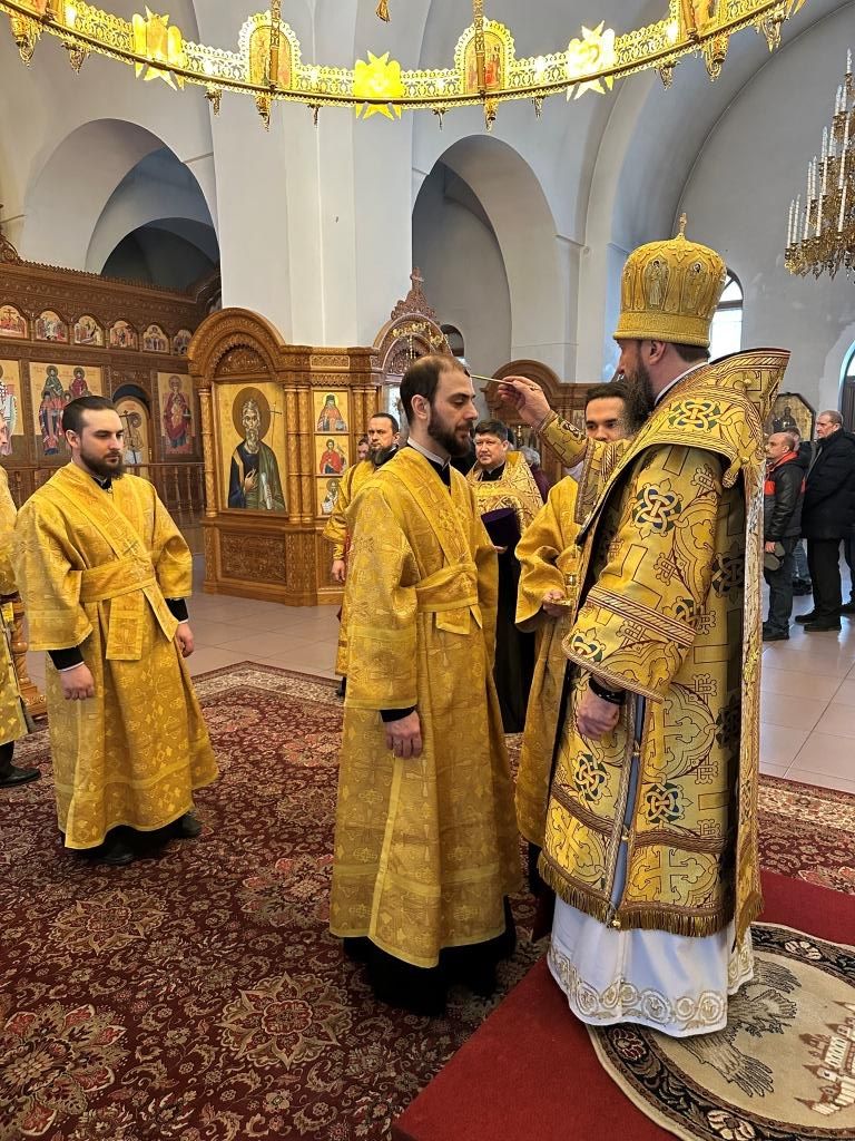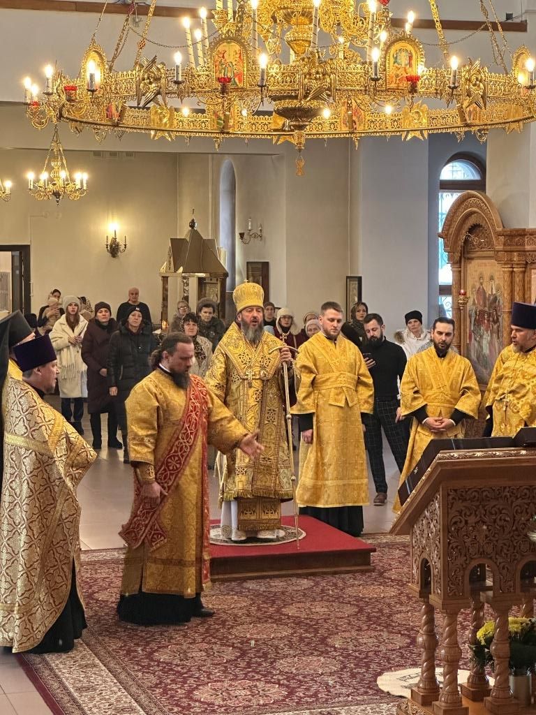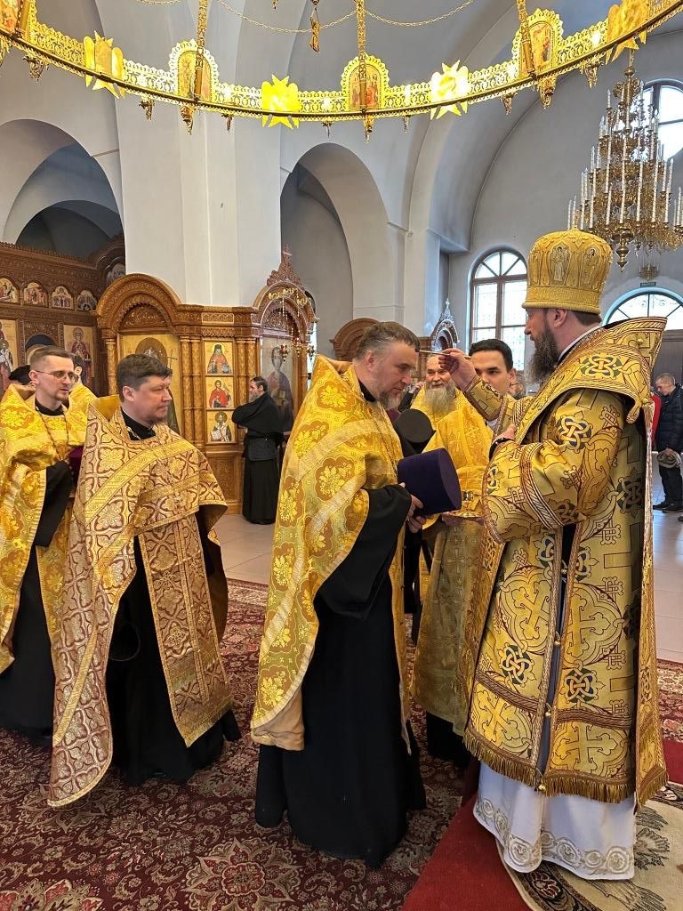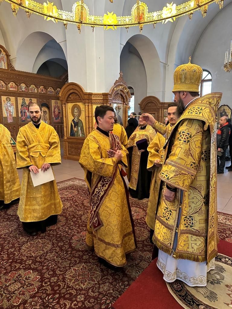Владыке архиепископу сослужили: ключарь кафедрального собора иеромонах Никодим (Авдеев), клирики собора иерей Виталий Адаменков, иерей Роман Подрезов и иерей Константин Дьяков; протодиакон Андрей Дудник, секретарь епархии диакон Илия Кван.