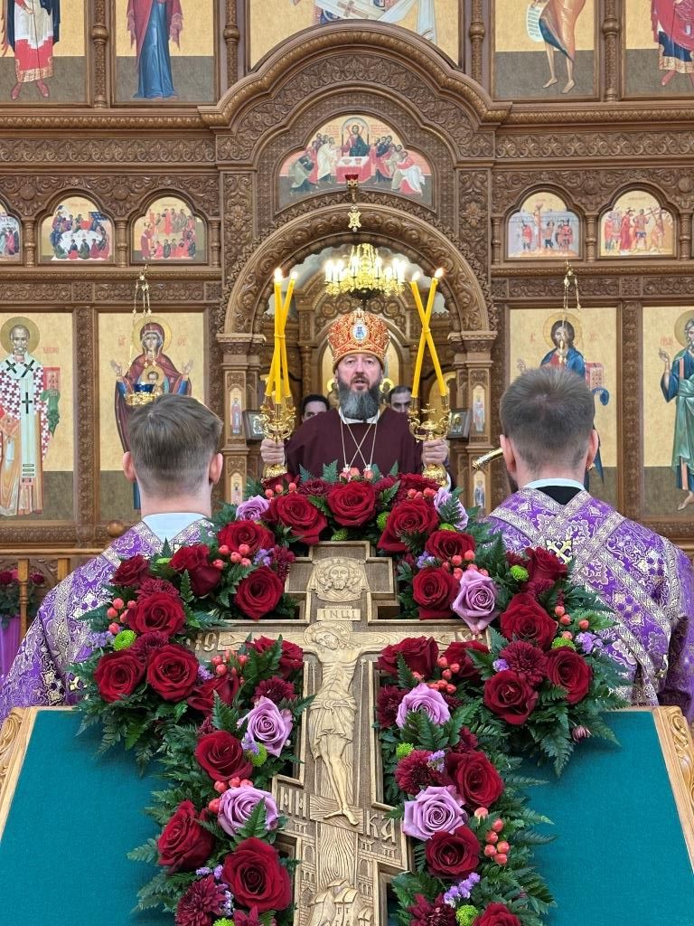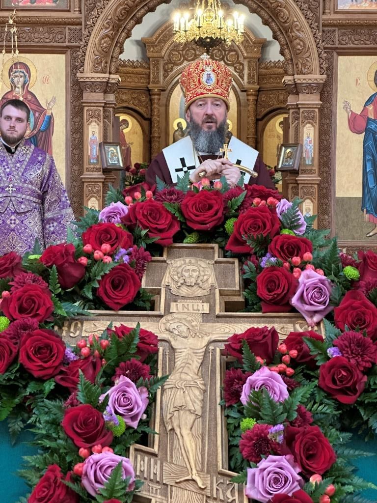 После окончания Божественной Литургии было совершено поклонение Честному Кресту Господню, затем Владыка архиепископ поздравил молящихся с праздником и обратился к народу Божию со словами поучения.