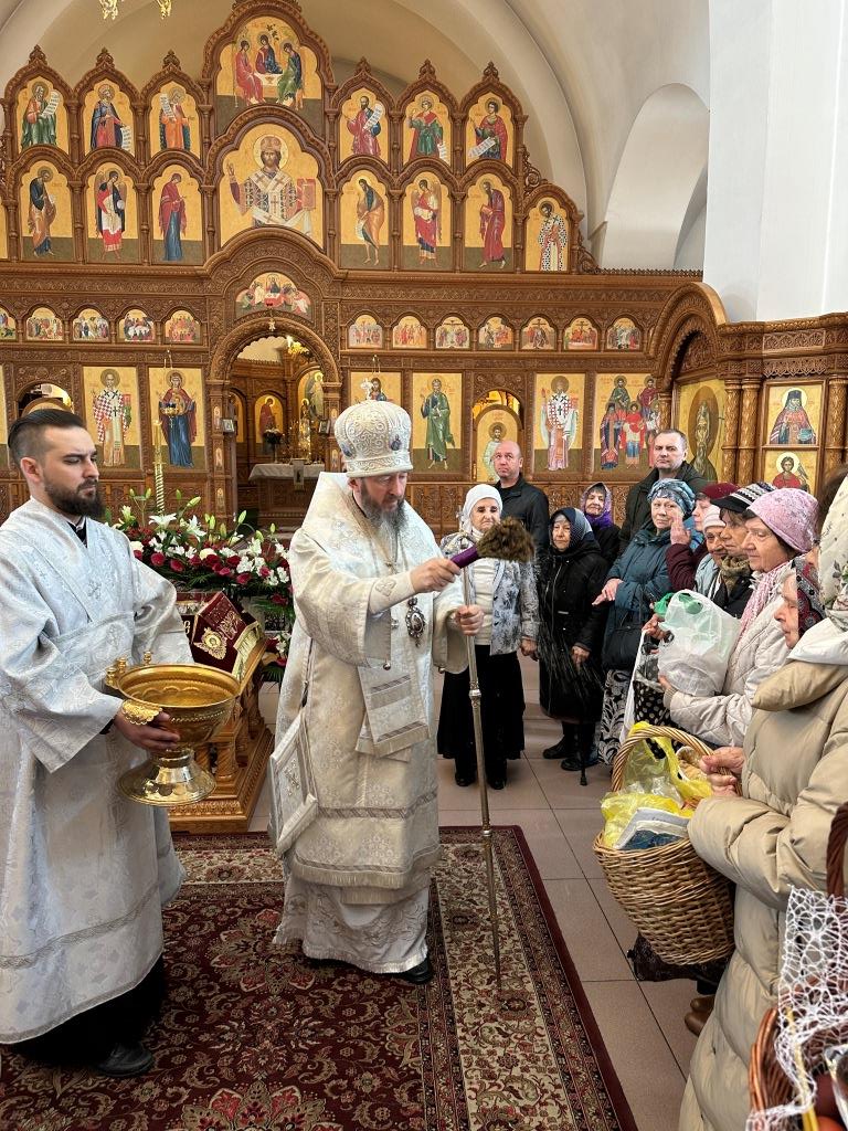 После богослужения Архипастырь призвал на молящихся Божие благословение и совершил первое освящение пасхальной снеди.