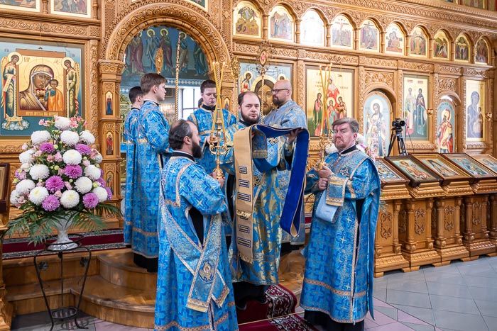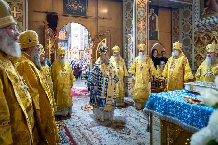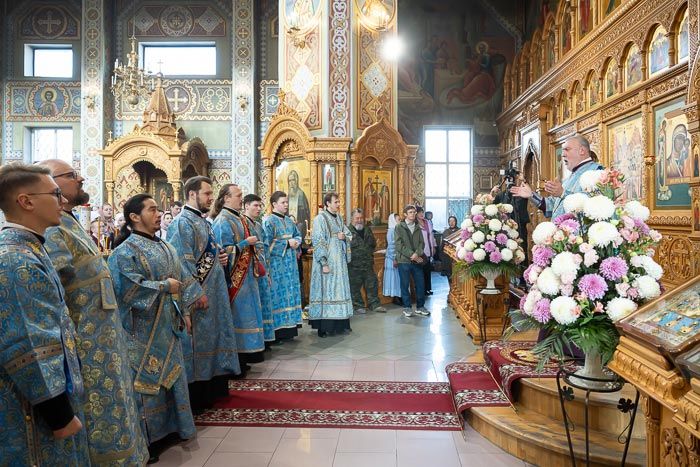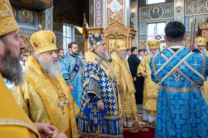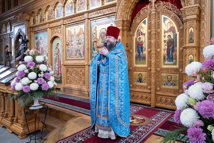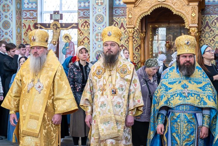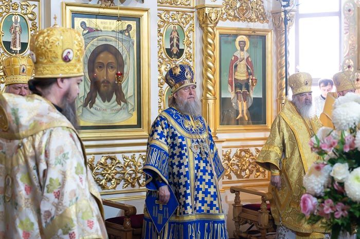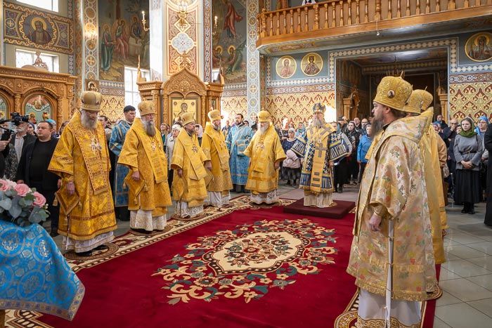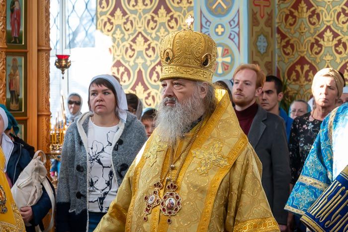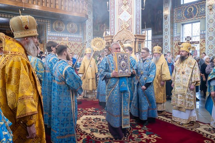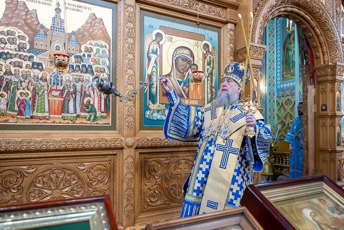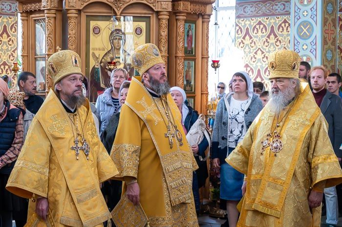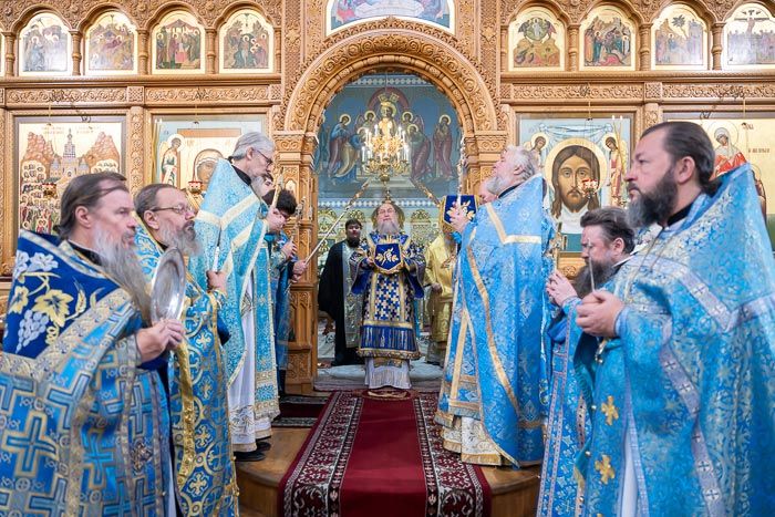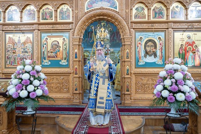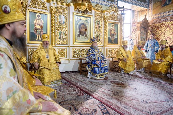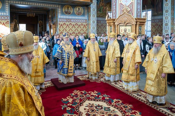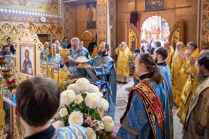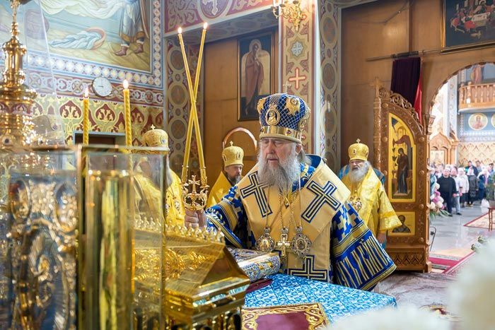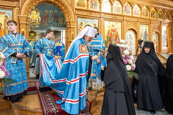 Литургия завершилась славлением Пресвятой Богородице перед ковчегом с Ее честным Поясом и Иверским образом Царицы Небесной, а также литией у гробницы митрополита Иосифа (Чернова), после чего митрополит Александр поздравил епископов, матушек игумений, духовенство и прихожан с престольным праздником и обратился к верующим со словами архипастырской проповеди.