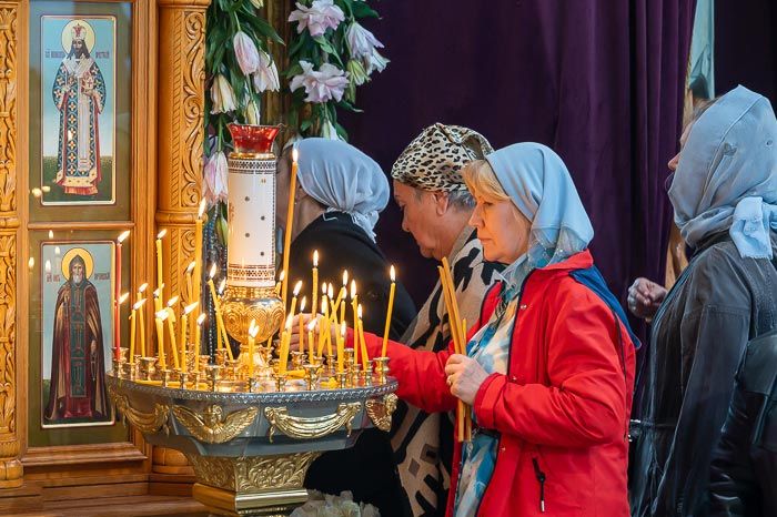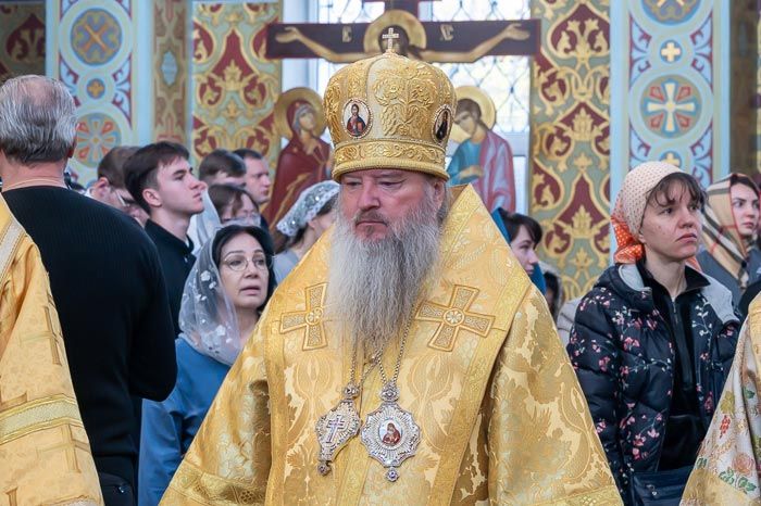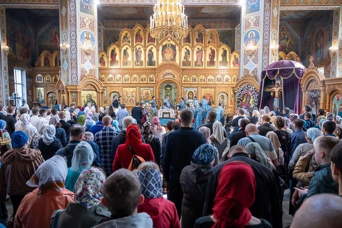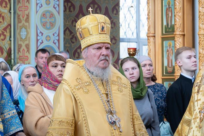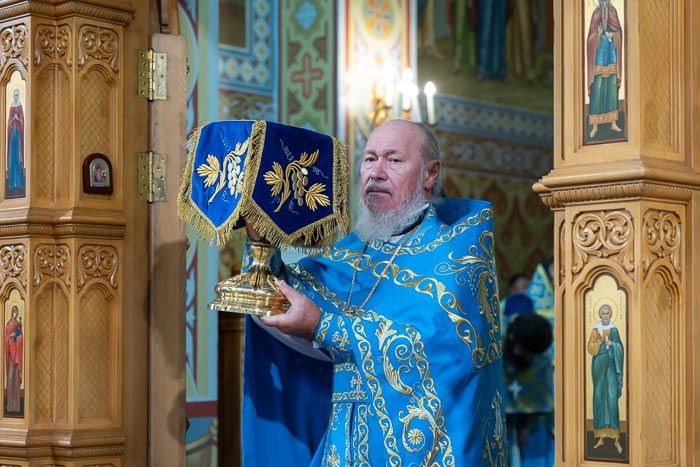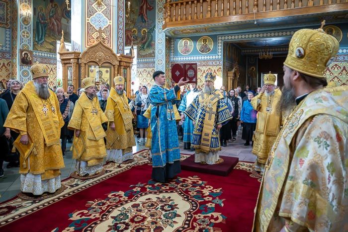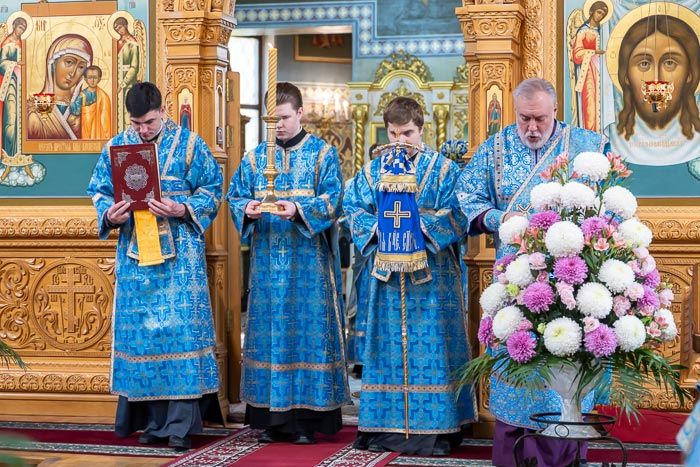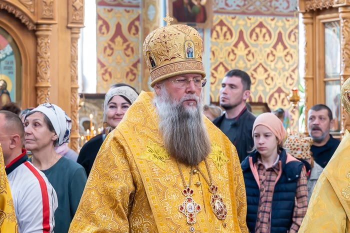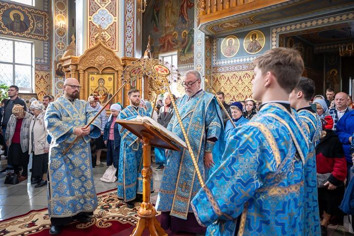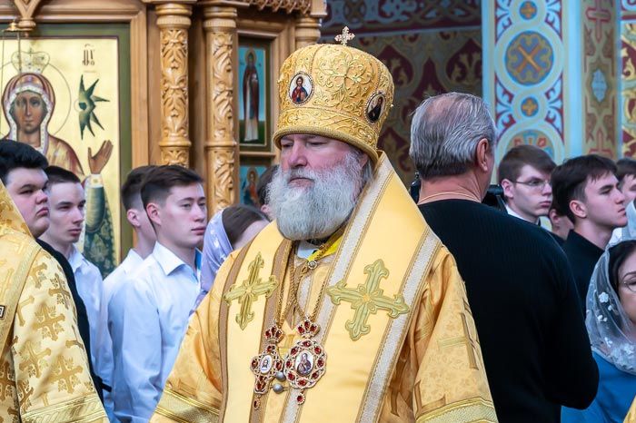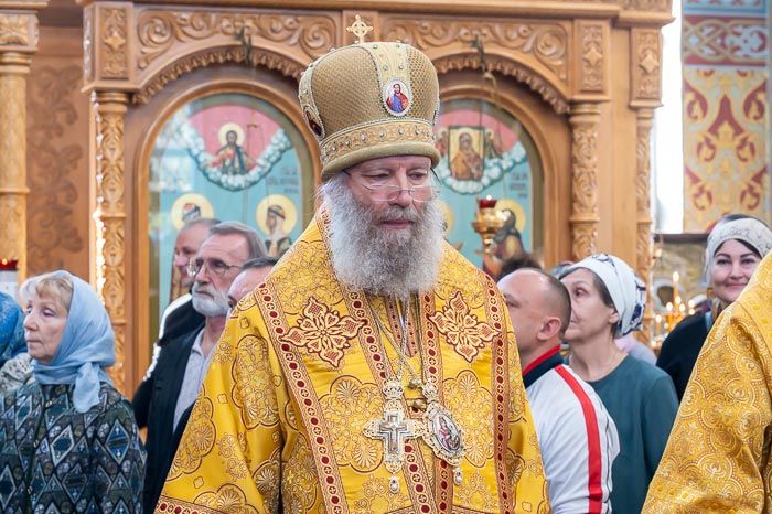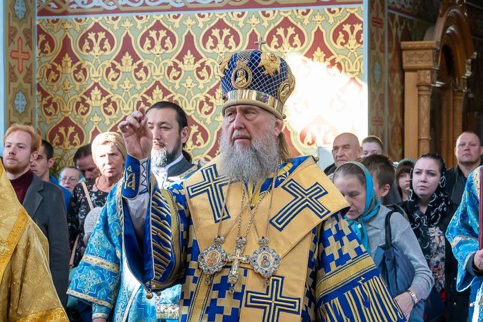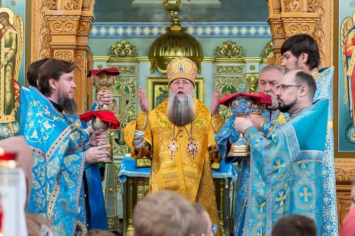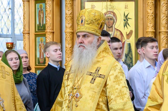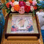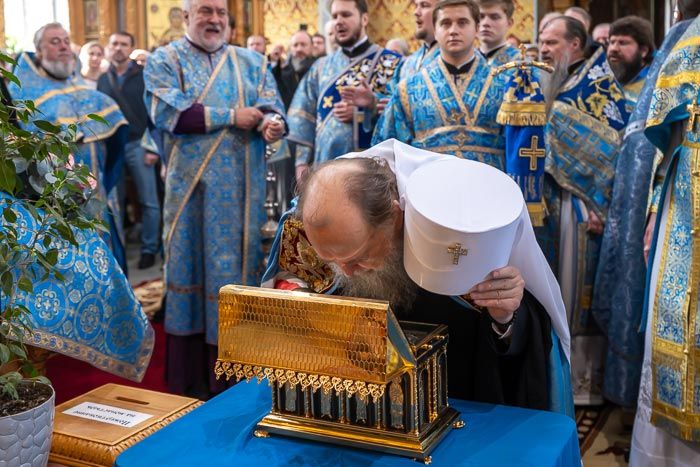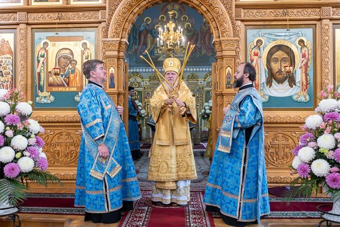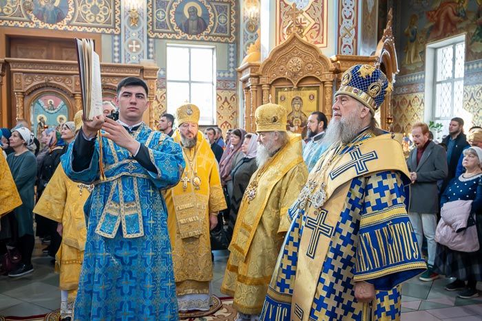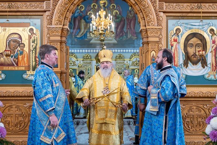 Литургия завершилась славлением Пресвятой Богородице перед ковчегом с Ее честным Поясом и Иверским образом Царицы Небесной, а также литией у гробницы митрополита Иосифа (Чернова), после чего митрополит Александр поздравил епископов, матушек игумений, духовенство и прихожан с престольным праздником и обратился к верующим со словами архипастырской проповеди.