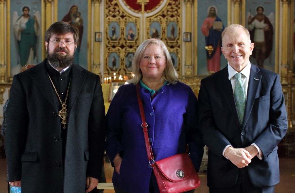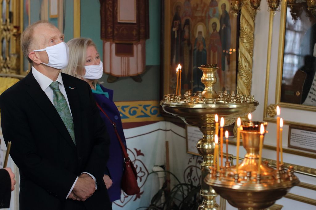 Во время экскурсии отец Сергий рассказал американскому дипломату об истории Константино-Еленинского собора, построенного в середине XIX века, и на протяжении многих десятилетий являвшегося главным духовным центром Целинограда. Перед хранящимся в соборе чтимым образом Божией Матери – Целиноградской-Почаевской иконой Пресвятой Богородицы – Уильям и Мари Мозер поставили свечи. Архимандрит Сергий поделился с гостями сведениями о жизни и трудах подвижника благочестия, ученика преподобного Севастиана Карагандинского – архимандрита Кирилла (Бородина), который в 1970-е годы основал в Целинограде при Константино-Еленинском храме женский монастырь в честь иконы Царицы Небесной «Взыскание погибших», существующий и поныне.