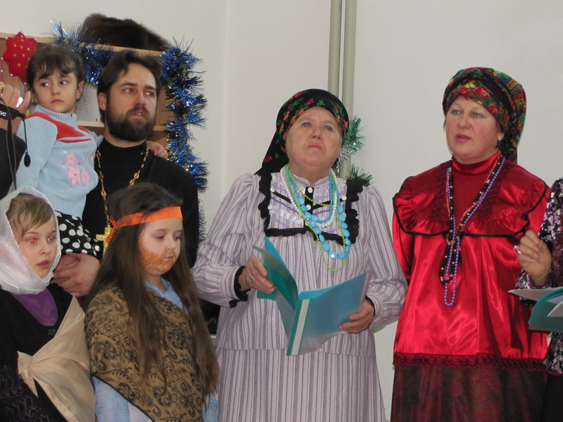 Для начала все собрались в помещении воскресной школы. Зрителей собралось столько, что просторный класс едва вместил всех желающих посмотреть первое выступление детей, которые с ноября 2011 года стали посещать воскресную школу при Стефаниевском храме. За столь короткое время дети под руководством матушки Татианы сумели разучить и Рождественский тропарь и другие различные песнопения, выучить стихи, подготовить Рождественскую сценку, смастерить костюмы при поддержке родителей, украсить класс и красавицу-елочку игрушками и поделками собственного изготовления.
