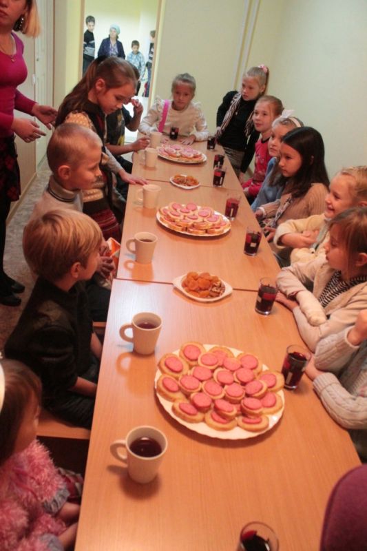 Затем в школьной трапезной покормили обедом малышей, так как они терпеливо отстояли Литургию и причастились Святых Христовых Таин, а после первого-второго урока пообедали ребята постарше.