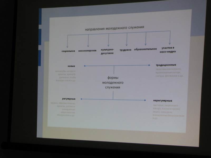 В ходе занятия обсуждались различные вопросы: что такое молодежное служение, какие направления и формы молодежного служения целесообразнее использовать с воцерковленной и невоцерковленной молодежью, как организовать деятельность на приходе, с какими трудностями придется столкнуться и как их преодолеть, как помочь молодому человеку или девушке найти себя в этом мире, выбрать верную дорогу в жизни, раскрыть свои таланты и способности, которыми наделил их Господь, и многое другое.