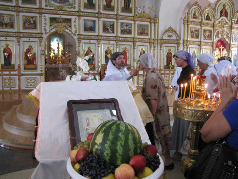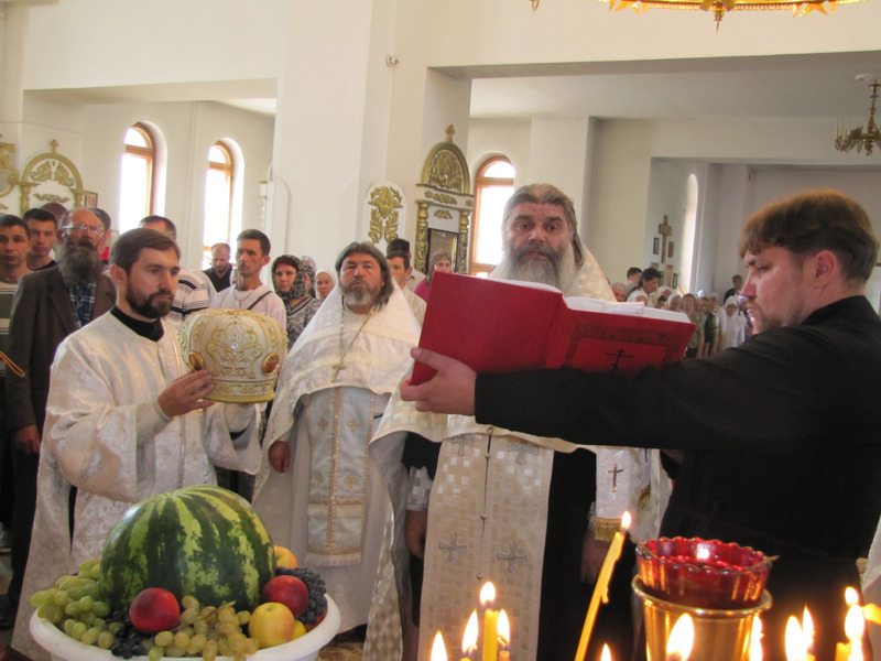 Затем совершил освящение овощей и фруктов нового урожая, окропив святой водой принесенные прихожанами плоды.