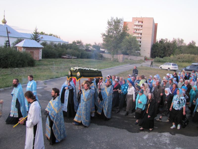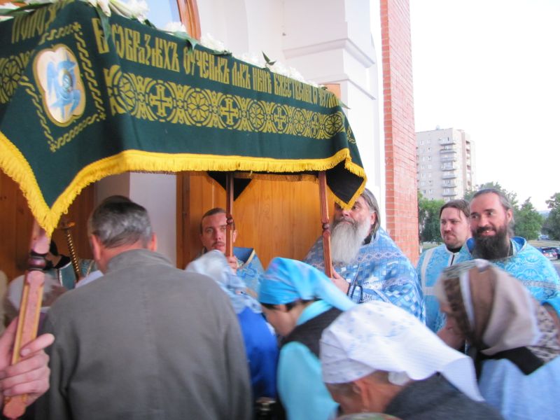 Во время торжественного богослужения под перезвон колоколов и умилительное пение вокруг собора был совершен крестный ход с изнесением плащаницы, на которой изображено Успение Божией Матери.
