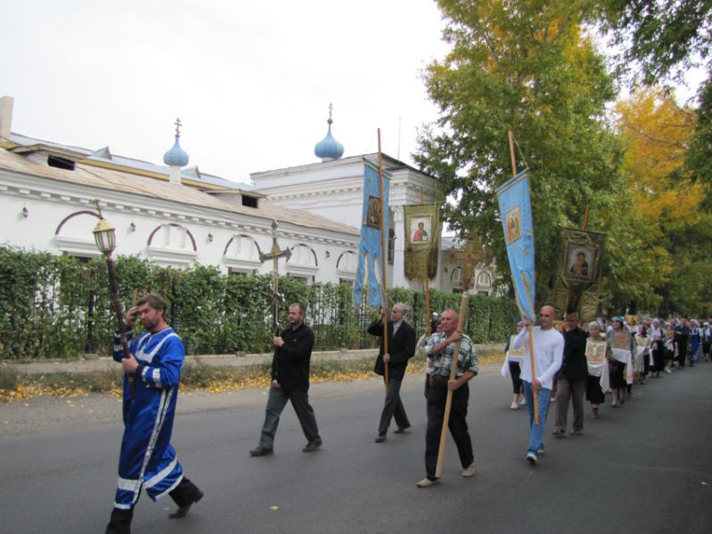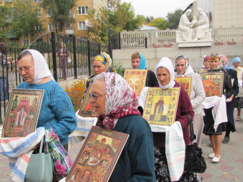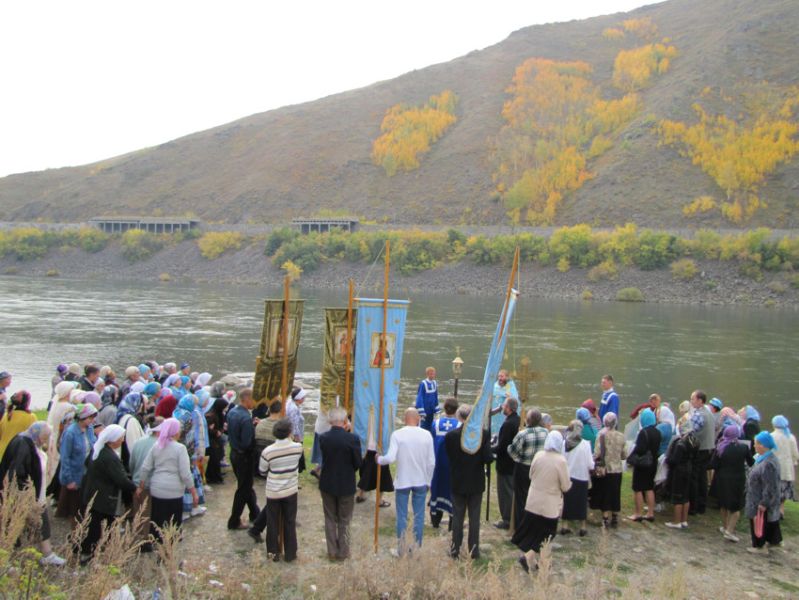 Неся впереди хоругви, иконы и ковчег со святыми мощами святых преподобных Оптинских старцев и вознося молитвы ко Господу и Пресвятой Богородице, многолюдная процессия православных христиан вместе с отцом настоятелем Евгением Ягановым прошла Крестным ходом от Богородице-Рождественского храма по улице Островского к берегу Иртыша, где было совершено освящение водного естества.