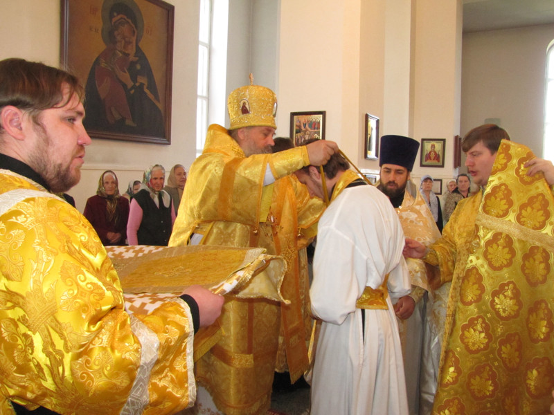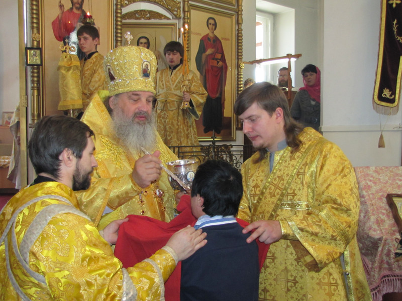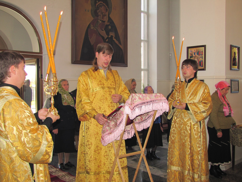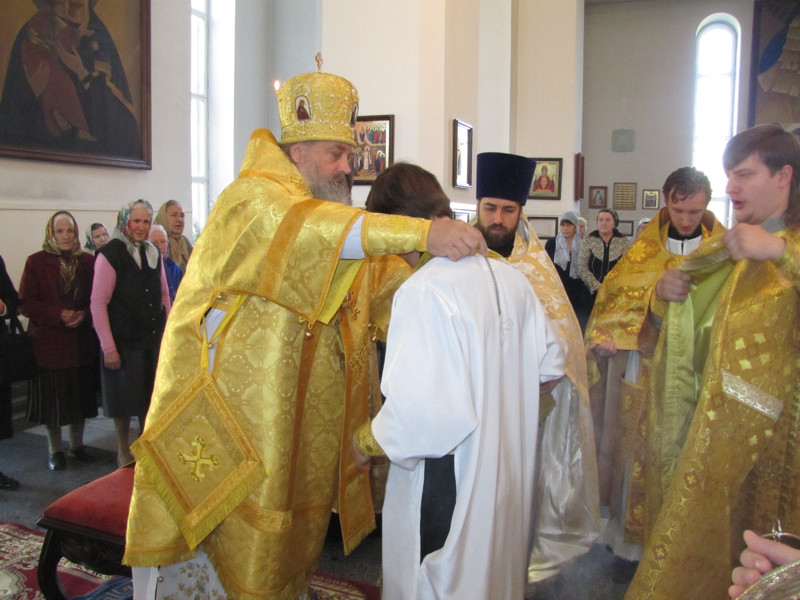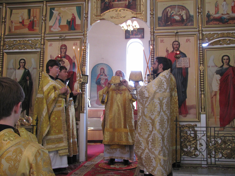 На Малом входе епископ Варнава удостоил права ношения набедренника: настоятеля Михайло-Архангельского храма пос. Шульбинск иерея Антония Плотникова и настоятеля Богородице-Рождественского храма пос. Асу-Булак иерея Романа Подрезова.