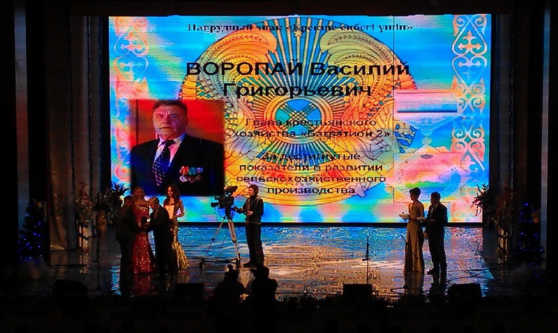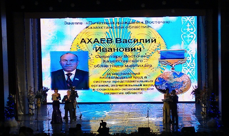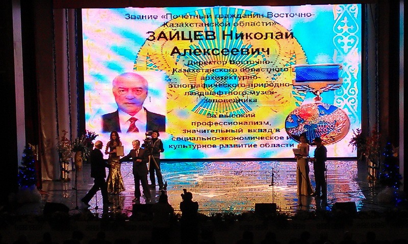 На предновогоднем вечере аким ВКО Бердыбек Сапарбаев поздравил всех восточноказахстанцев с наступающим новым 2012 годом, а затем наградил нагрудными значками и юбилейными медалями достойных жителей нашего города и области, и среди них: секретаря Восточно-Казахстанского областного маслихата Василия Ивановича Ахаева, главу крестьянского хозяйства «Багратион» Василия Григорьевича Воропая, директора Восточно-Казахстанского областного архитектурно-этнографического природно-ландшафтного музея-заповедника Николая Алексеевича Зайцева.
