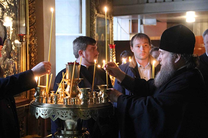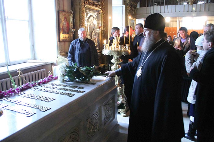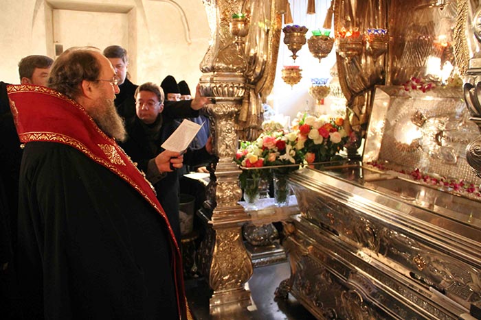 В Покровском ставропигиальном женском монастыре митрополит Александр совершил славление перед честными и многоцелебными мощами блаженной старицы Матроны Московской. После богослужения архипастырь помазал казахстанских паломников освященным елеем от неугасимой лампады над ракой святой.