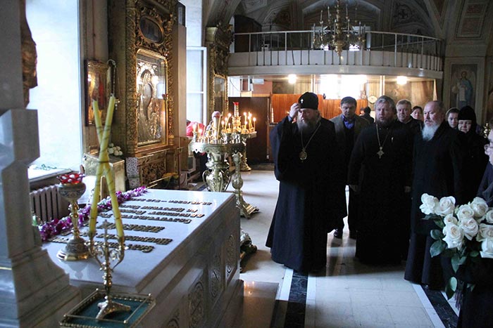 Члены делегации сотворили заупокойную молитву у гробницы приснопамятного Святейшего Патриарха Алексия II и возложили к месту упокоения иерарха букеты цветов.
