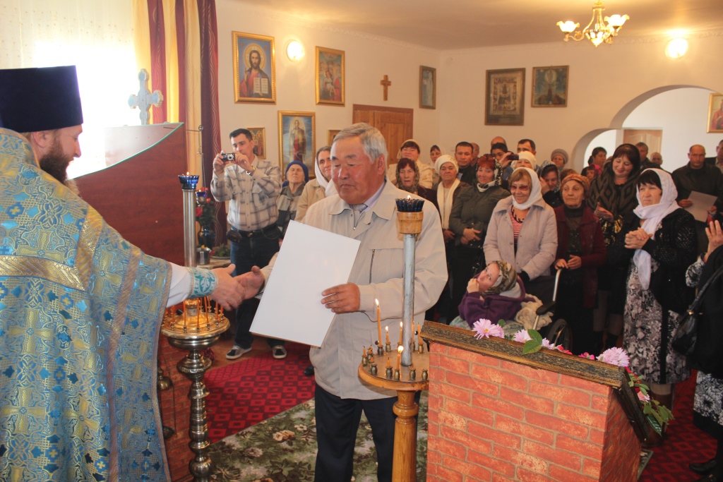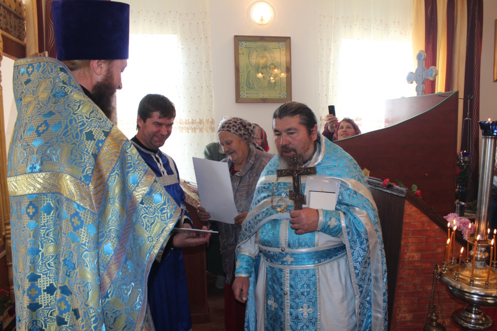 По окончании Божественной Литургии иерей Евгений Яганов, за труды на благо Русской Православной Церкви на Казахстанской земле, вручил священнику Николаю Темирбаеву медаль «В память 140-летия основания Туркестанской епархии», поздравил отца-настоятеля и прихожан, огласив Послание правящего Архиерея – епископа Усть-Каменогорского и Семипалатинского Амфилохия, по случаю Престольного торжества Свято-Покровского храма, села Самарское. Также отец Евгений вручил Архиерейские грамоты более чем 20 прихожанам – благотворителям и благоукрасителям храма, призвав всех и далее прилагать свои труды по благоустройству и обновлению Покровского храма и к внутреннему обновлению храма своей души.